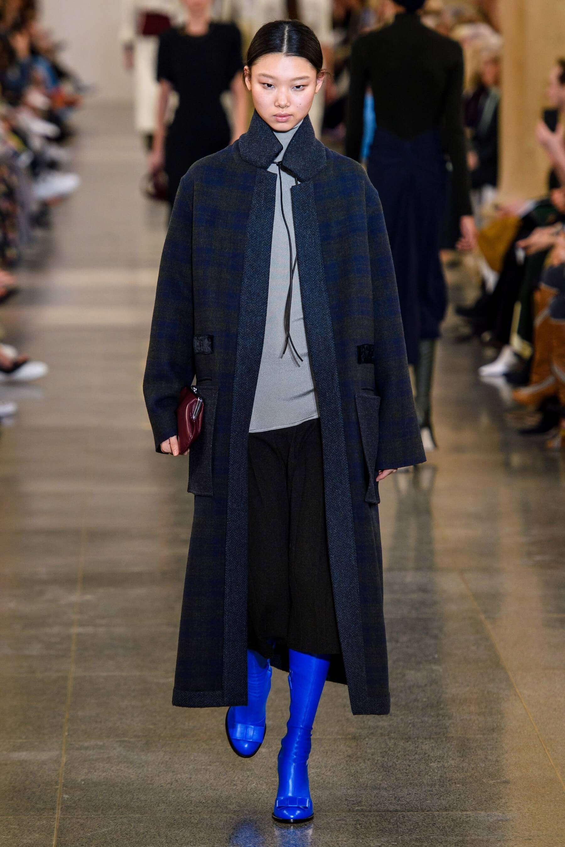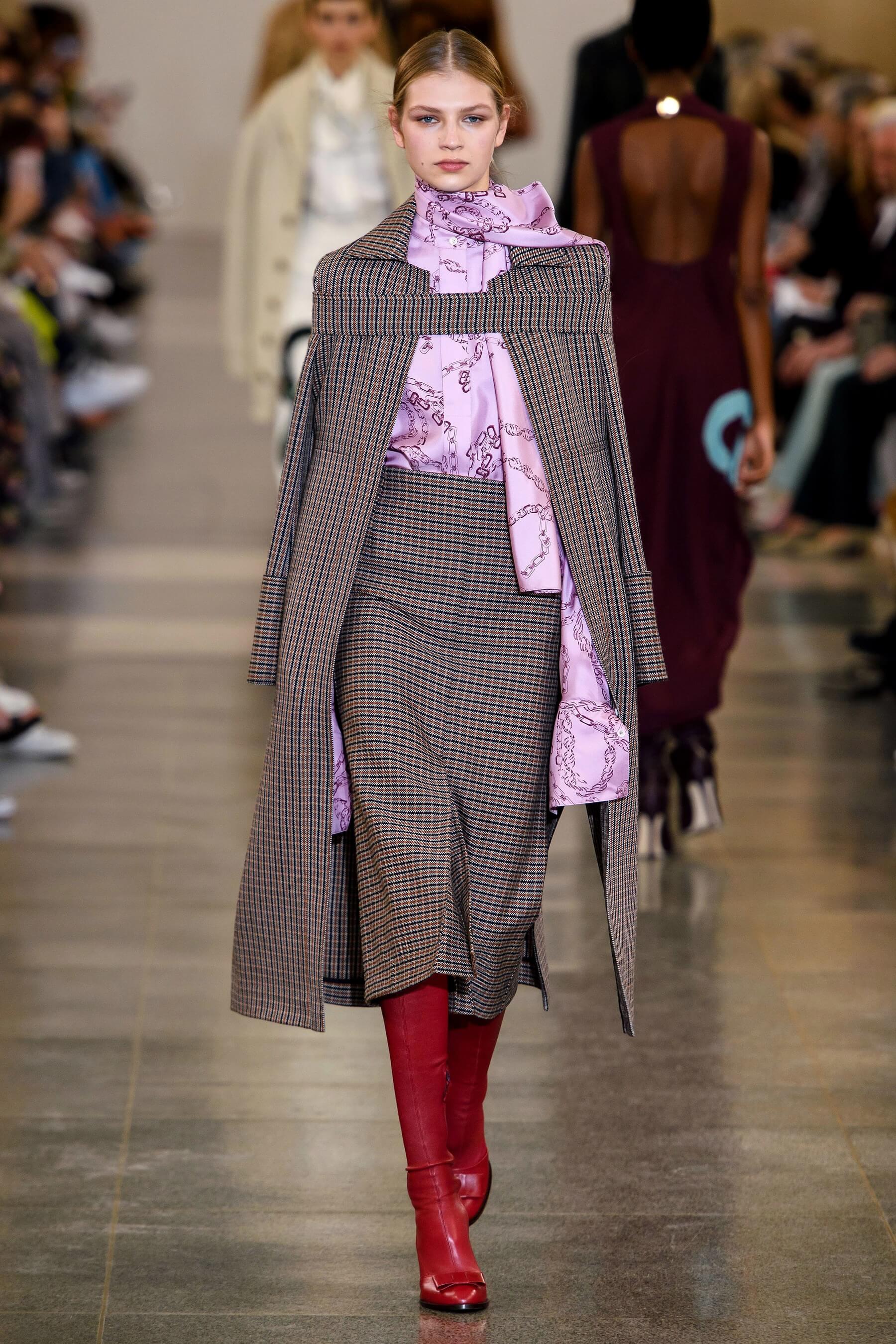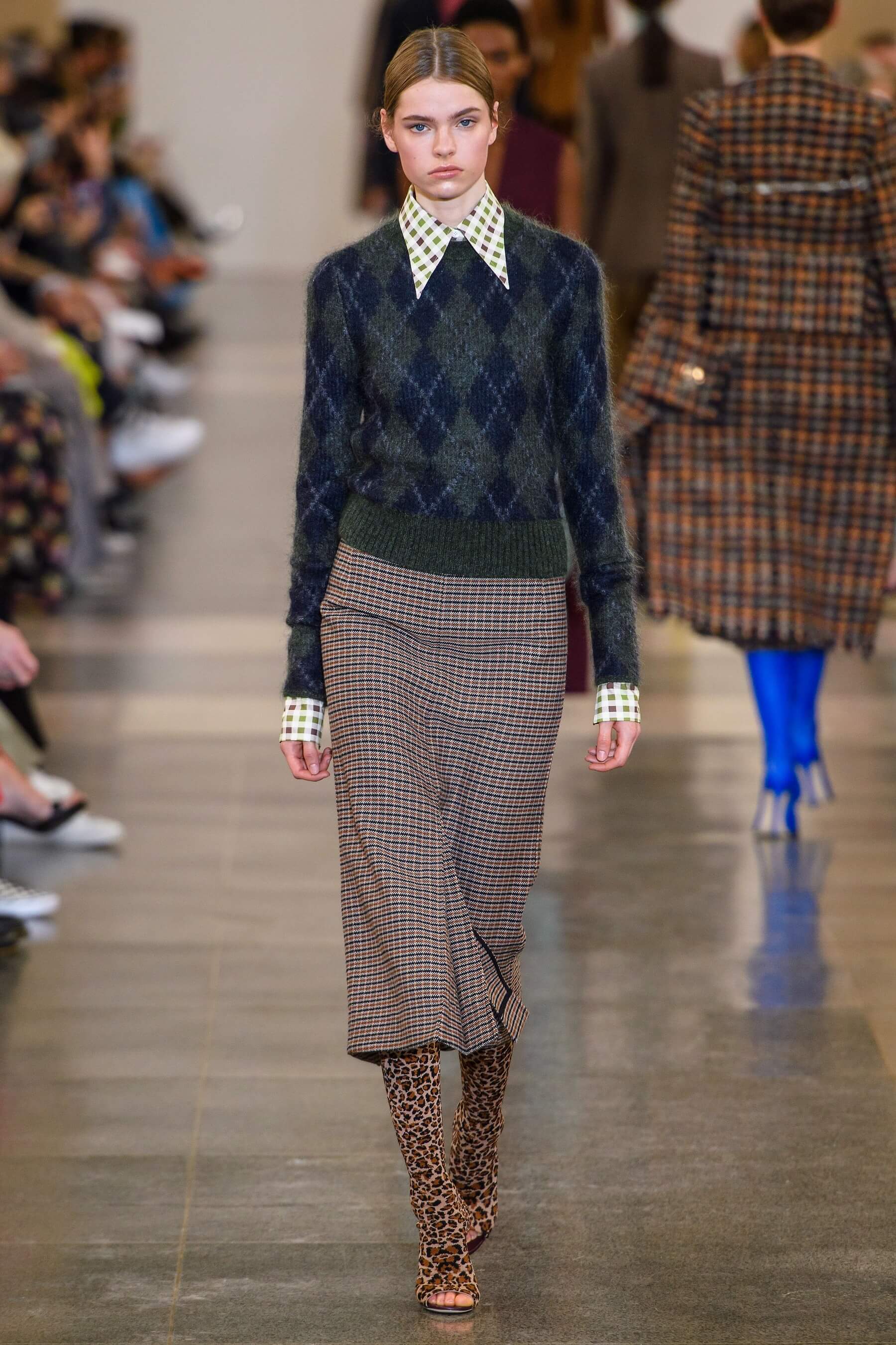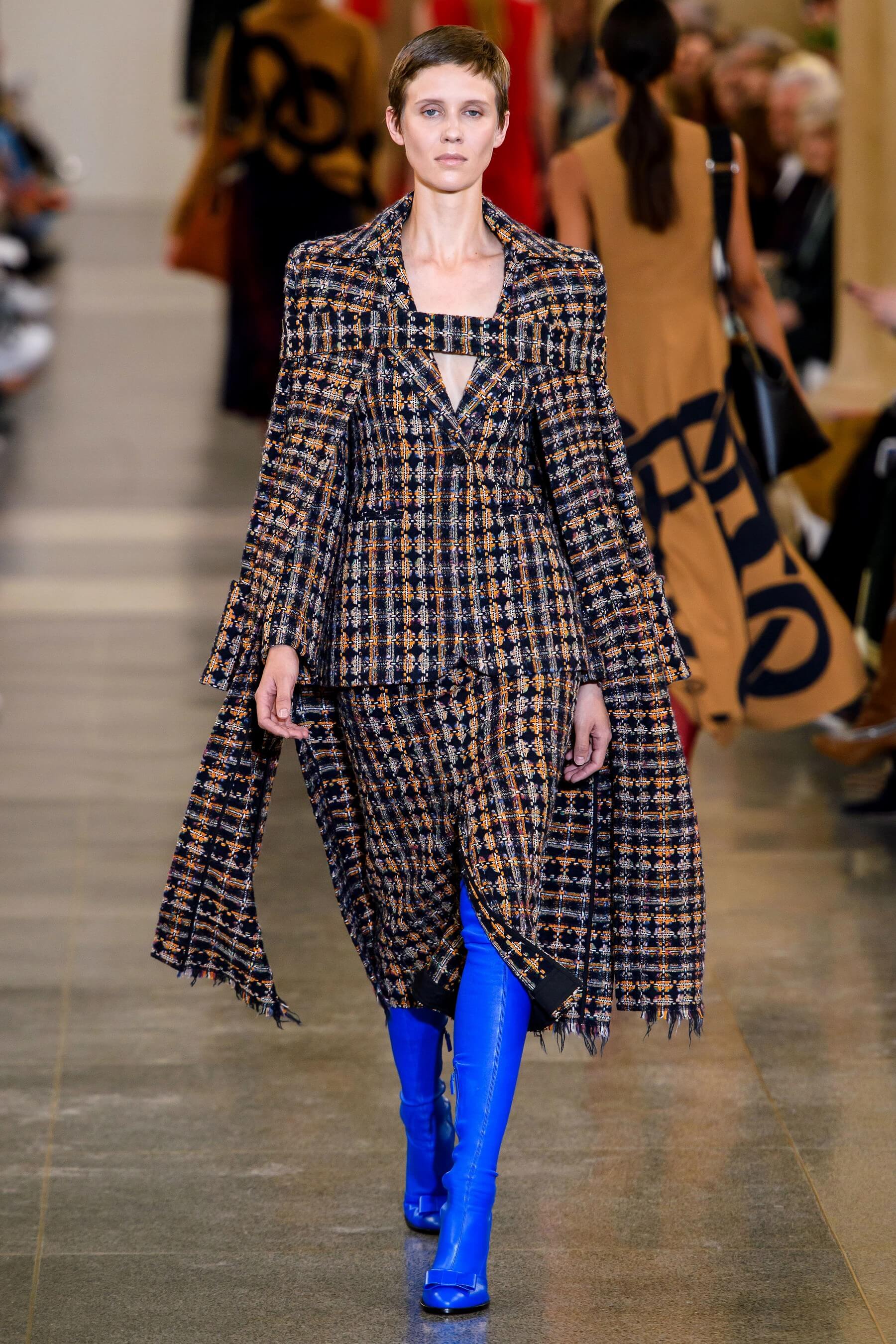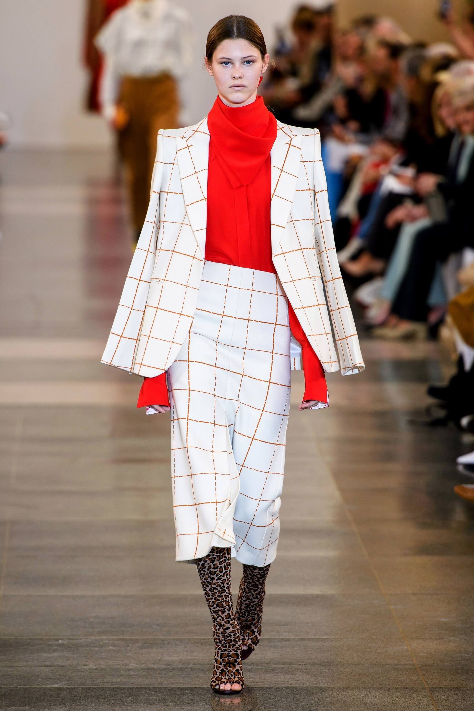 Струящиеся бежевые брюки, неоново-желтые лодочки и обилие удлиненных жакетов и пальто в клетку на показе Виктории Бекхэм дополнили клетчатые блузы с острыми отложными воротниками, мохеровые джемперы — всё как в 70-е, только лучше. Клетка — от пунктирной до классической мелкой "аргайл" — и горячий оранжево-красный оттенок стали главными элементами очередной и, как всегда, удачной работы Виктории на тему базового гардероба современной женщины. Для вечерних образов в коллекции также нашлось место — на подиуме появлялись модели в минималистичных черных платьях.