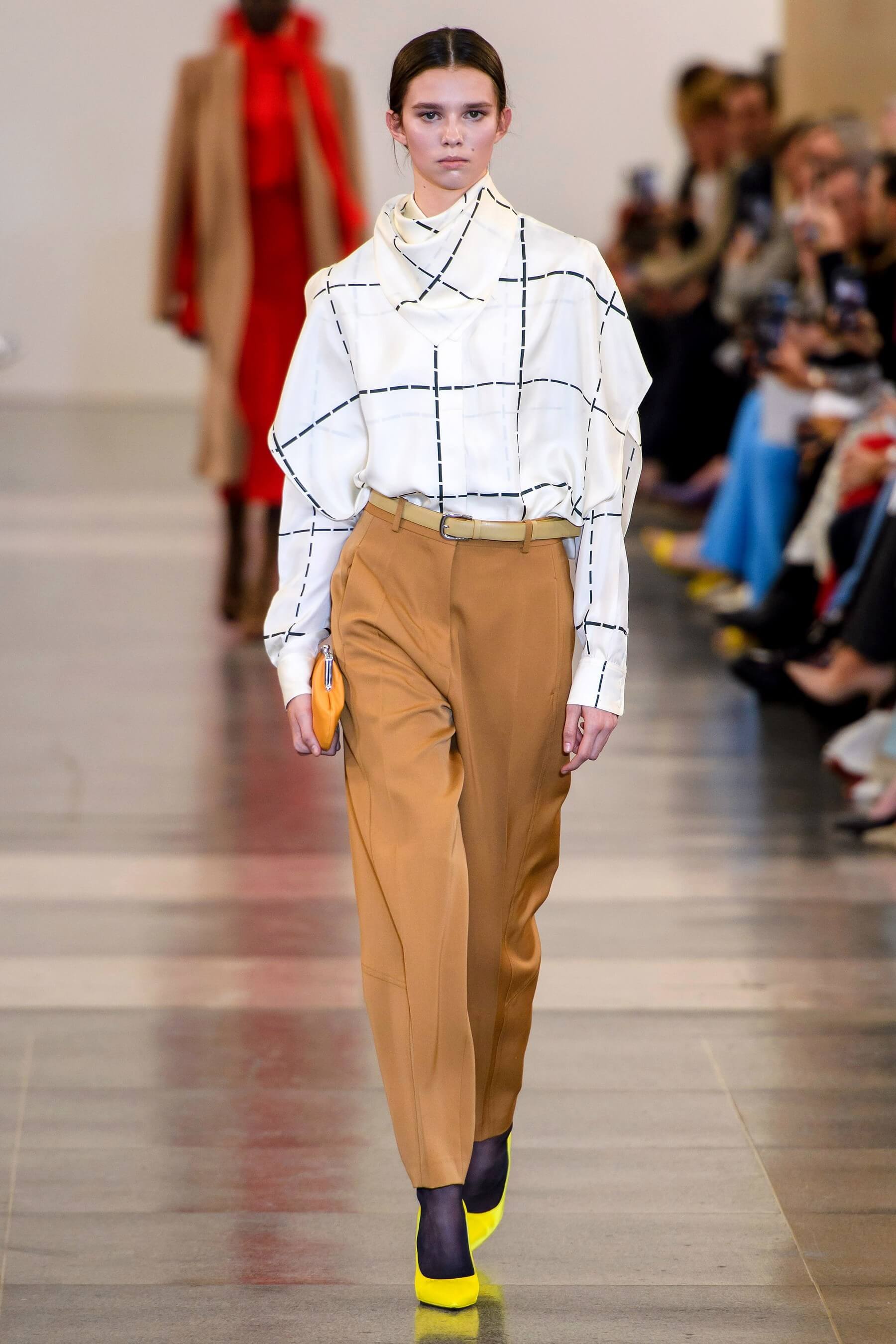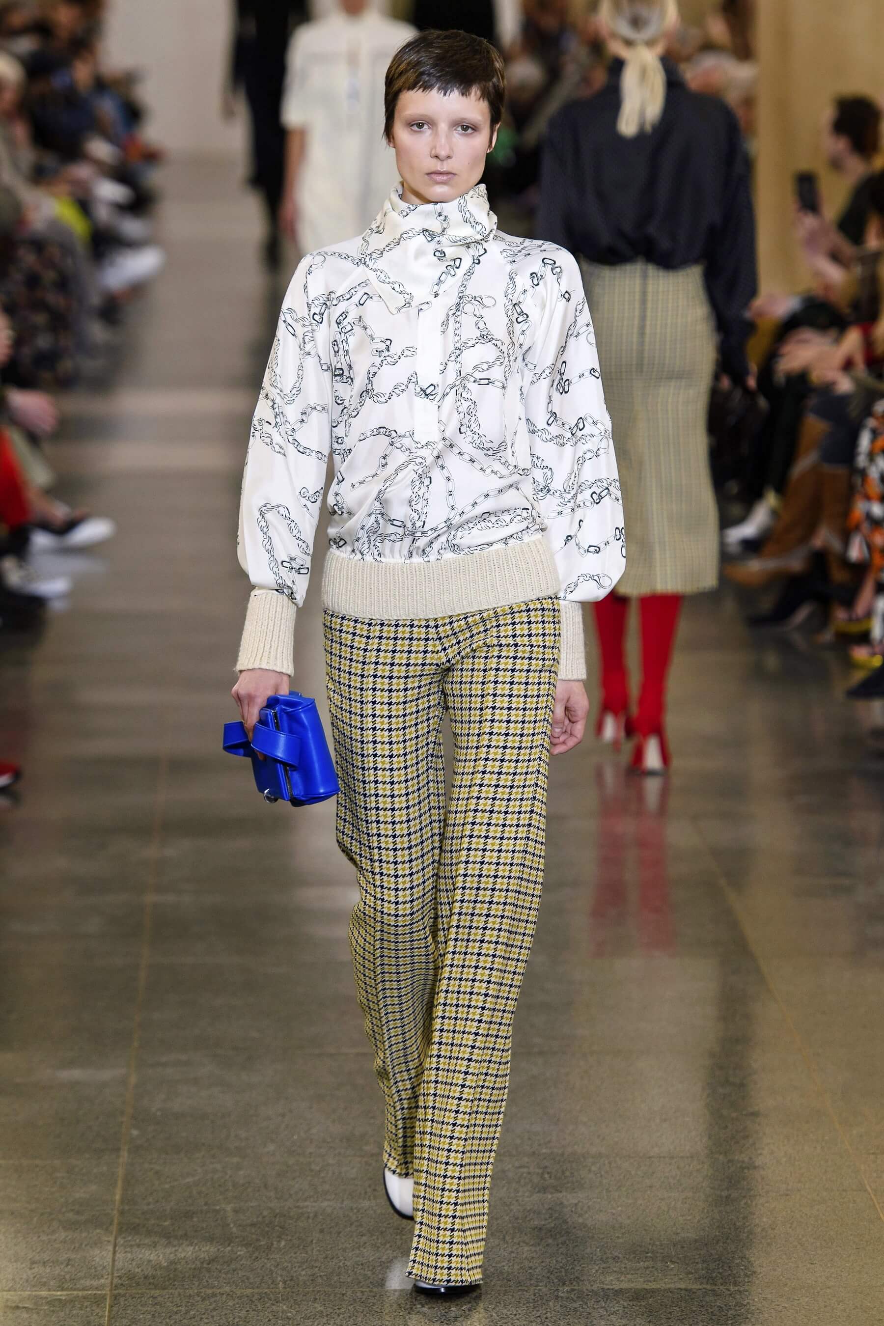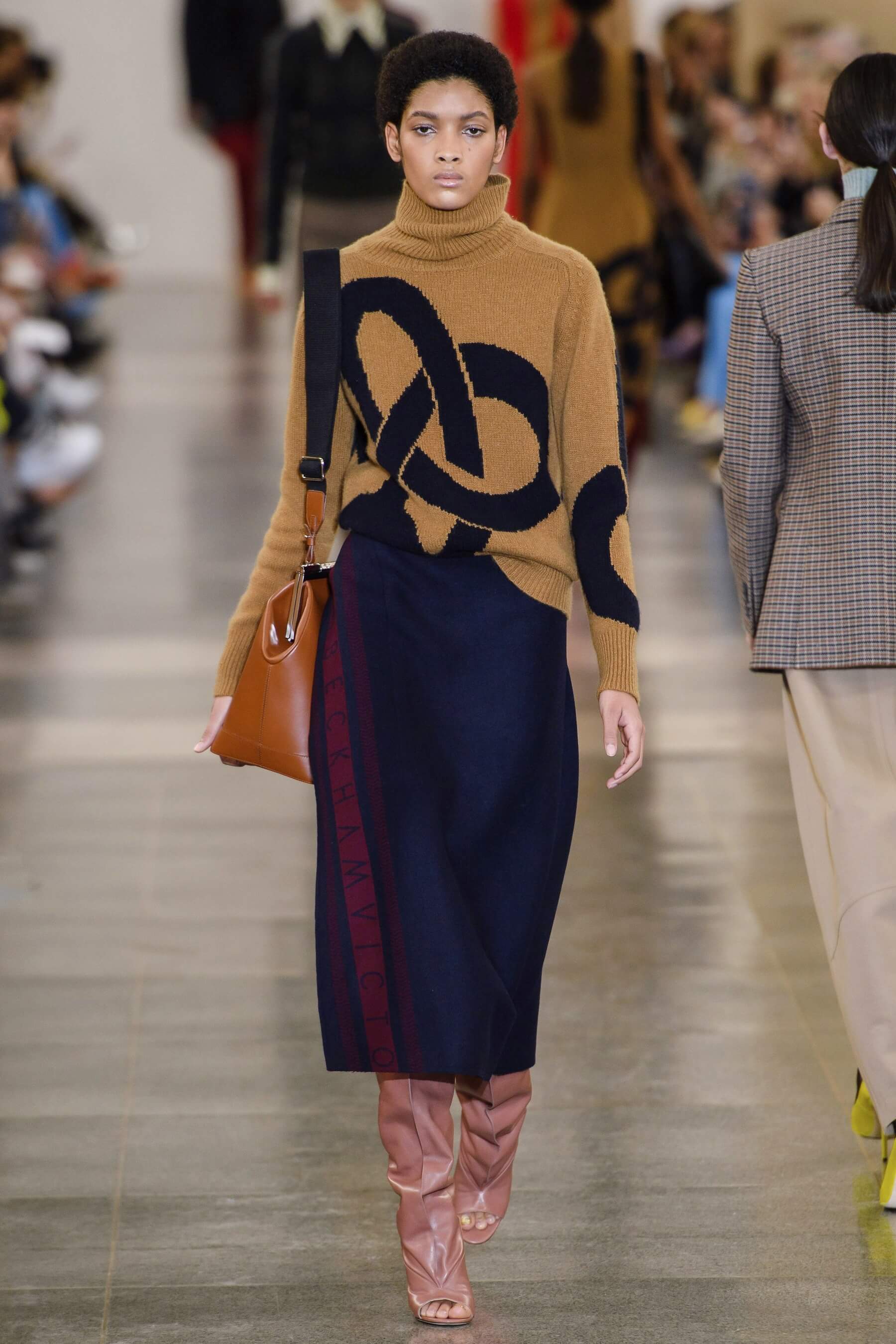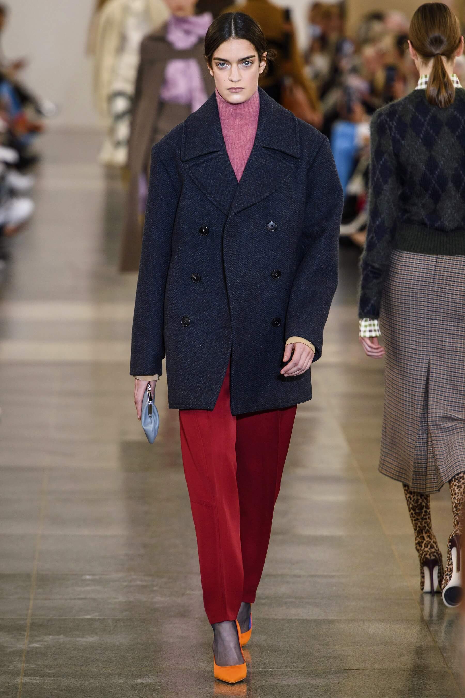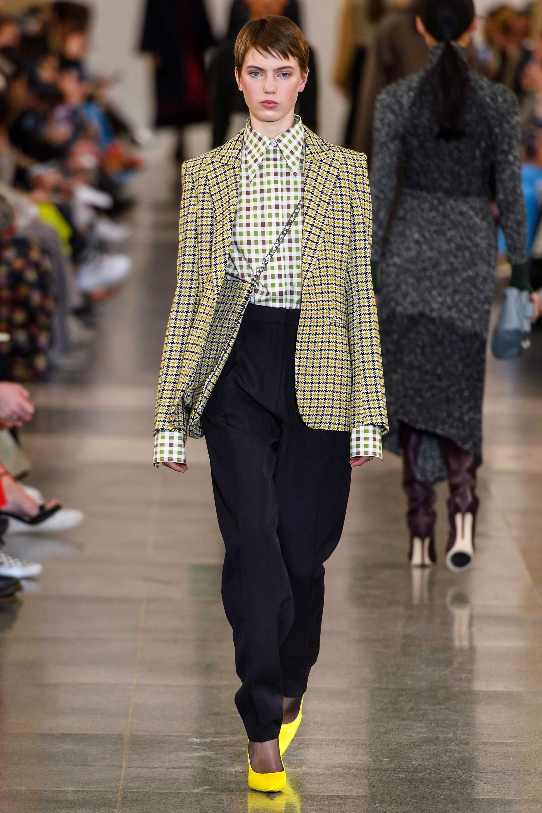 Струящиеся бежевые брюки, неоново-желтые лодочки и обилие удлиненных жакетов и пальто в клетку на показе Виктории Бекхэм дополнили клетчатые блузы с острыми отложными воротниками, мохеровые джемперы — всё как в 70-е, только лучше. Клетка — от пунктирной до классической мелкой "аргайл" — и горячий оранжево-красный оттенок стали главными элементами очередной и, как всегда, удачной работы Виктории на тему базового гардероба современной женщины. Для вечерних образов в коллекции также нашлось место — на подиуме появлялись модели в минималистичных черных платьях.