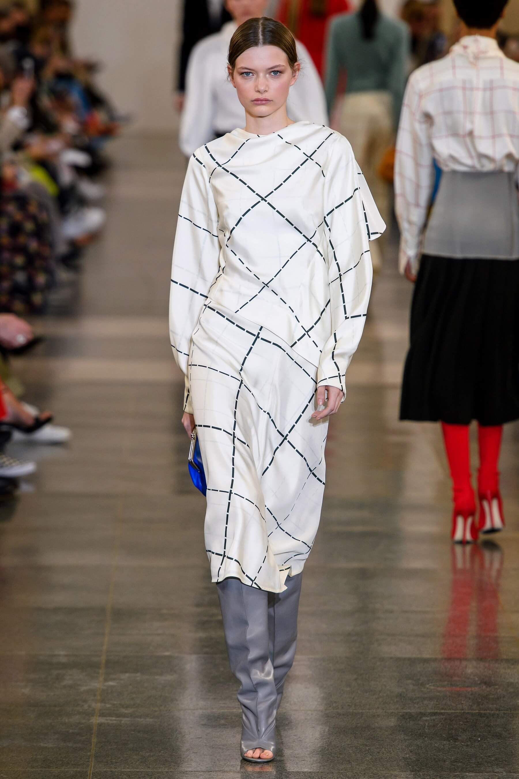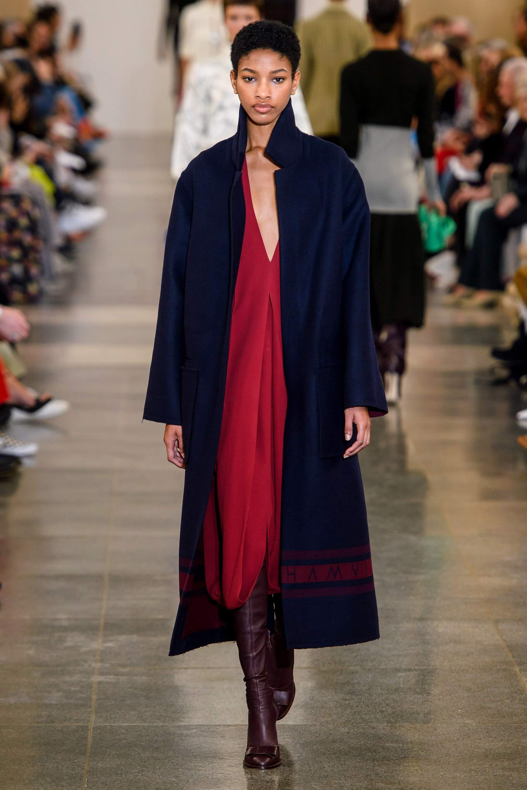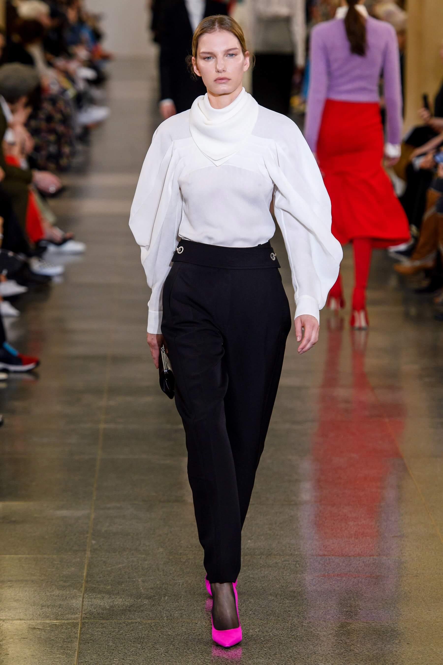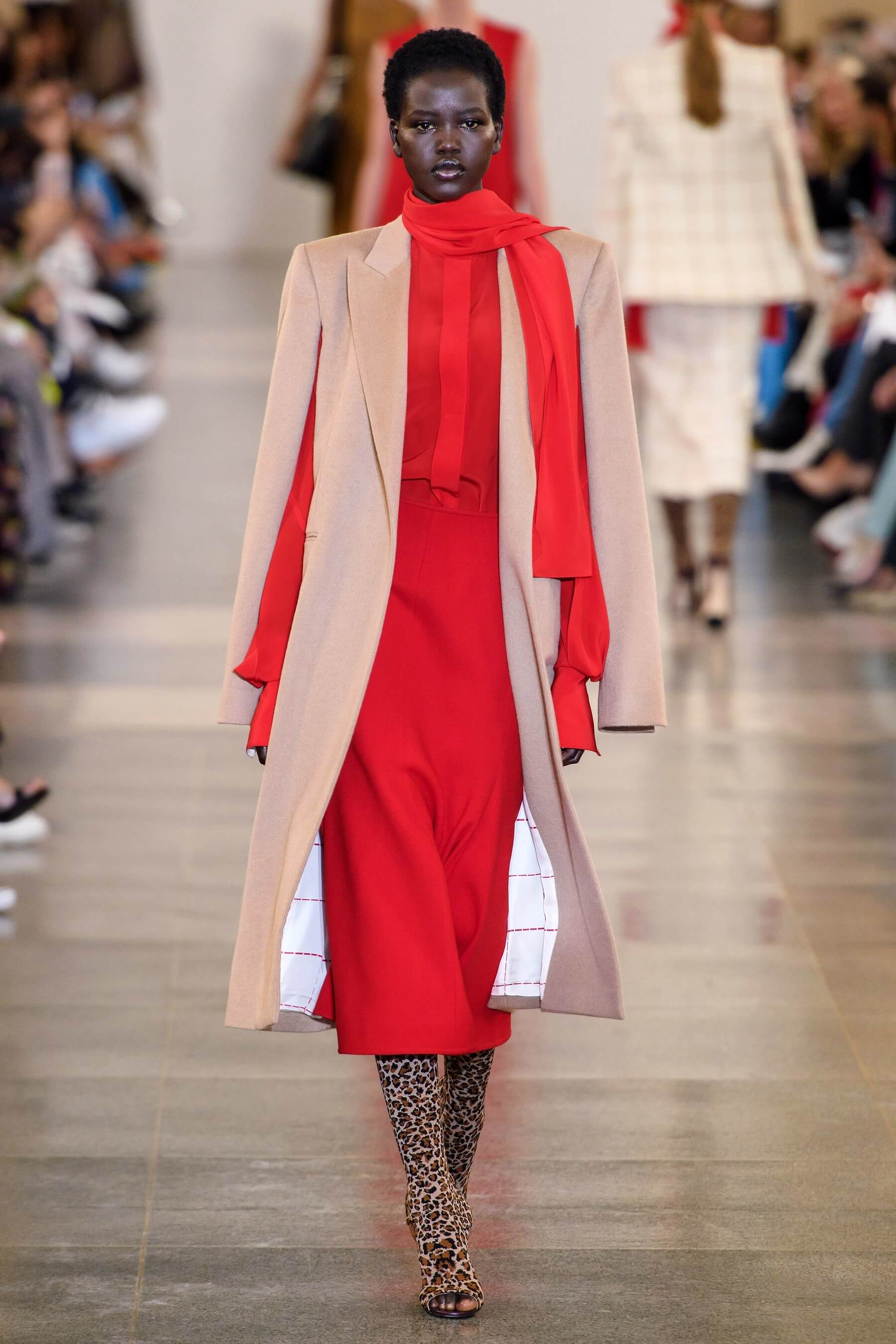 Струящиеся бежевые брюки, неоново-желтые лодочки и обилие удлиненных жакетов и пальто в клетку на показе Виктории Бекхэм дополнили клетчатые блузы с острыми отложными воротниками, мохеровые джемперы — всё как в 70-е, только лучше. Клетка — от пунктирной до классической мелкой "аргайл" — и горячий оранжево-красный оттенок стали главными элементами очередной и, как всегда, удачной работы Виктории на тему базового гардероба современной женщины. Для вечерних образов в коллекции также нашлось место — на подиуме появлялись модели в минималистичных черных платьях.