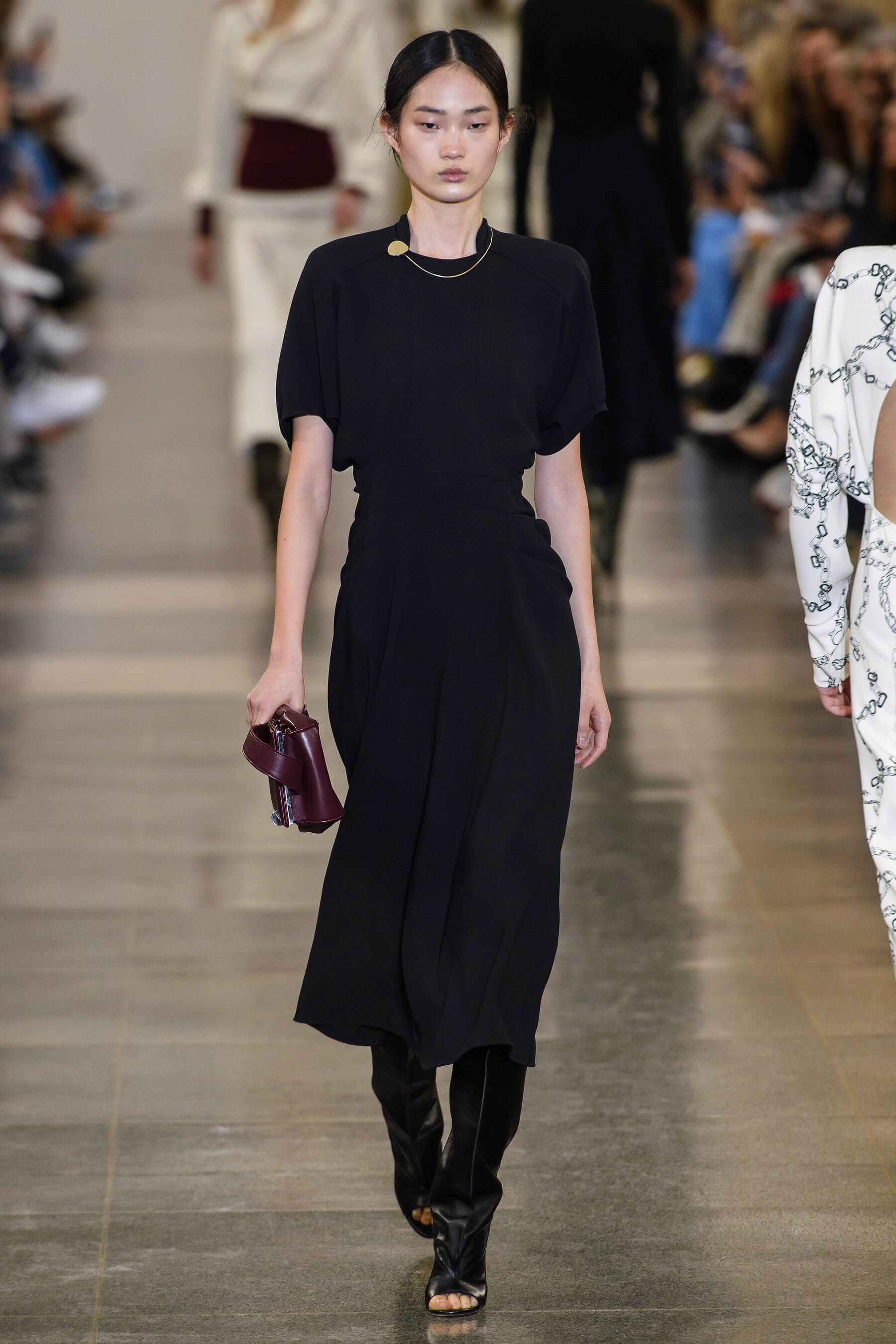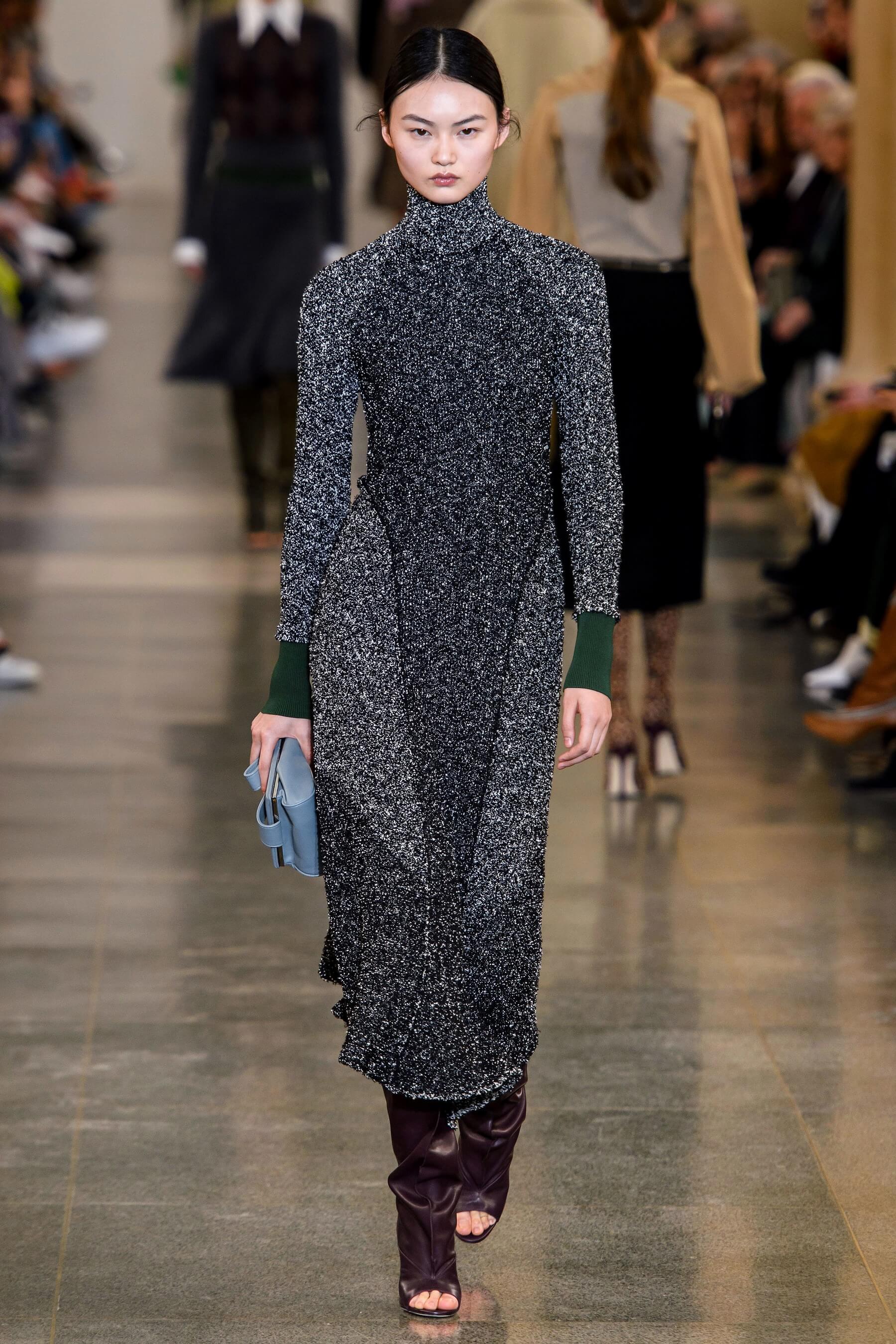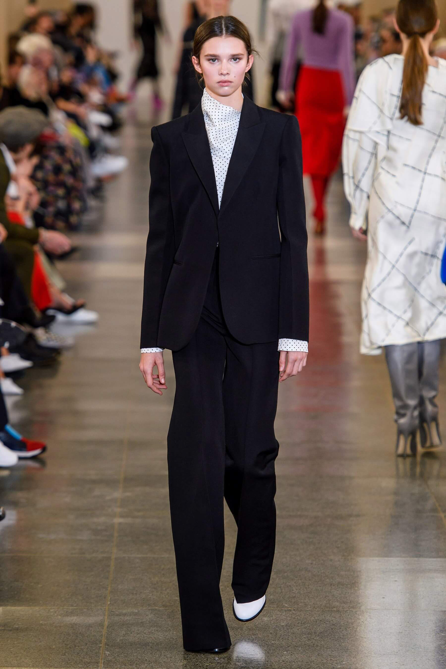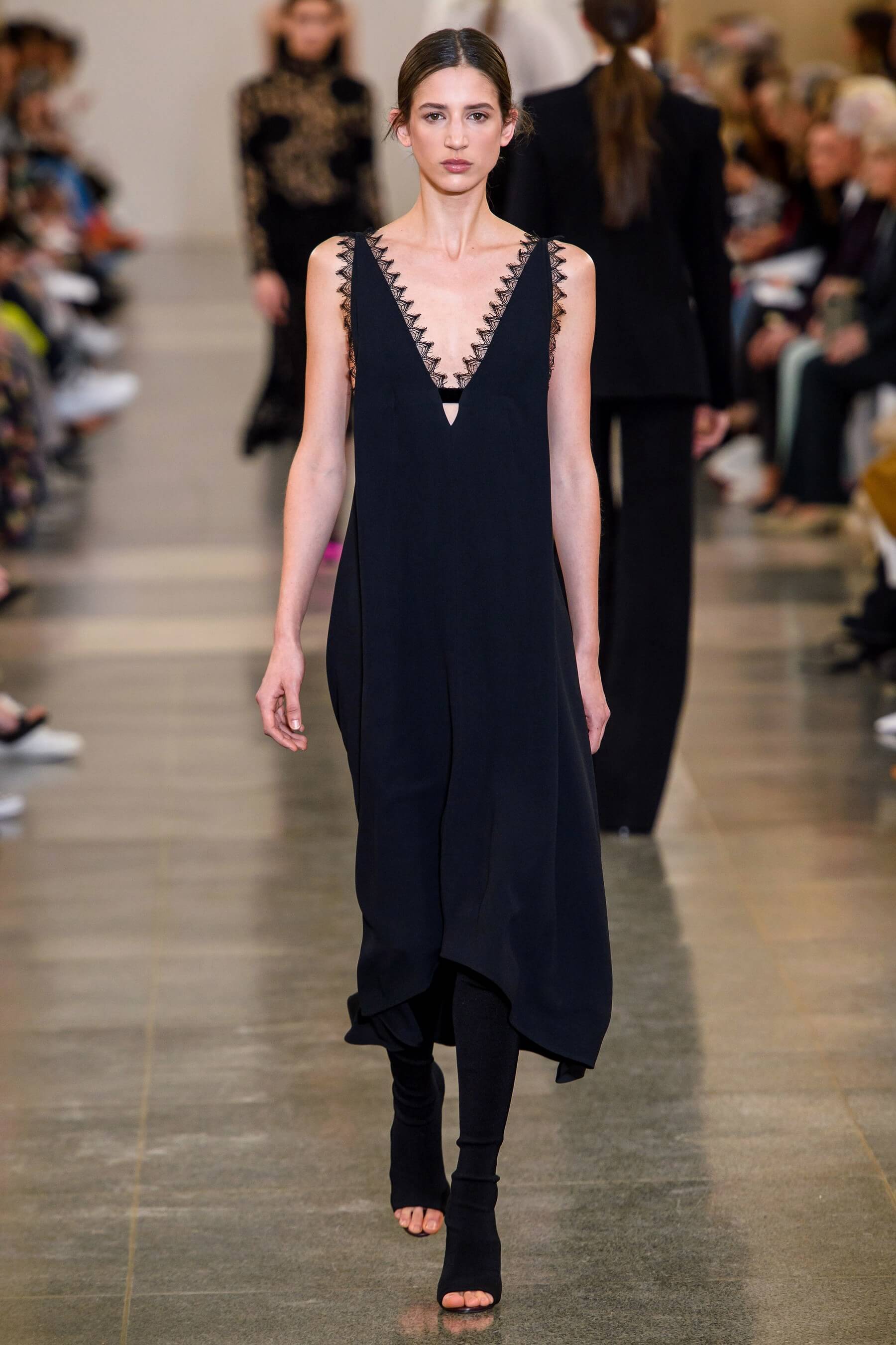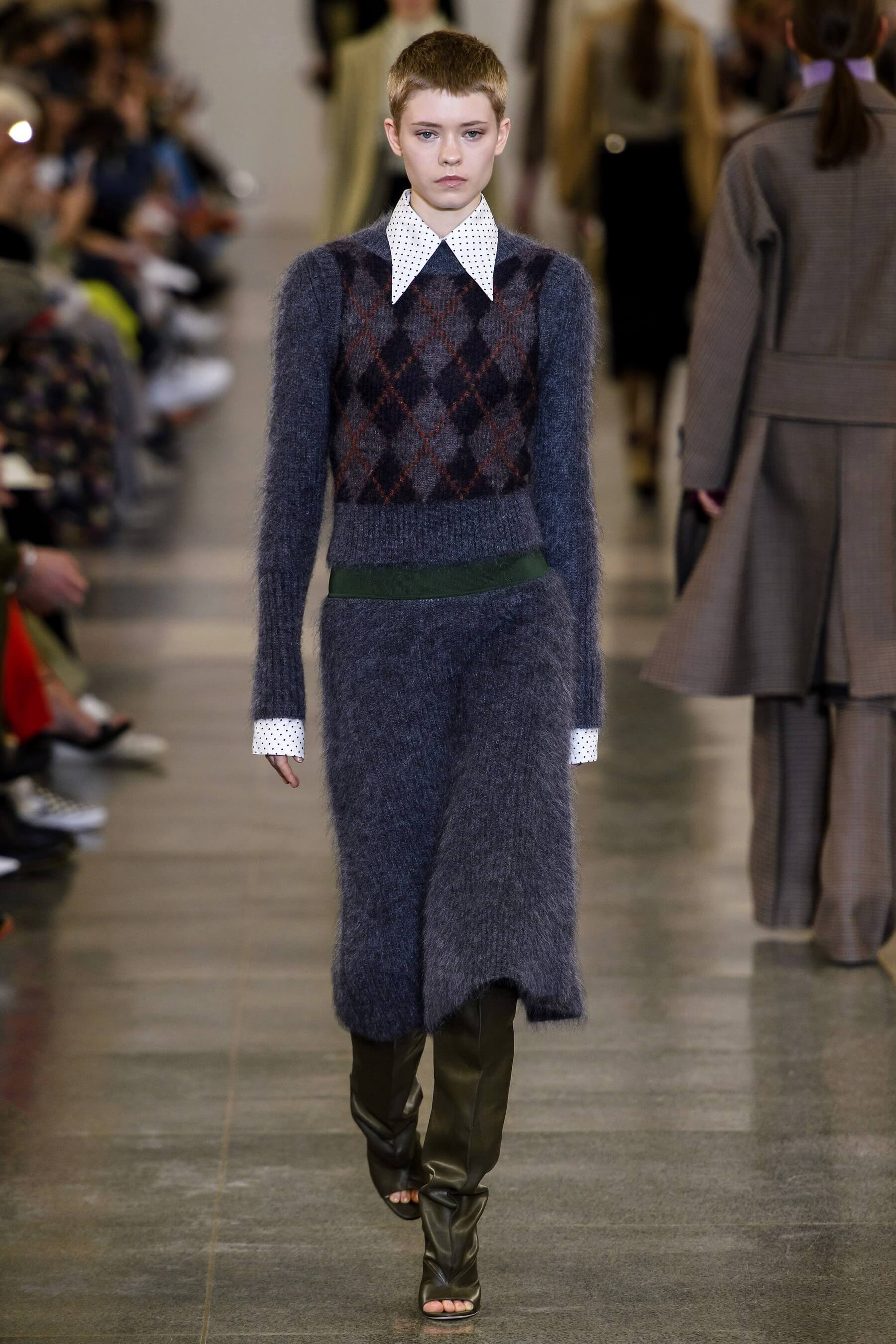 Струящиеся бежевые брюки, неоново-желтые лодочки и обилие удлиненных жакетов и пальто в клетку на показе Виктории Бекхэм дополнили клетчатые блузы с острыми отложными воротниками, мохеровые джемперы — всё как в 70-е, только лучше. Клетка — от пунктирной до классической мелкой "аргайл" — и горячий оранжево-красный оттенок стали главными элементами очередной и, как всегда, удачной работы Виктории на тему базового гардероба современной женщины. Для вечерних образов в коллекции также нашлось место — на подиуме появлялись модели в минималистичных черных платьях.
