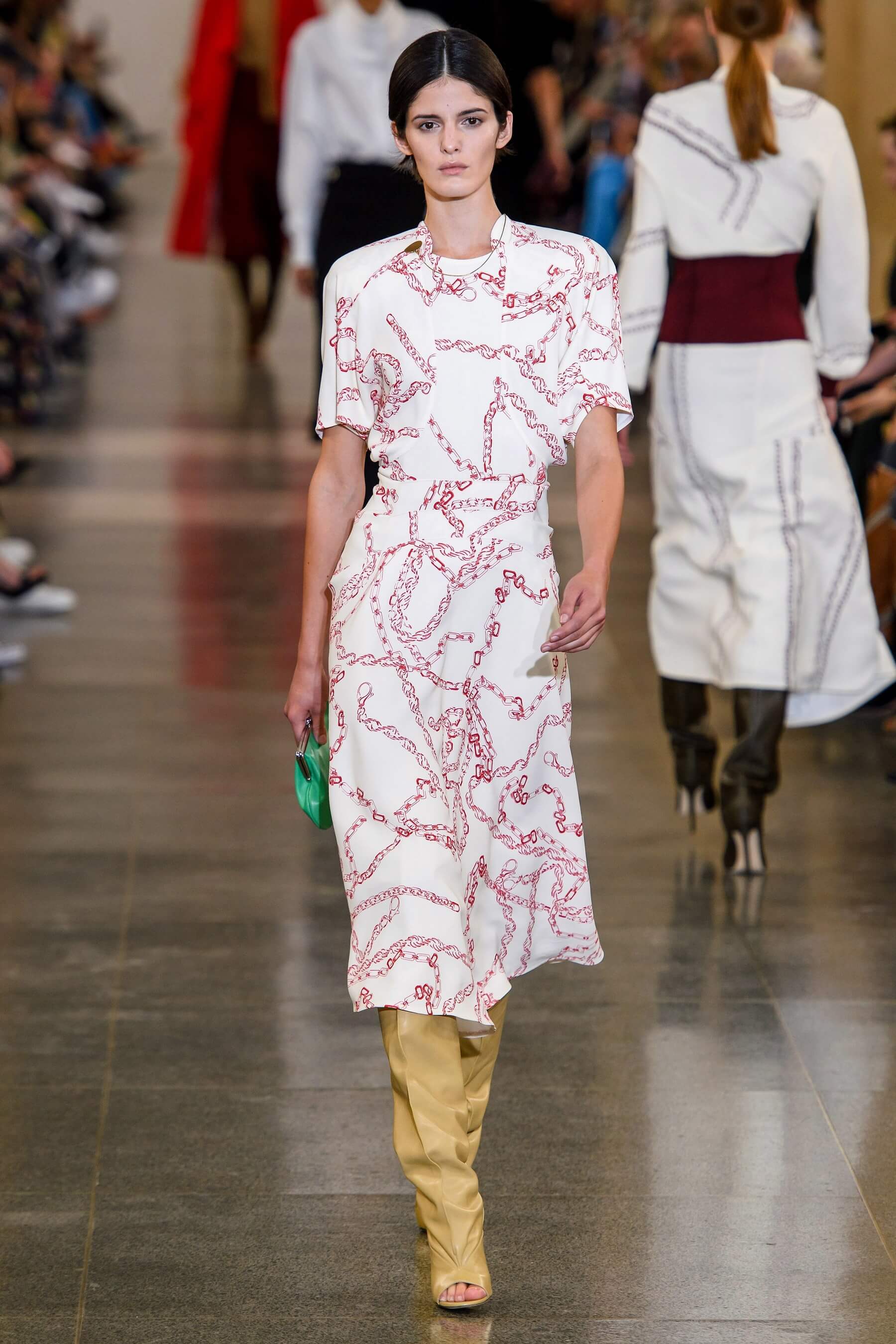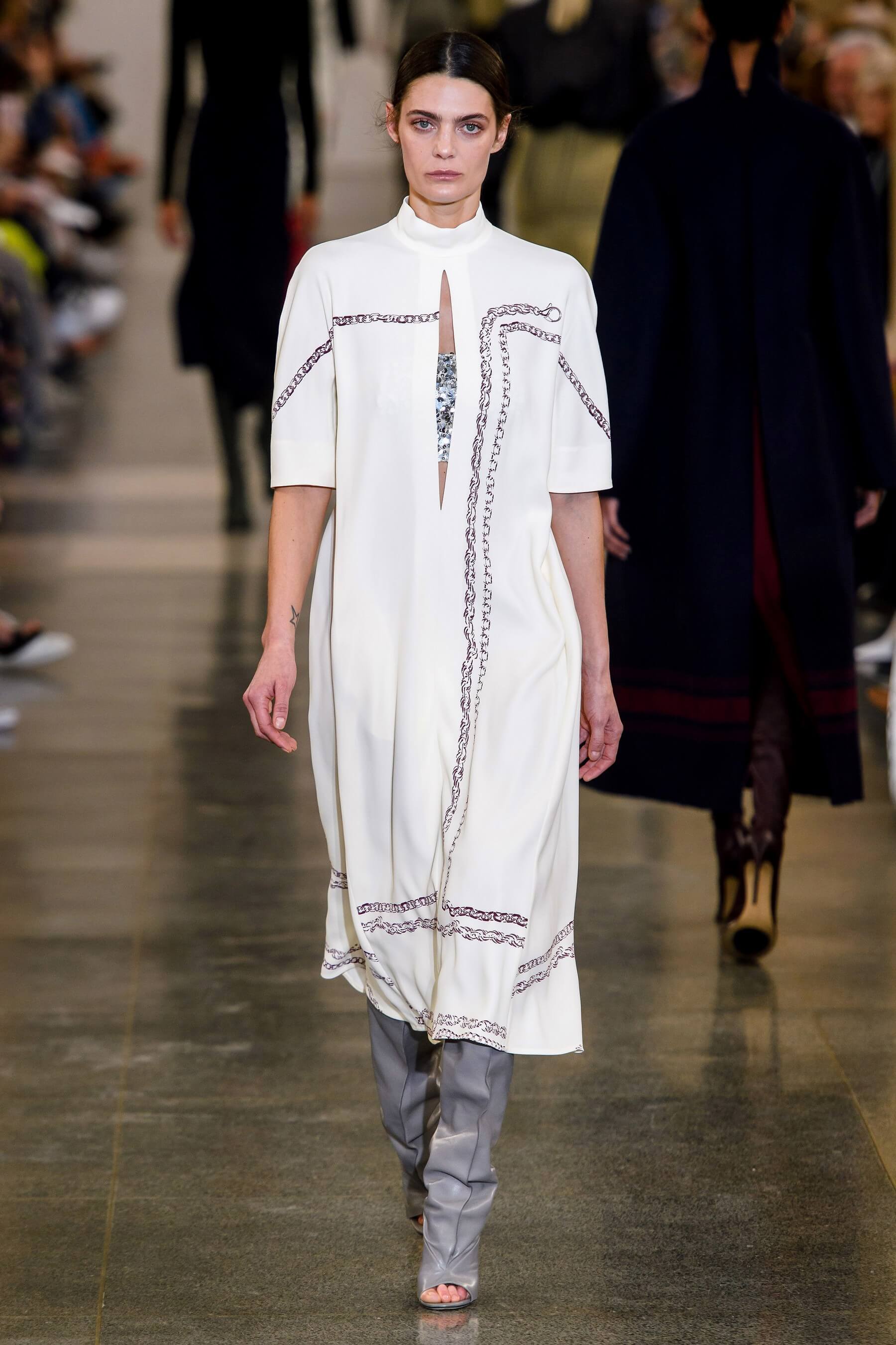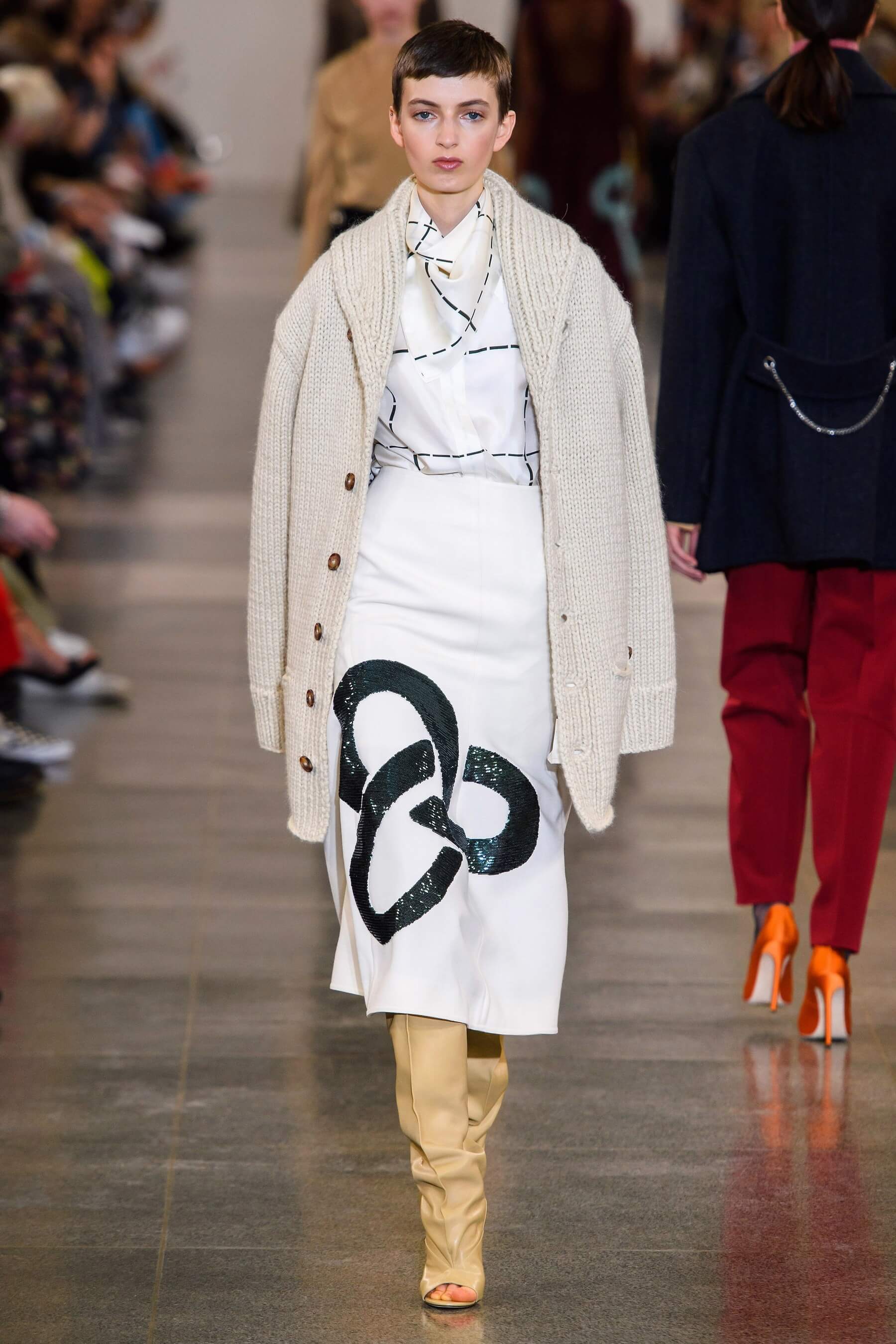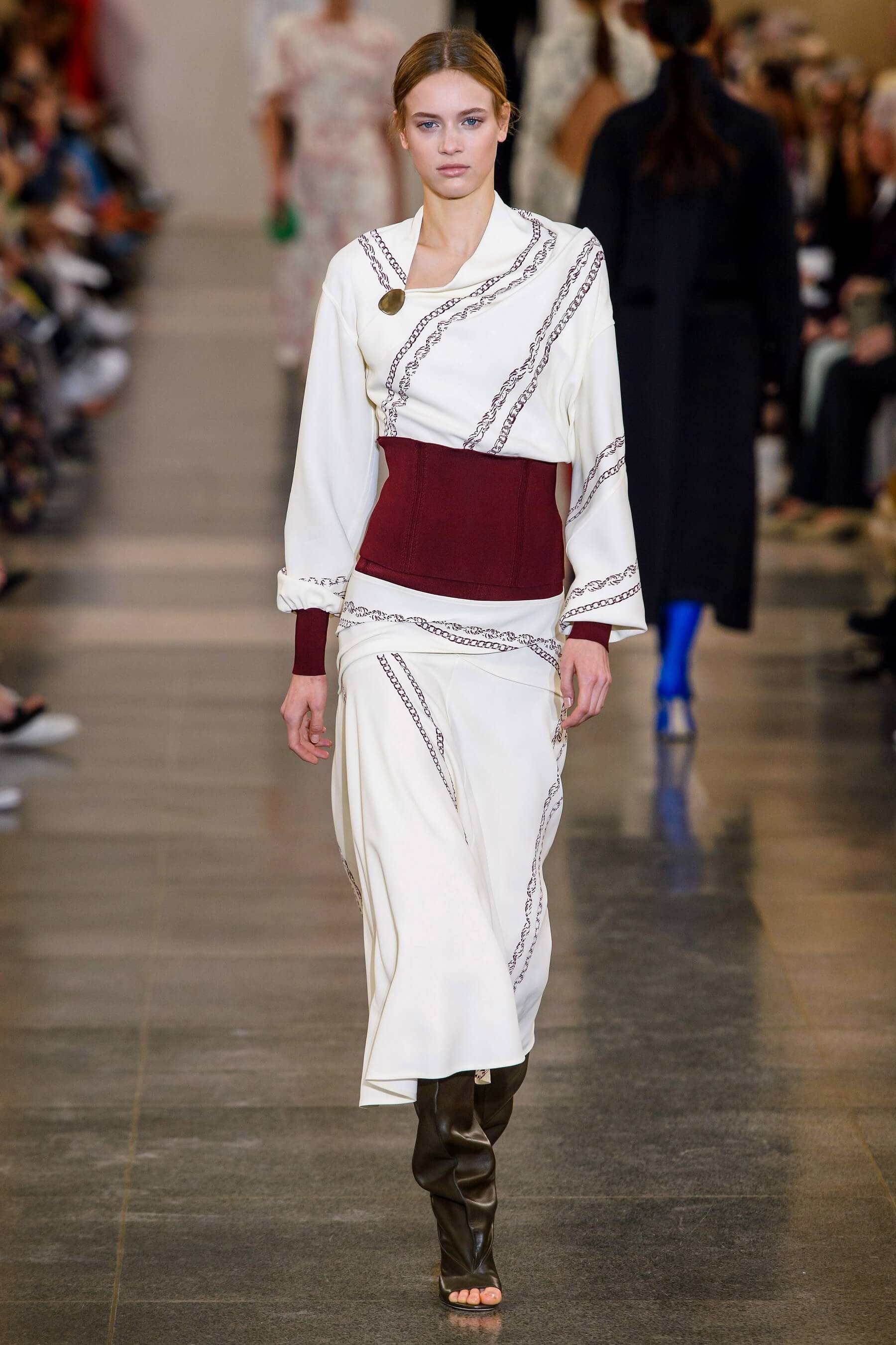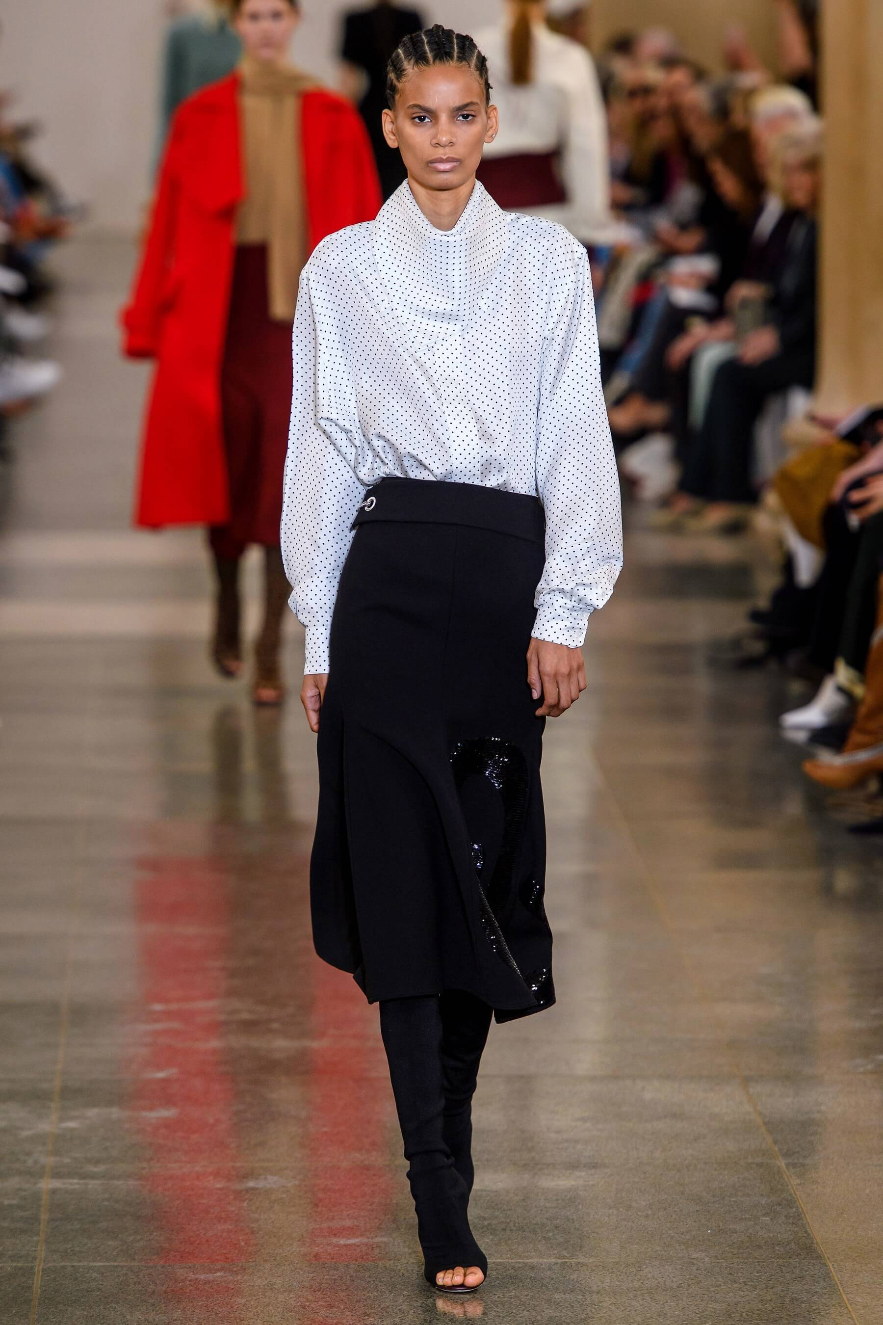 Струящиеся бежевые брюки, неоново-желтые лодочки и обилие удлиненных жакетов и пальто в клетку на показе Виктории Бекхэм дополнили клетчатые блузы с острыми отложными воротниками, мохеровые джемперы — всё как в 70-е, только лучше. Клетка — от пунктирной до классической мелкой "аргайл" — и горячий оранжево-красный оттенок стали главными элементами очередной и, как всегда, удачной работы Виктории на тему базового гардероба современной женщины. Для вечерних образов в коллекции также нашлось место — на подиуме появлялись модели в минималистичных черных платьях.