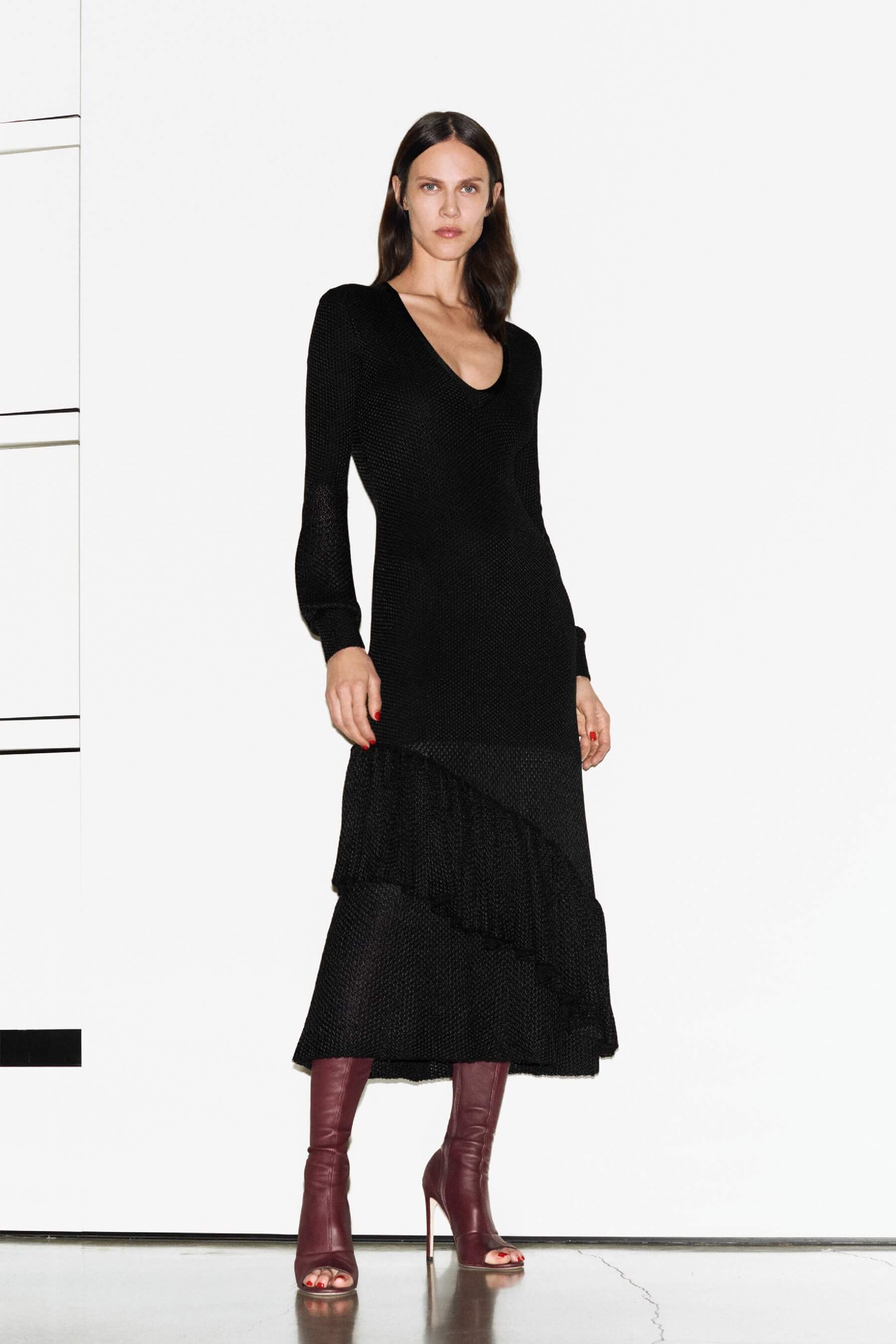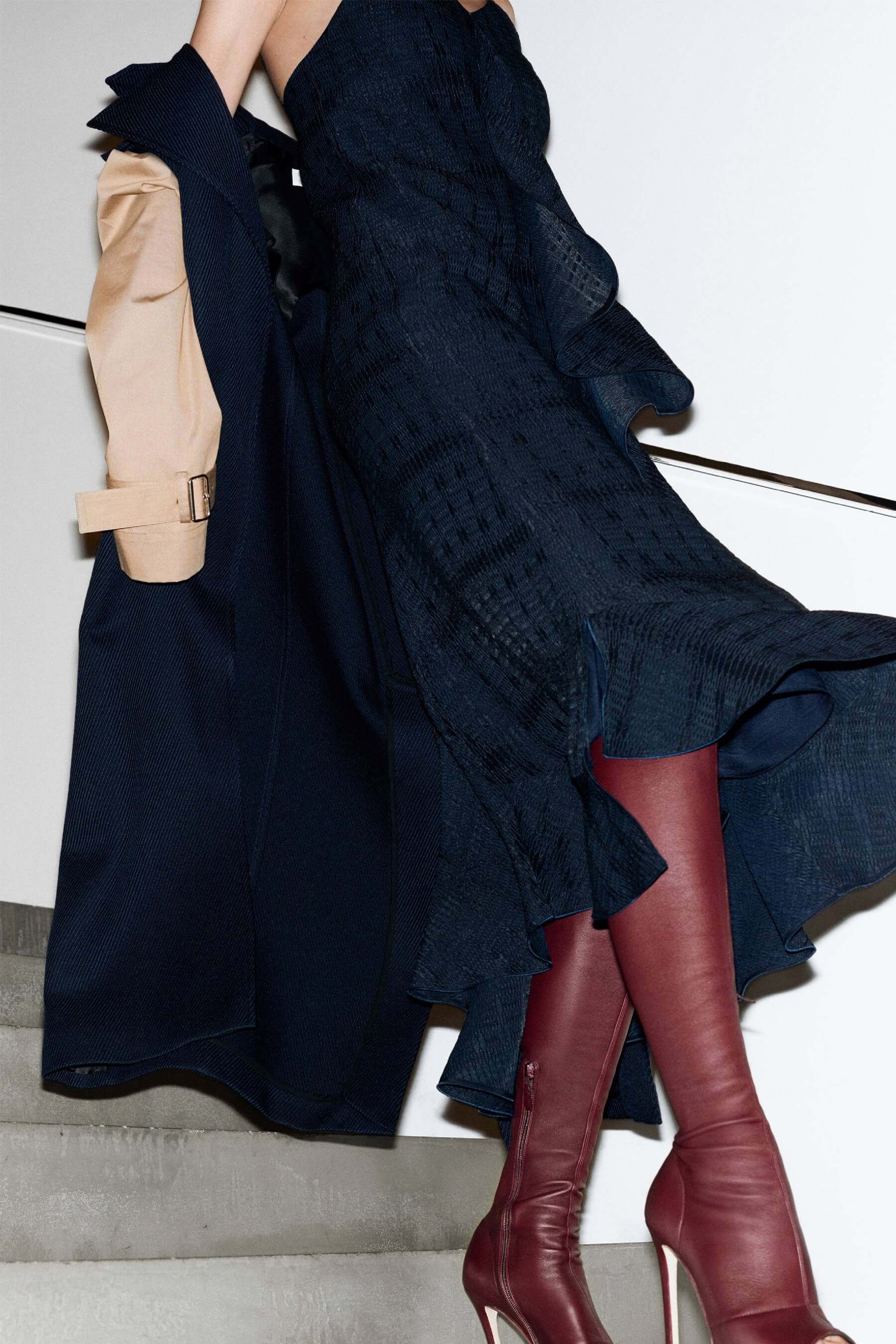 Виктория Бэкхем не одобряет тренд папиных кроссовок — центральной вещью ее новой коллекции стали высокие ботфорты на шпильке с открытым носком. Обтягивающие сапоги из темно-красной кожи Виктория комбинирует с асимметричными платьями, миди-юбками и трикотажными свитерами приглушенных цветов.