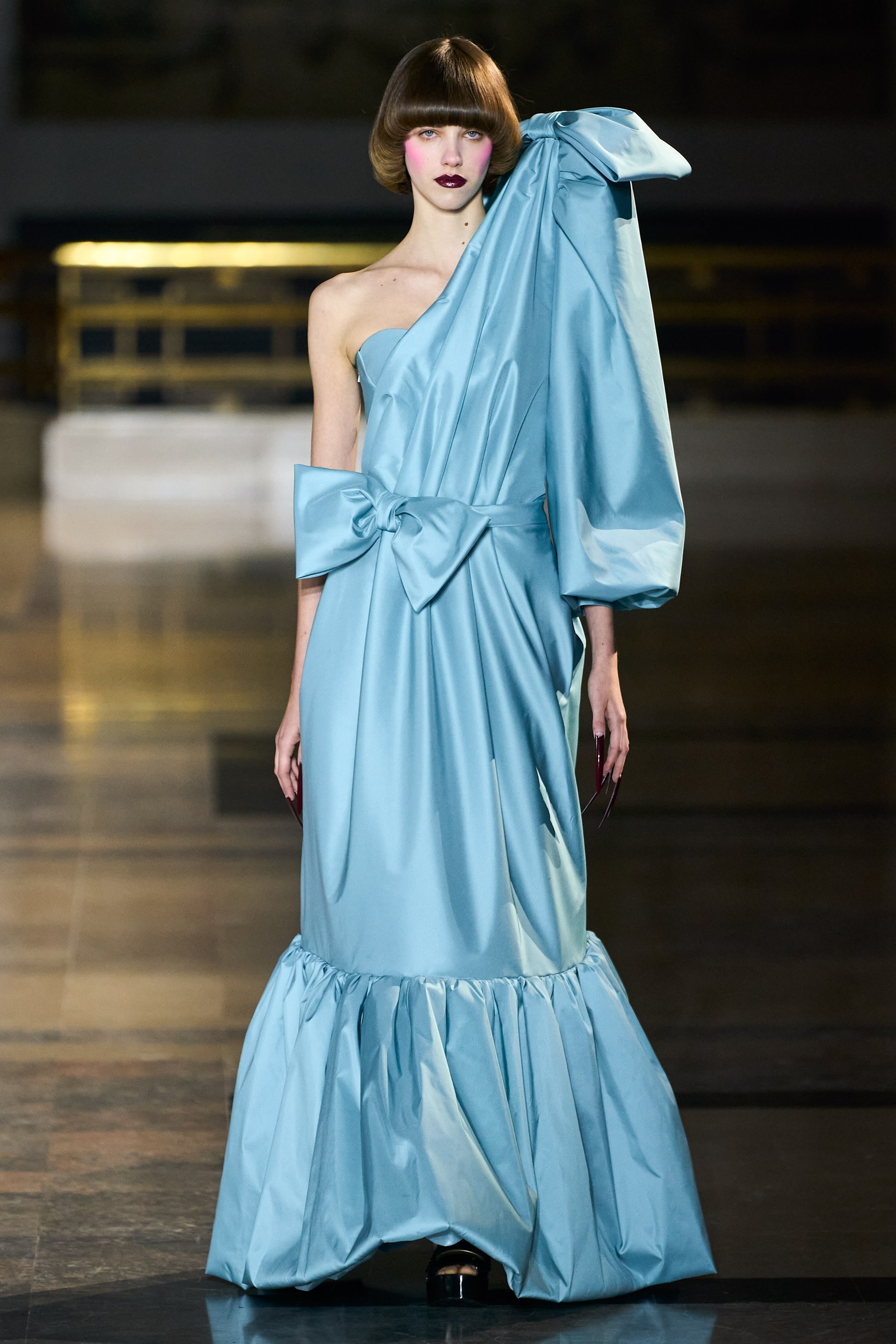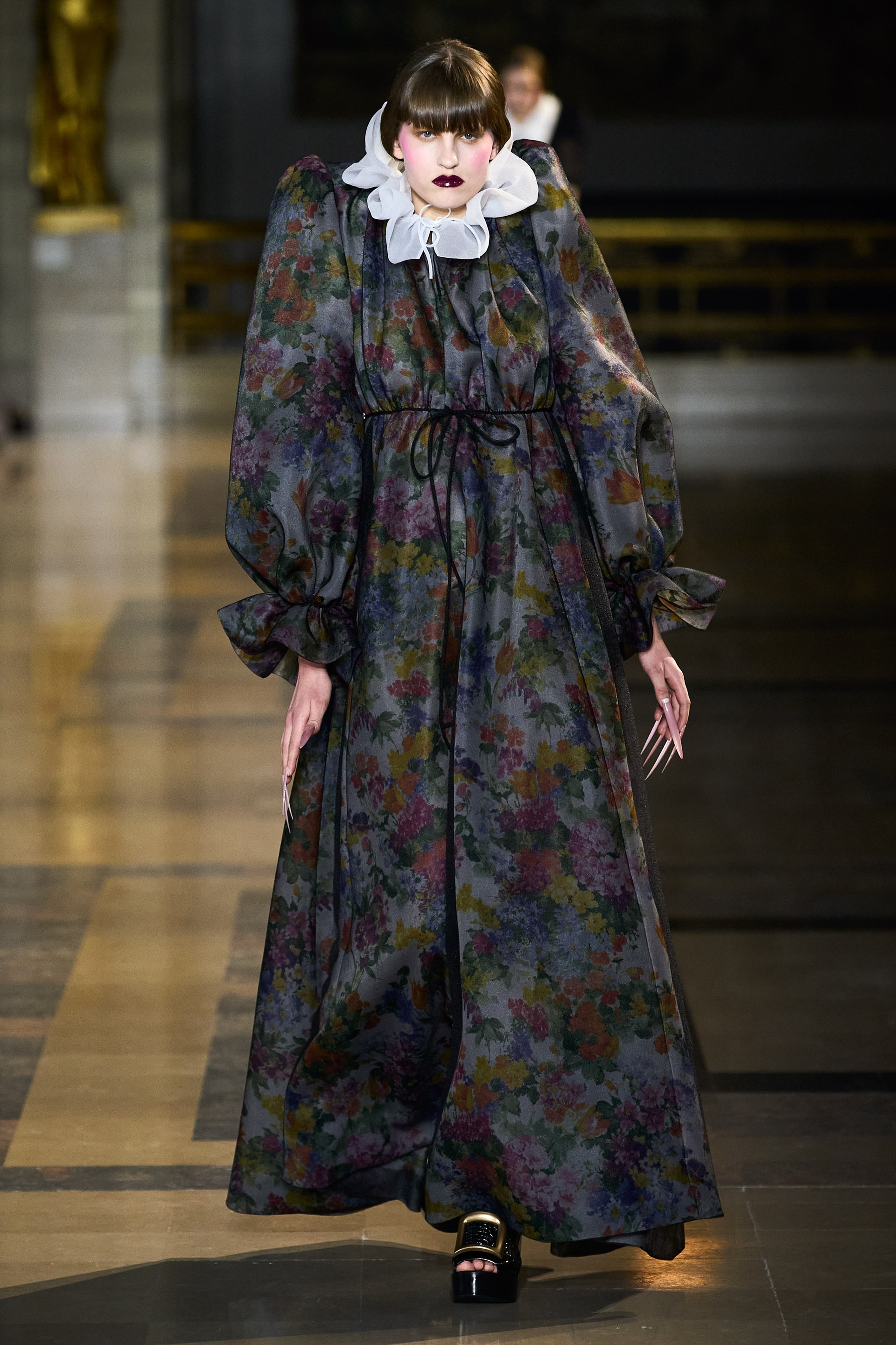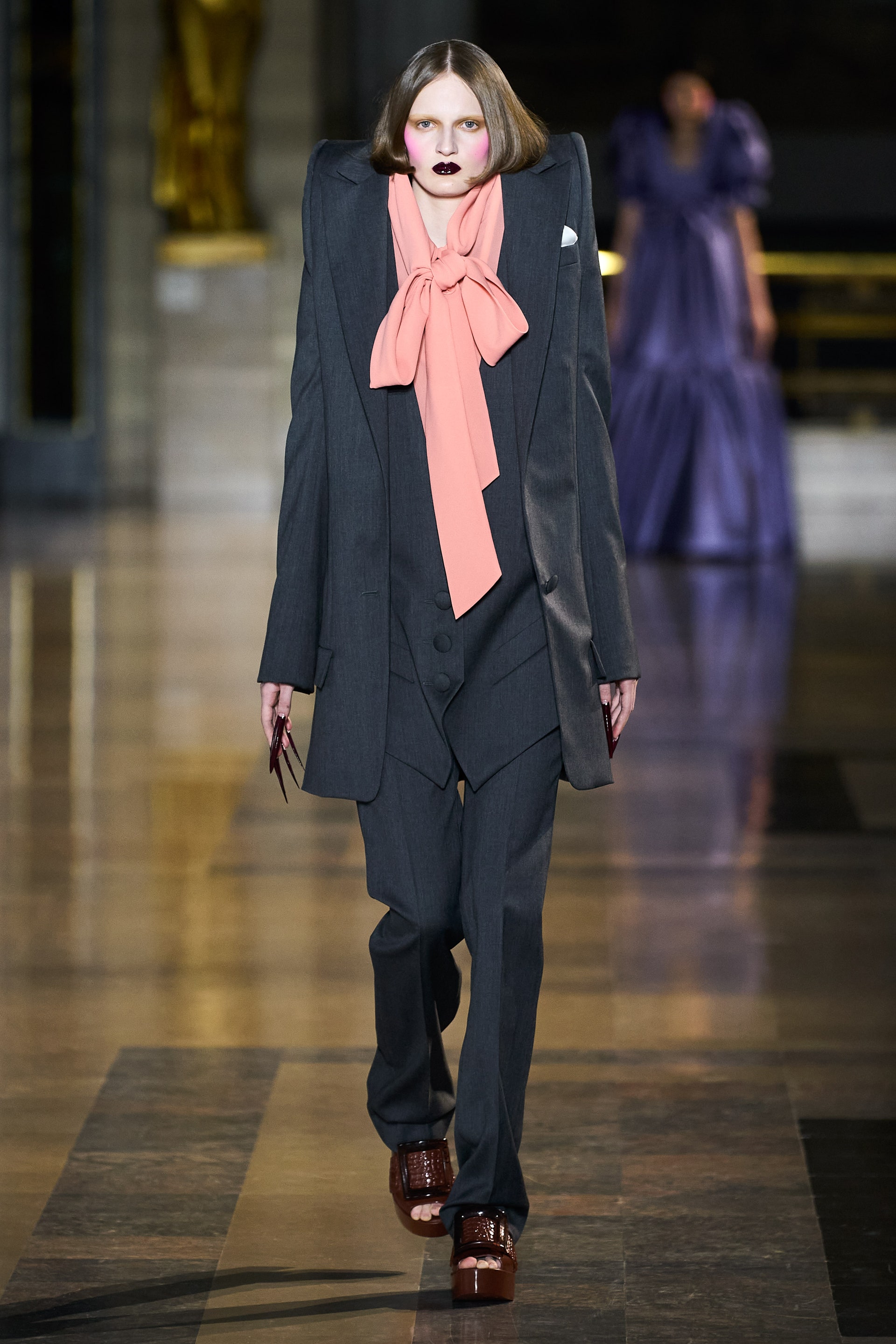 Граф Орлок из "Симфонии ужаса" Фридриха Мурнау, сутулый и мрачный, стал главным прообразом для коллекции, разделив трон вдохновения с графом Дракулой, роль которого исполнял Винсент Прайс в 80-х, и дядюшкой Фестером из культового фильма "Семейка Аддамс". Викторианский дух, который прочно ассоциируется в культуре с вампиризмом, отразился в атласных платьях с бантами, пышных рюшах и оборках у шеи, и пуританской черно-белой гамме. Угадывается в декадентской палитре коллекции (сумрачные и нежные оттенки голубого, винного, лилового) и эксцентричная пора 80-х, когда фильмы ужасов были неотъемлемой частью поп-культуры и апеллировали к позднему романтизму.