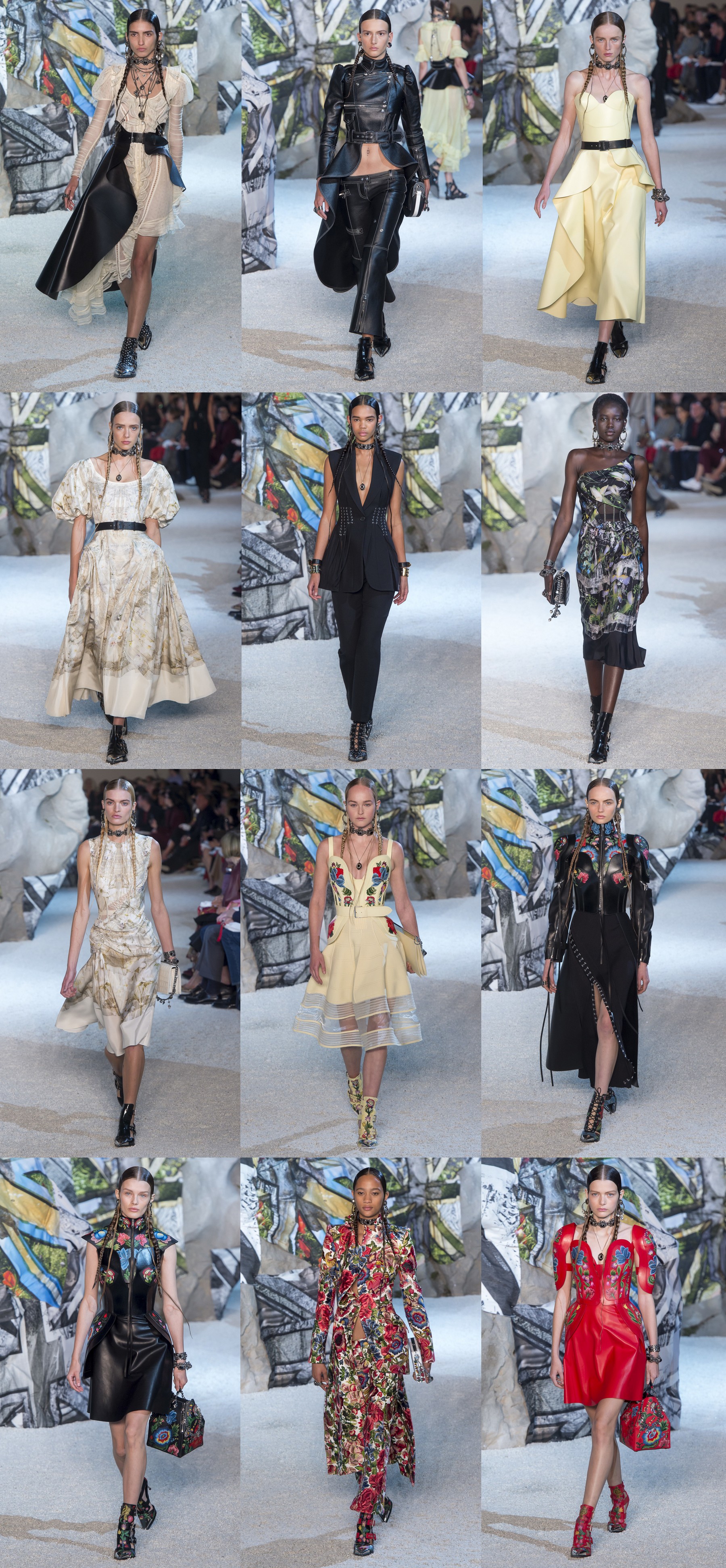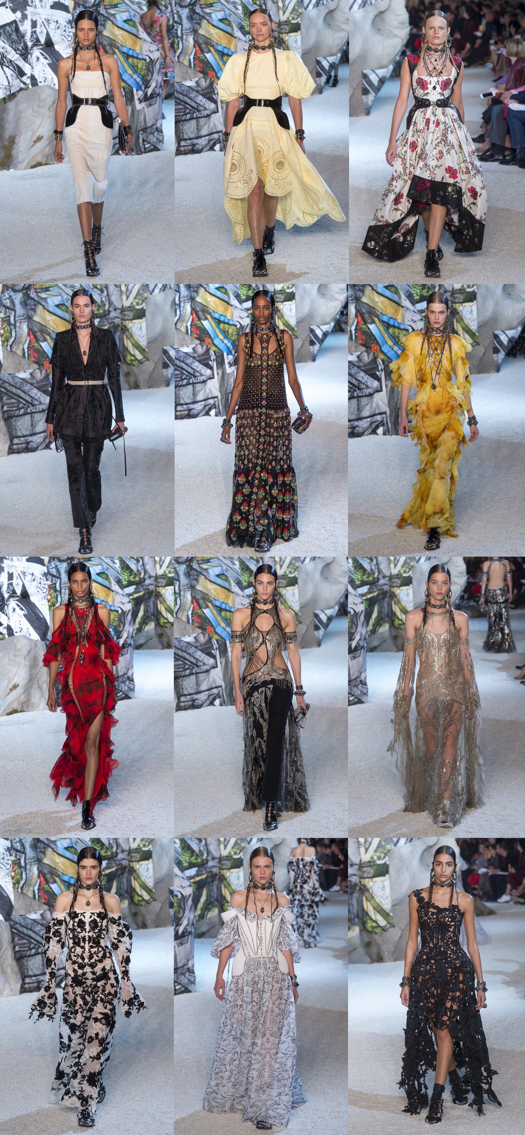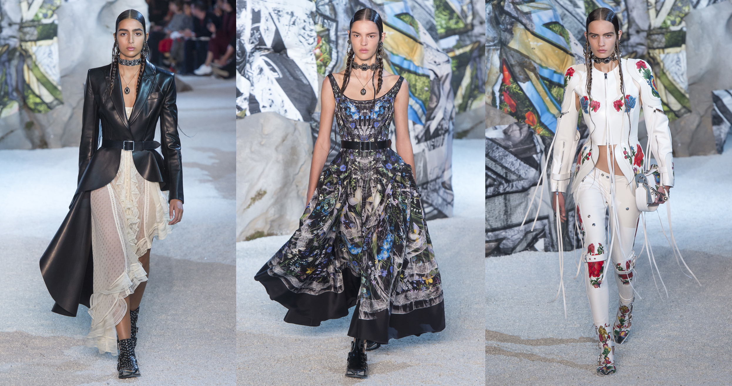 Коллекция Alexander McQueen весна-лето – 2019 стала хорошо продуманным миксом тканей, силуэтов и настроений. Кожаные элементы разбавляли романтичные платья с кружевами и строгие платья-футляры, а отменного кроя брючные костюмы – одна из самых сильных и хорошо продаваемых позиций бренда – чередовались с принтованными, густо декорированными платьями с массой цепей, достойными кельтских воинственных правительниц.