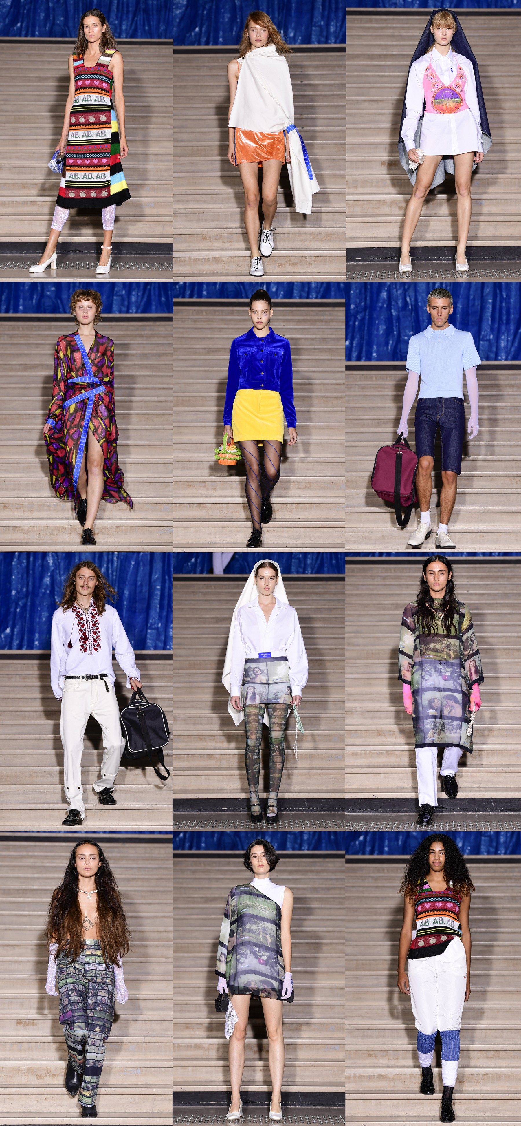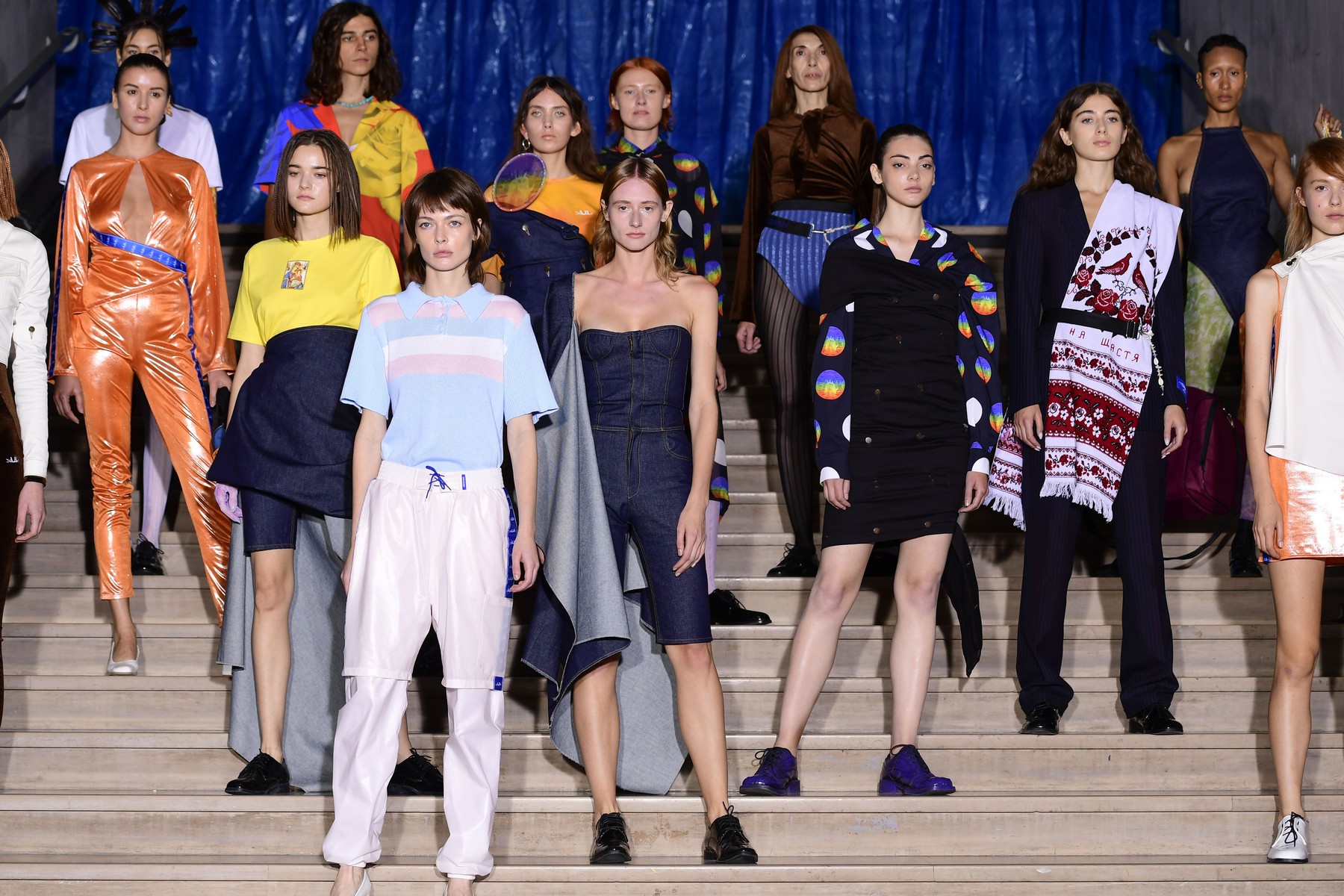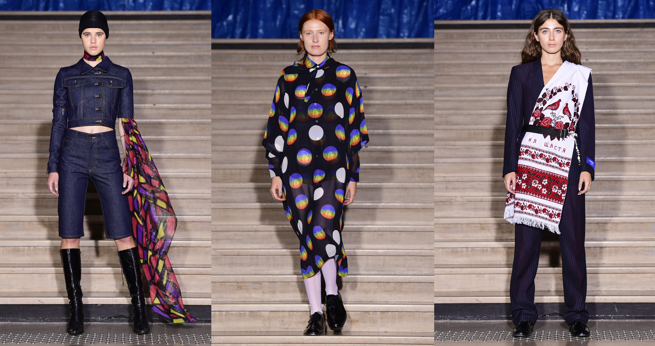 Свои референсы дизайнер миксовал и чередовал, представляя то патриотический сине-желтый костюм, то восточного кроя шелковое платье на запах с мозаичным принтом, и следом за ним выпускал на подиум девушку с джинсовой “монашеской” накидкой на голове. Такой микс Белинский объяснил тем, что вера для каждого своя: “Для кого-то это музыка и искусство, для других – медитация. Кто-то поет, кто-то идет в церковь, кто-то танцует всю ночь напролет”.