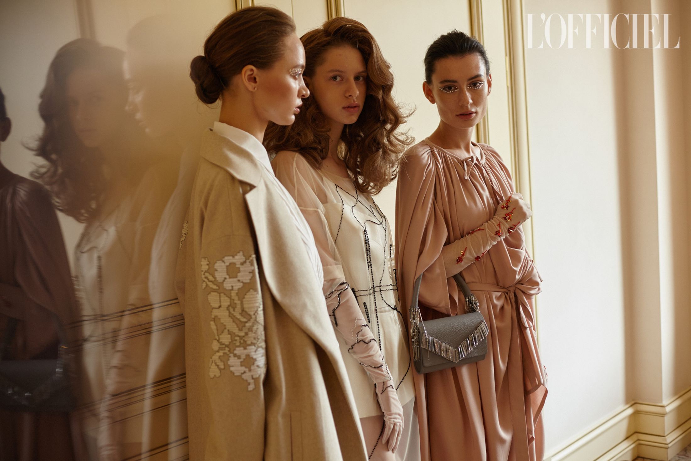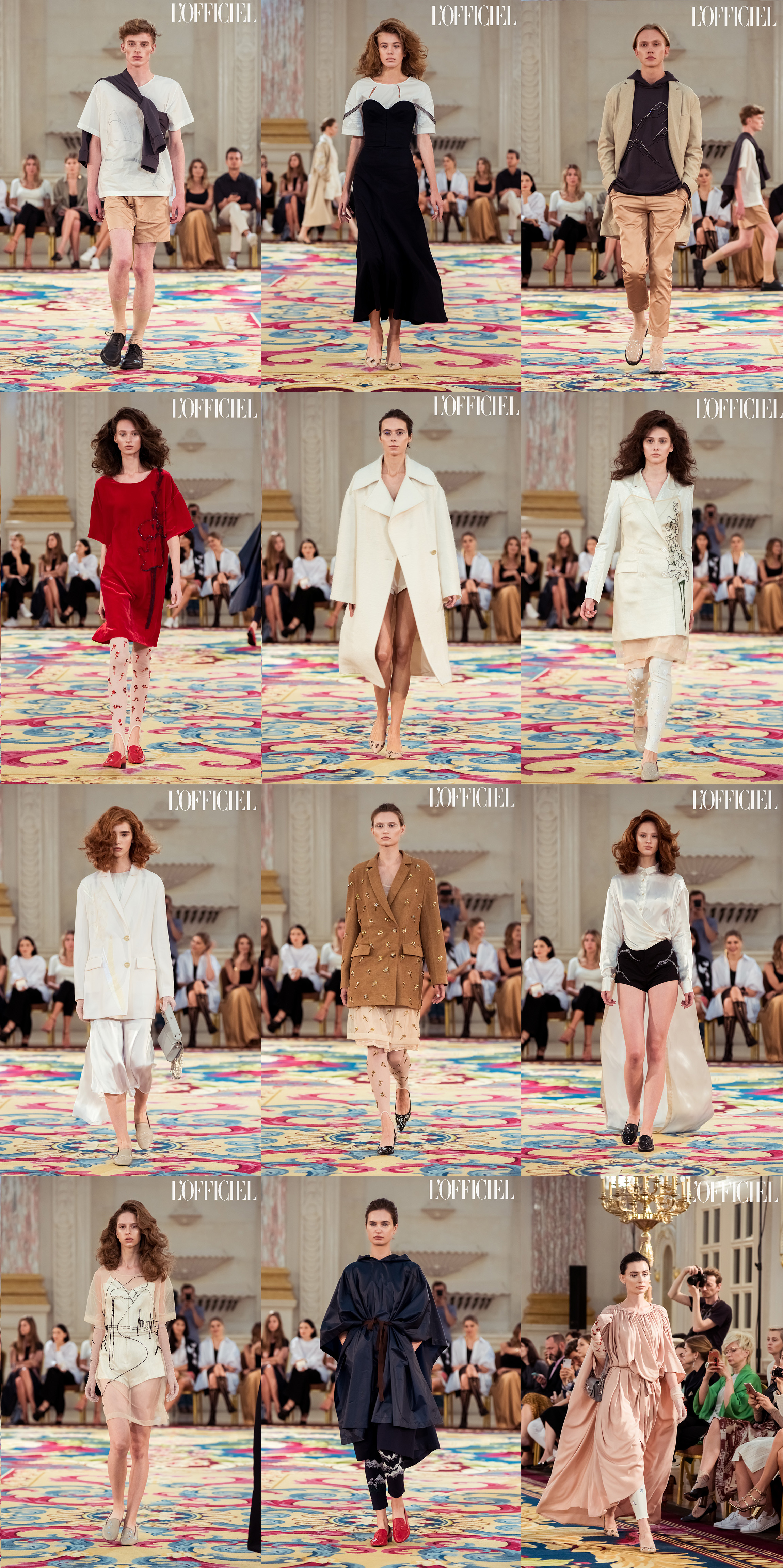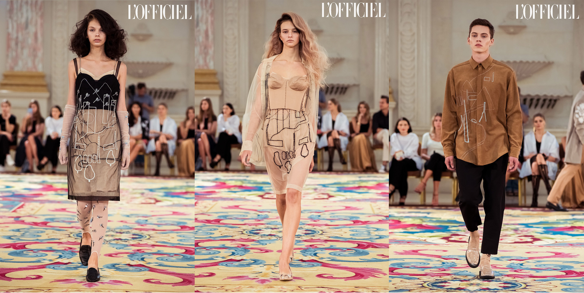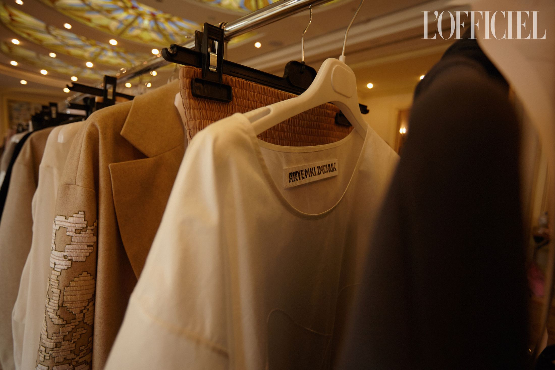 Женский образ в коллекции — очень характерный для Климчука — романтичный, хрупкий и наивный. Под невесомые шелковые платья-бюстье Артем надевает белые футболки, а поверх комбинаций накидывает удлиненные жакеты в тон или песочные плащи. Традиционно дизайнер особенное внимание уделяет верхней одежде: рукава тренчей он украшает аутентичной украинской вышивкой, на пальто-коконе молочного оттенка изображает карпатский пейзаж, пиджак карамельного оттенка щедро усыпает цветами из бисера, а двубортный жакет и вовсе прячет под едва заметное платье из прозрачного шифона, расшитое черными цветами.