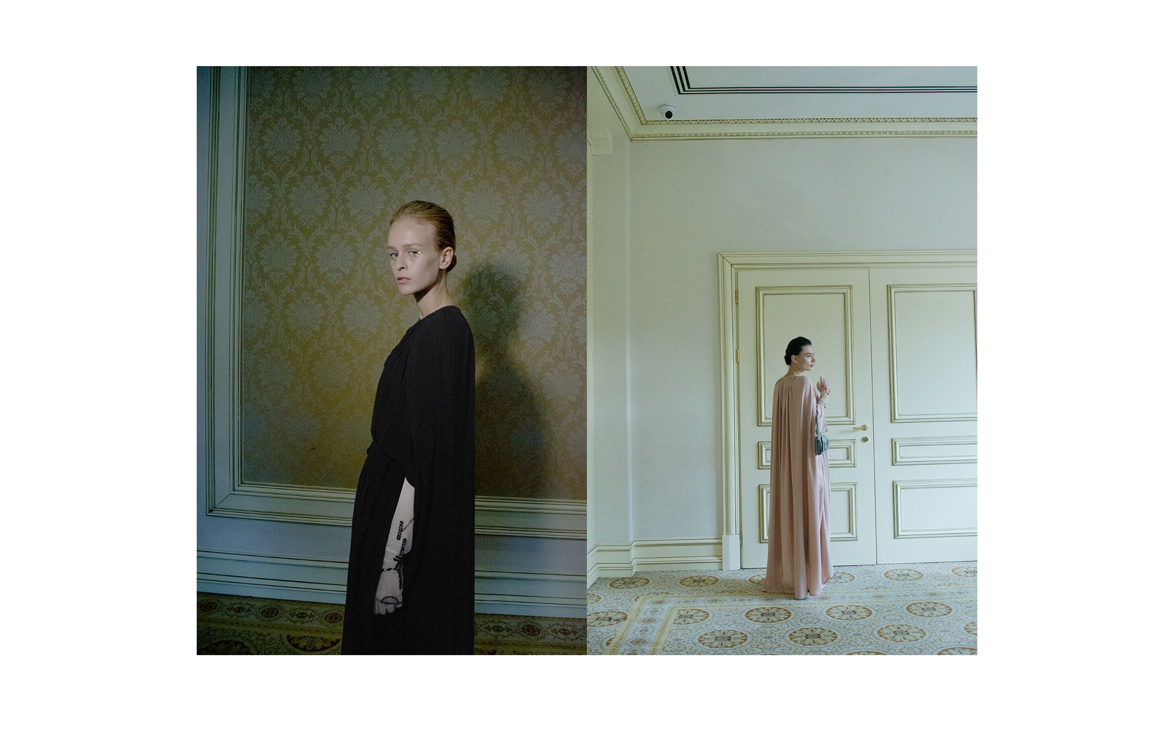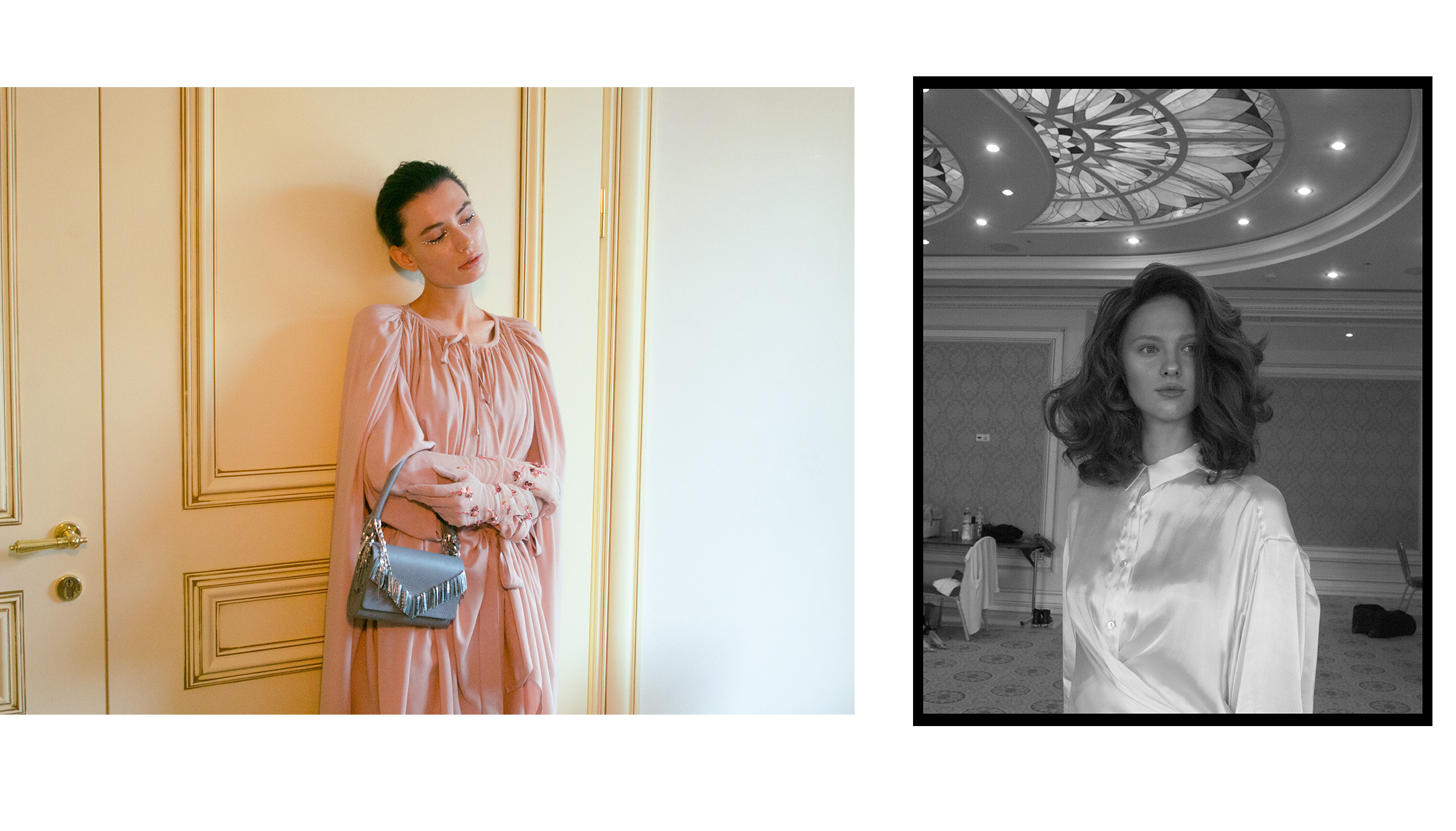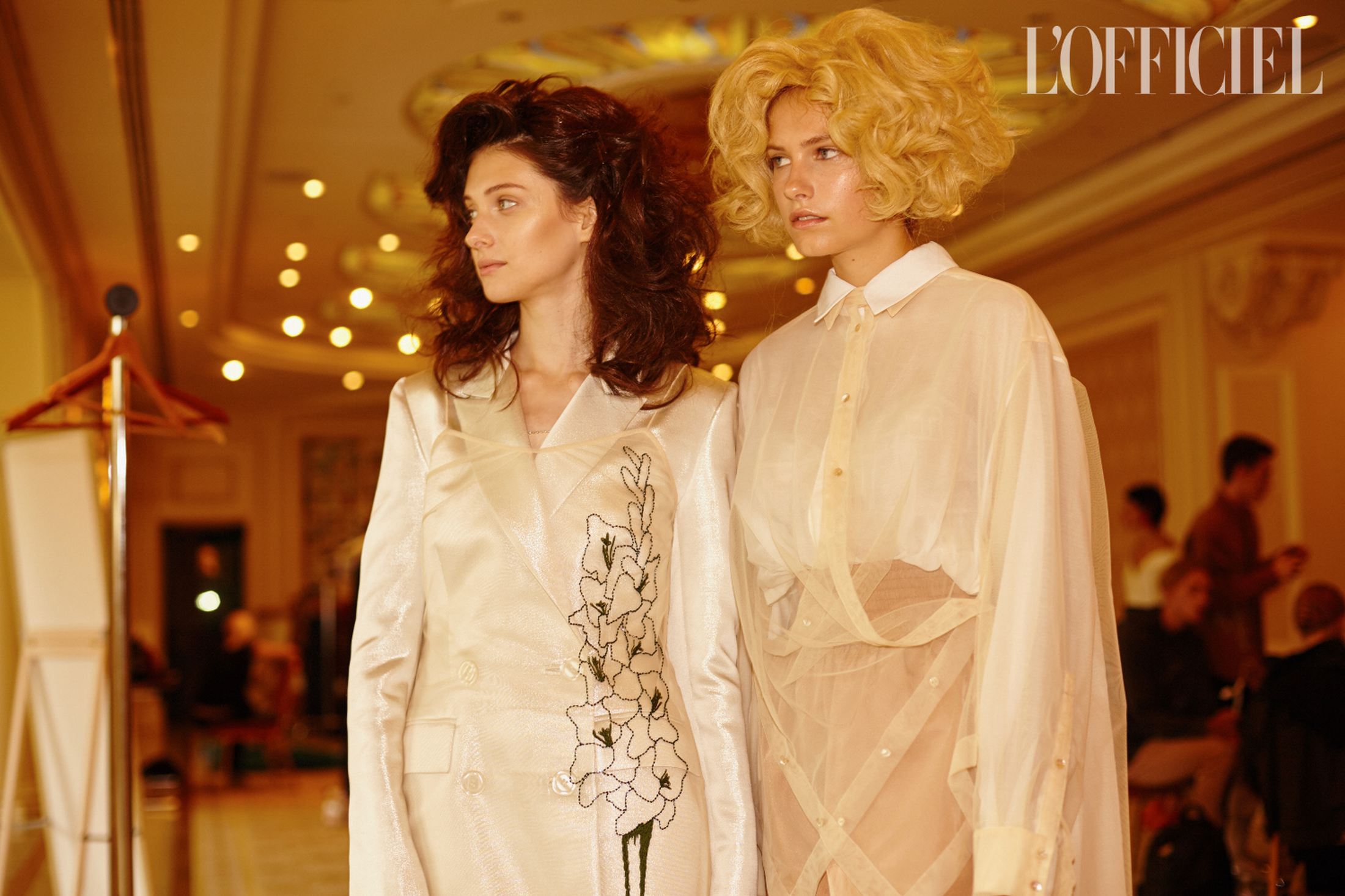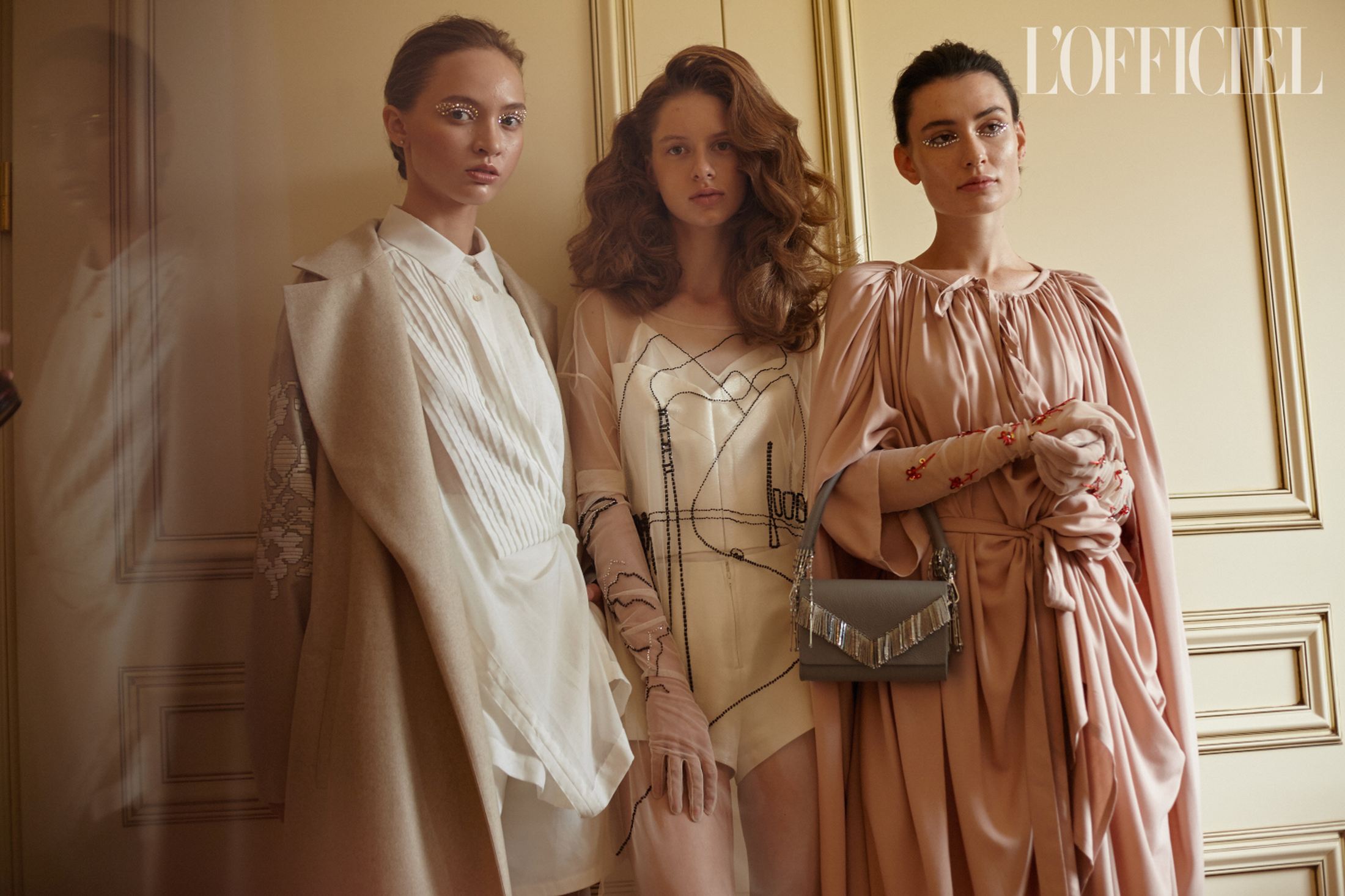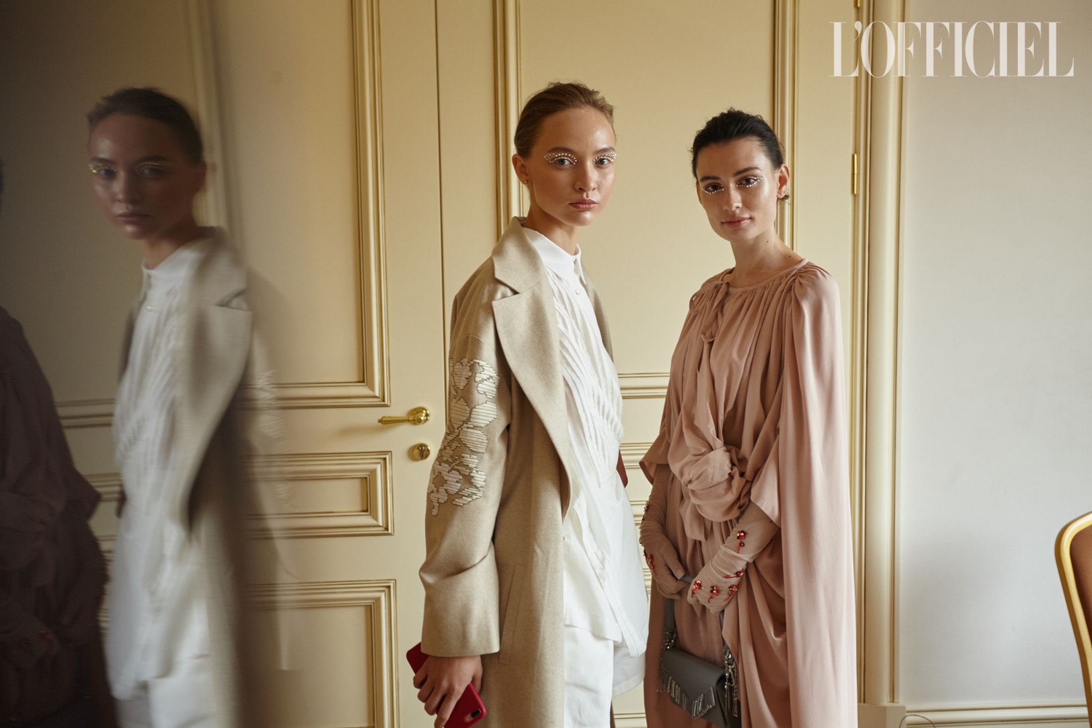 Женский образ в коллекции — очень характерный для Климчука — романтичный, хрупкий и наивный. Под невесомые шелковые платья-бюстье Артем надевает белые футболки, а поверх комбинаций накидывает удлиненные жакеты в тон или песочные плащи. Традиционно дизайнер особенное внимание уделяет верхней одежде: рукава тренчей он украшает аутентичной украинской вышивкой, на пальто-коконе молочного оттенка изображает карпатский пейзаж, пиджак карамельного оттенка щедро усыпает цветами из бисера, а двубортный жакет и вовсе прячет под едва заметное платье из прозрачного шифона, расшитое черными цветами.