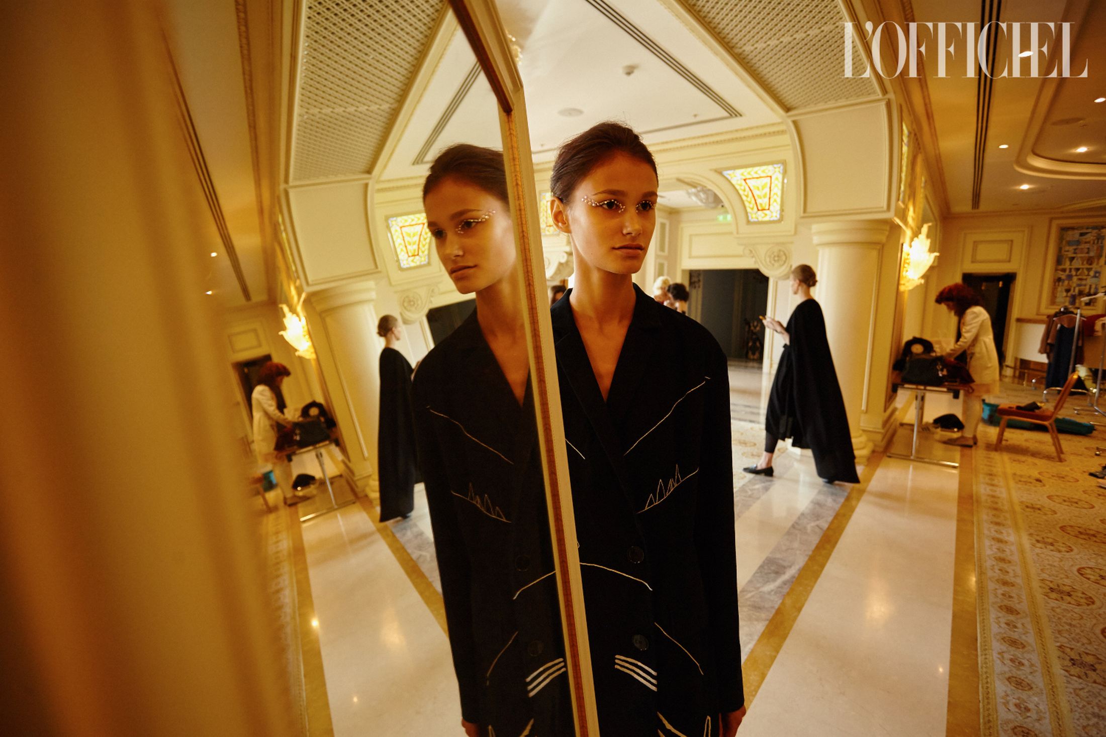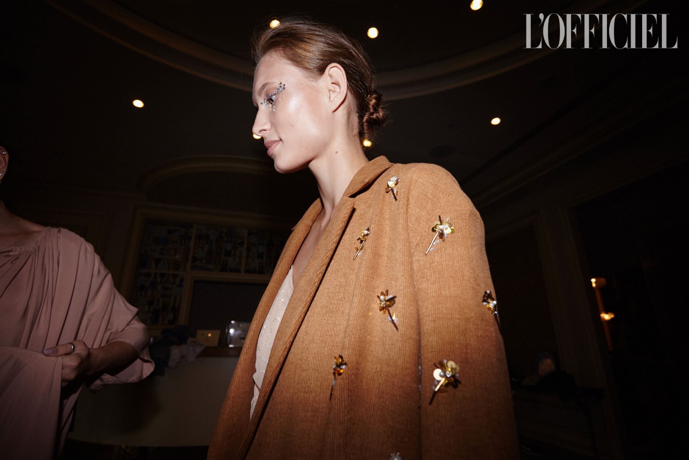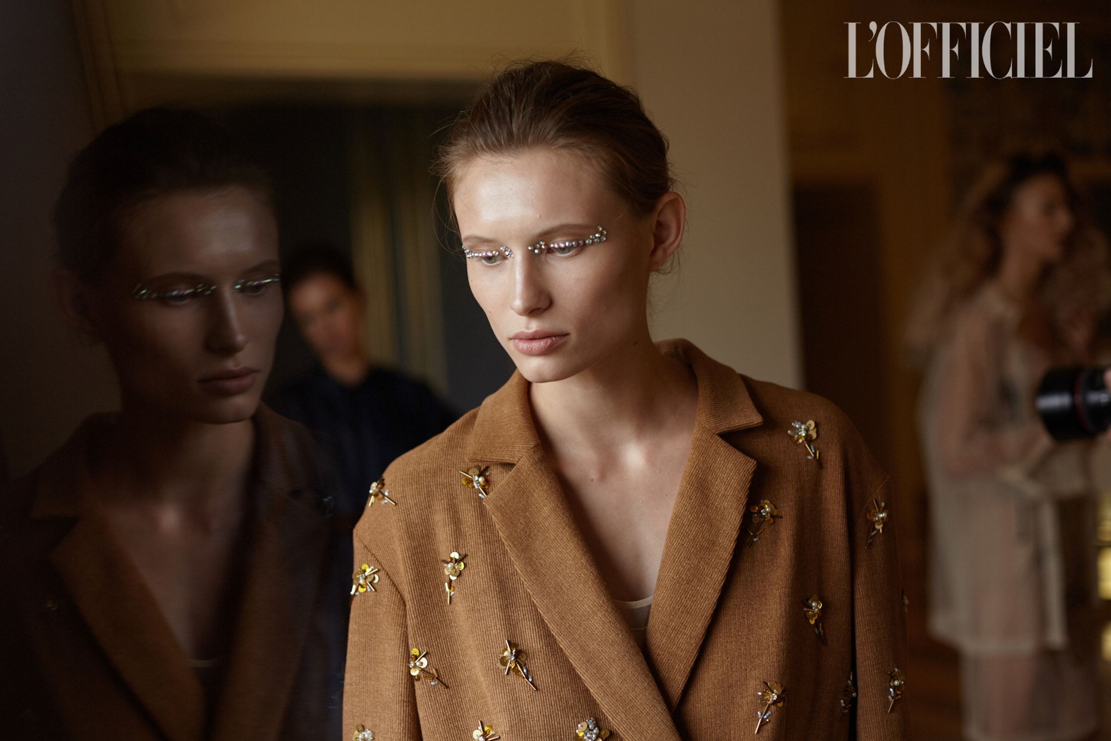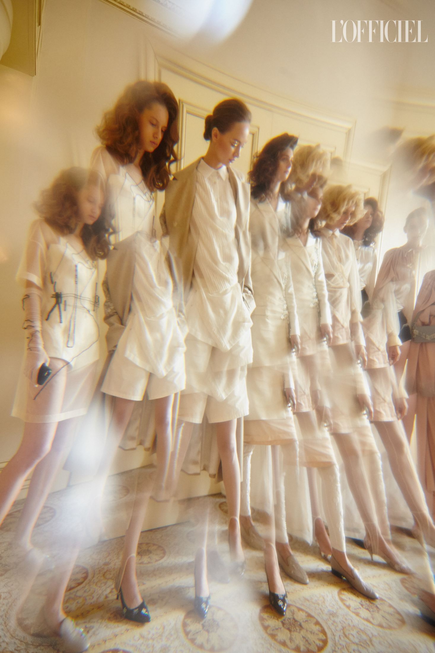 Женский образ в коллекции — очень характерный для Климчука — романтичный, хрупкий и наивный. Под невесомые шелковые платья-бюстье Артем надевает белые футболки, а поверх комбинаций накидывает удлиненные жакеты в тон или песочные плащи. Традиционно дизайнер особенное внимание уделяет верхней одежде: рукава тренчей он украшает аутентичной украинской вышивкой, на пальто-коконе молочного оттенка изображает карпатский пейзаж, пиджак карамельного оттенка щедро усыпает цветами из бисера, а двубортный жакет и вовсе прячет под едва заметное платье из прозрачного шифона, расшитое черными цветами.