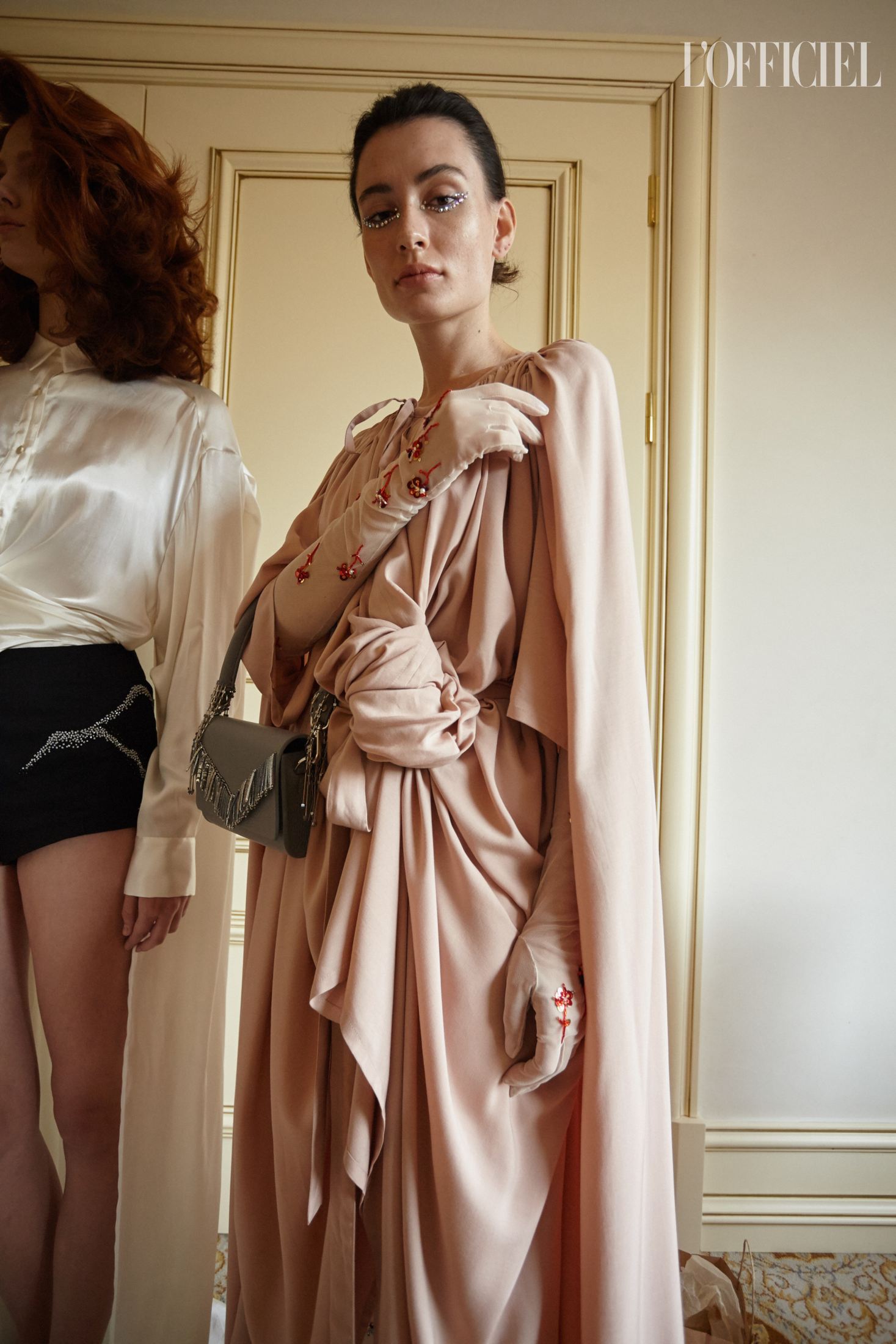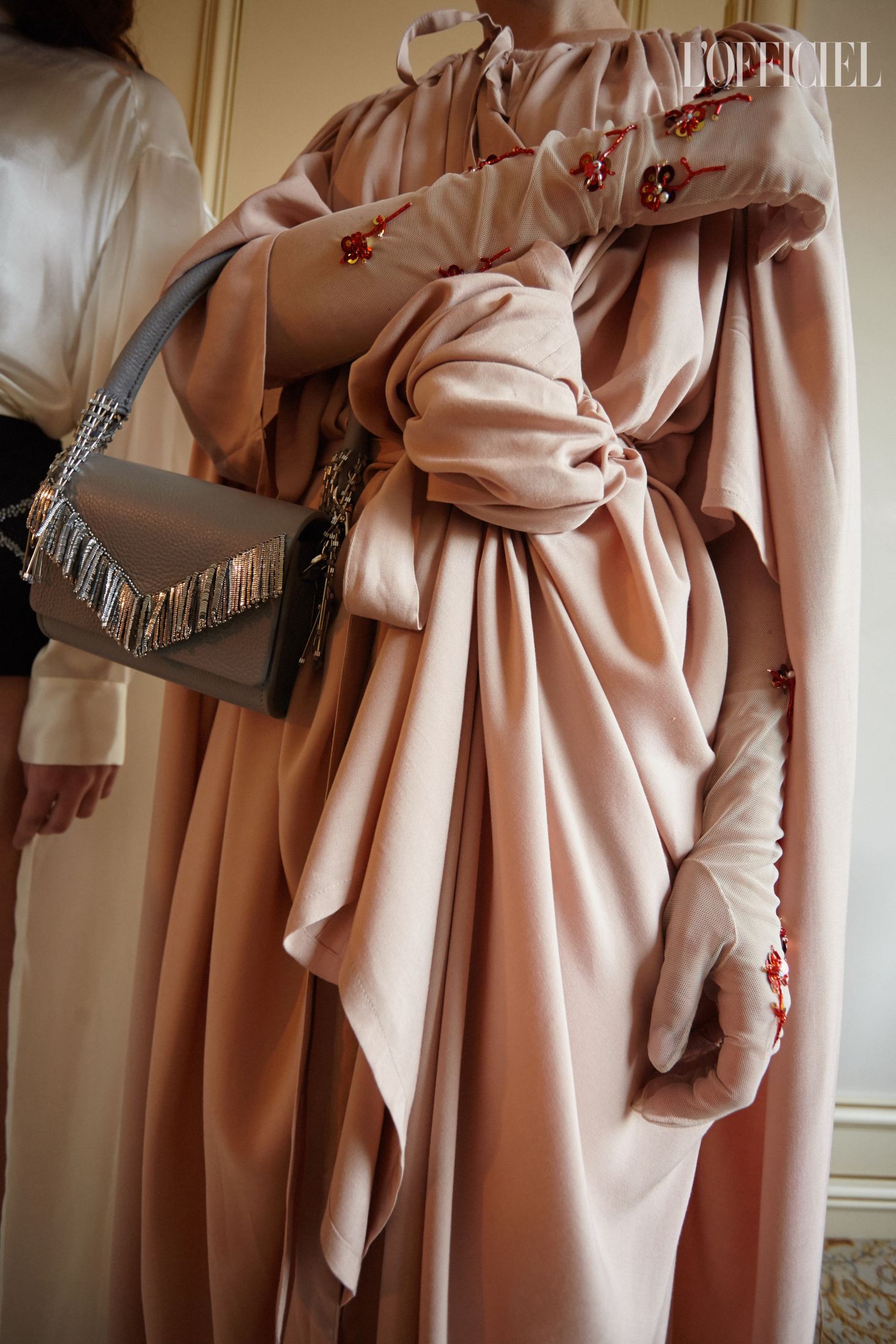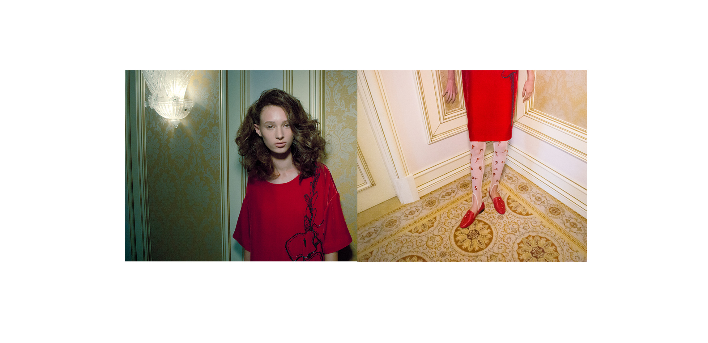 Крошечные цветы червоной руты — прямая отсылка к названию фильма — появляются не только на силуэтных платьях и невесомых юбках, но и на тонких длинных перчатках, и даже на шифоновых рейтузах. Флора здесь так же символична, как и красный цвет, без которого не обходится ни один показ дизайнера, — ведь эта коллекция о любви.