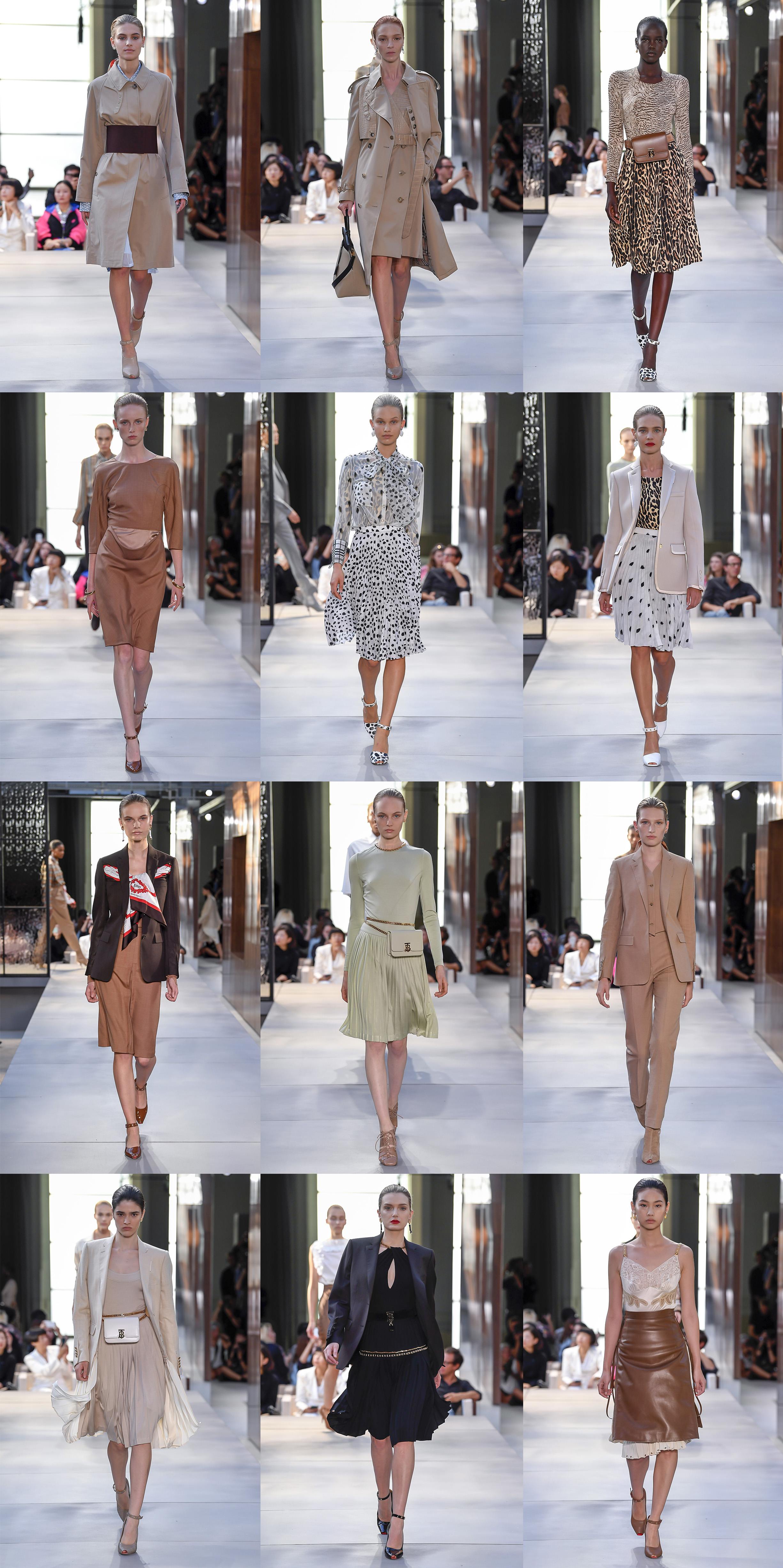 Показ открыл классический британский тренч песочного оттенка с широким шоколадным ремнем на талии, который читается как умелый стилистический прием Тиши. Эти линии — полоски разных цветов, в основном красные, белые и повторяющие анималистичный принт — проходят сквозь весь показ: в виде крокодиловых ремешков, свисающих до колен, как принт на рукавах и воротниках рубашек, как две петли для ног на юбках или диагональные полосы на мужских брюках. Тиши даже убирает из классической клетки Burberry вертикальный ряд линий, и теперь это совсем другой принт, но от этого не менее узнаваемый. Все эти четкие полосы здесь выступают как символ опрятности, что созвучно с традиционным представлением британцев о стиле и об одежде в общем.