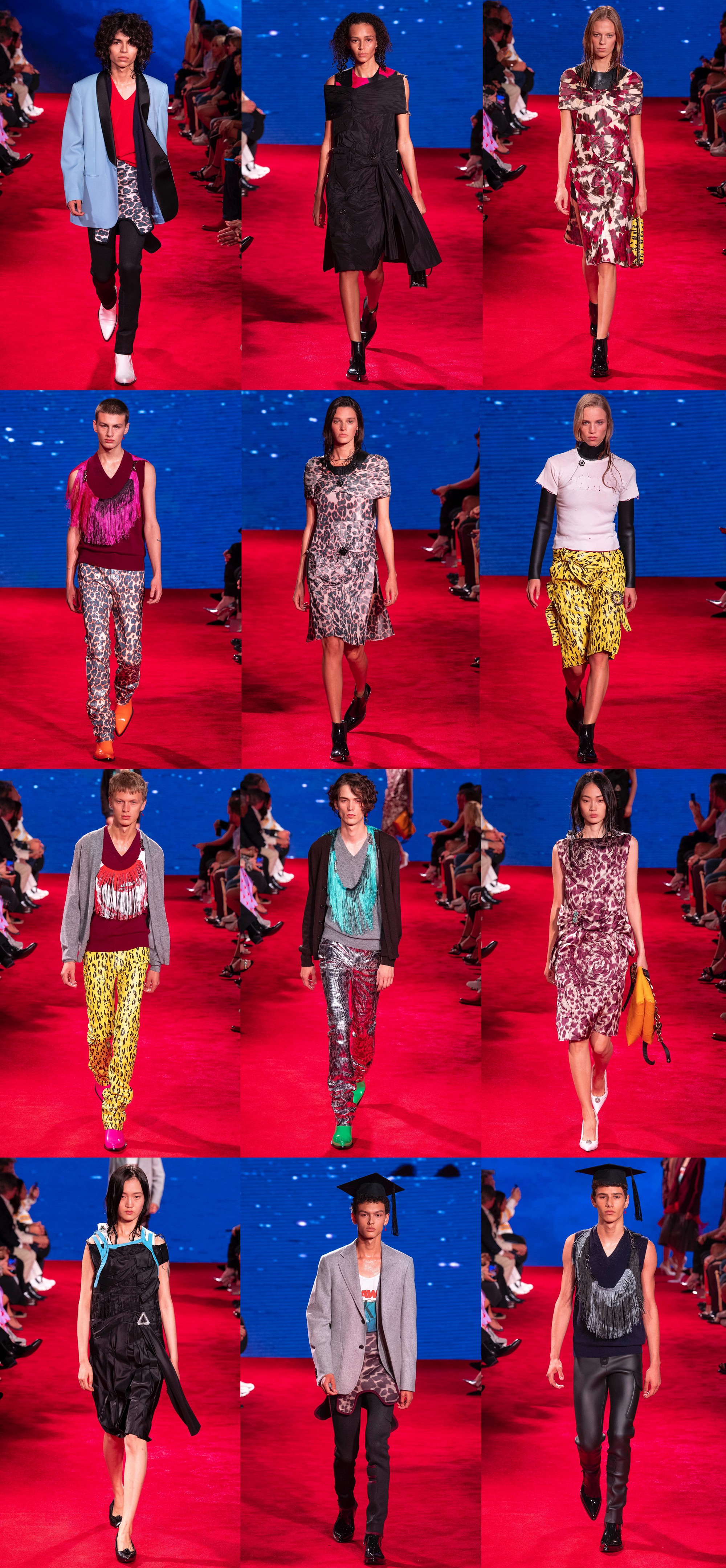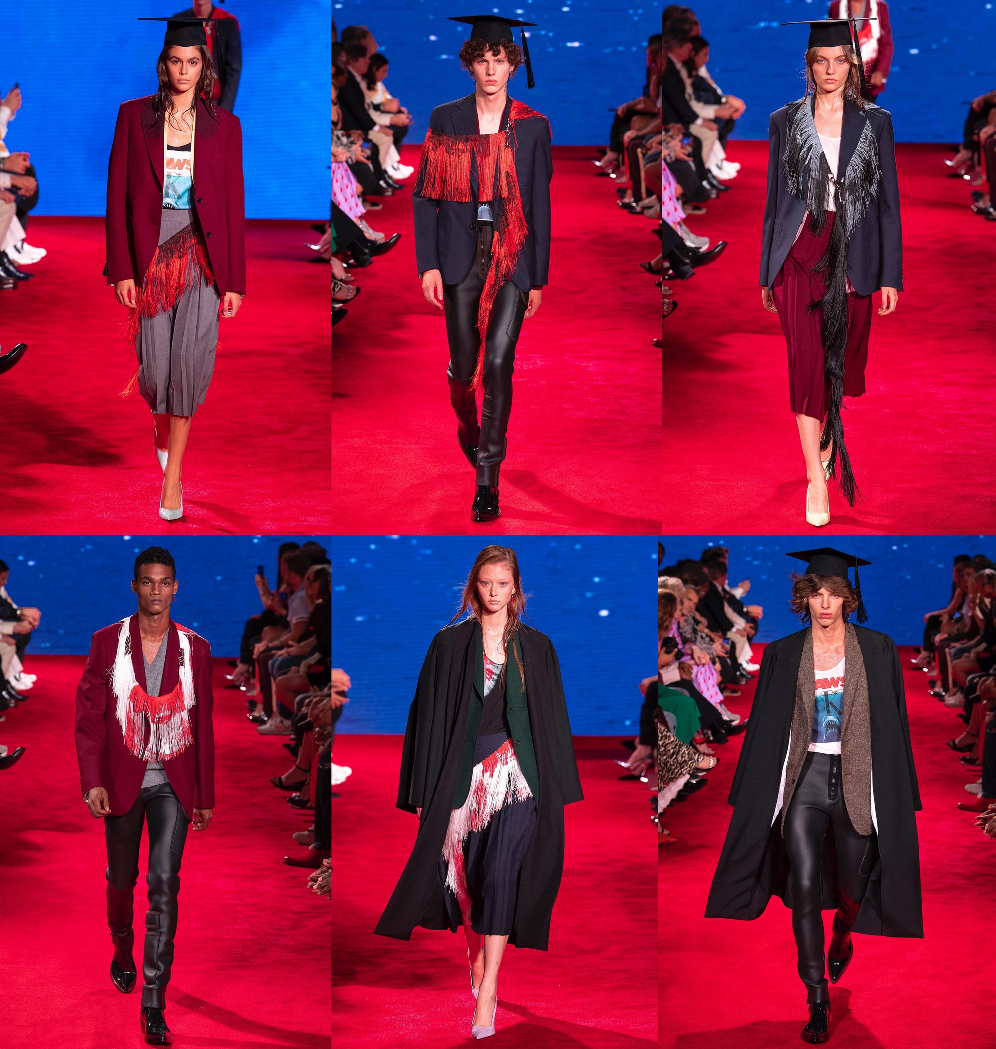Наряды выпускников тоже получил свой апгрейд: вместо лент — разноцветные пояса из бахромы, надетые на шею или через плечо, вместо классических брюк — неопреновые лосины, а вместо мантий — черные оверсайз пальто.