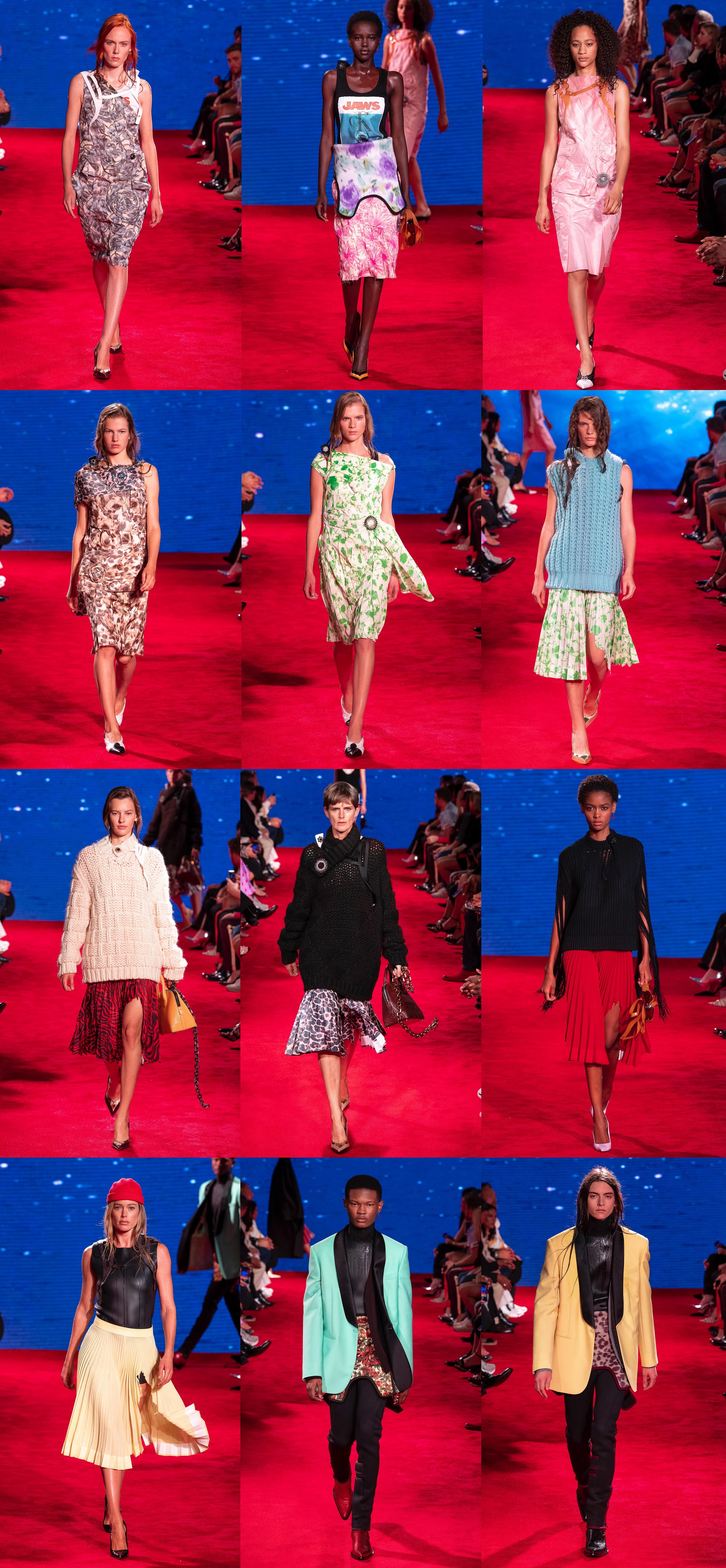 Фильмы Раф Симонс цитировал почти буквально: оригинальный постер к “Челюстям” стал принтом для футболок и топов, а главными головными уборами — шапочки для плавания и конфедератки. Модели с мокрыми волосами выходили на подиум словно прямиком из схватки с акулами — в коротких ковбойках, расстегнутых гидрокостюмах, которые использовались вместо мини-юбки, а также в плиссированных миди с “укушенным” подолом, которые сочетались с объемными шерстяными свитерами.