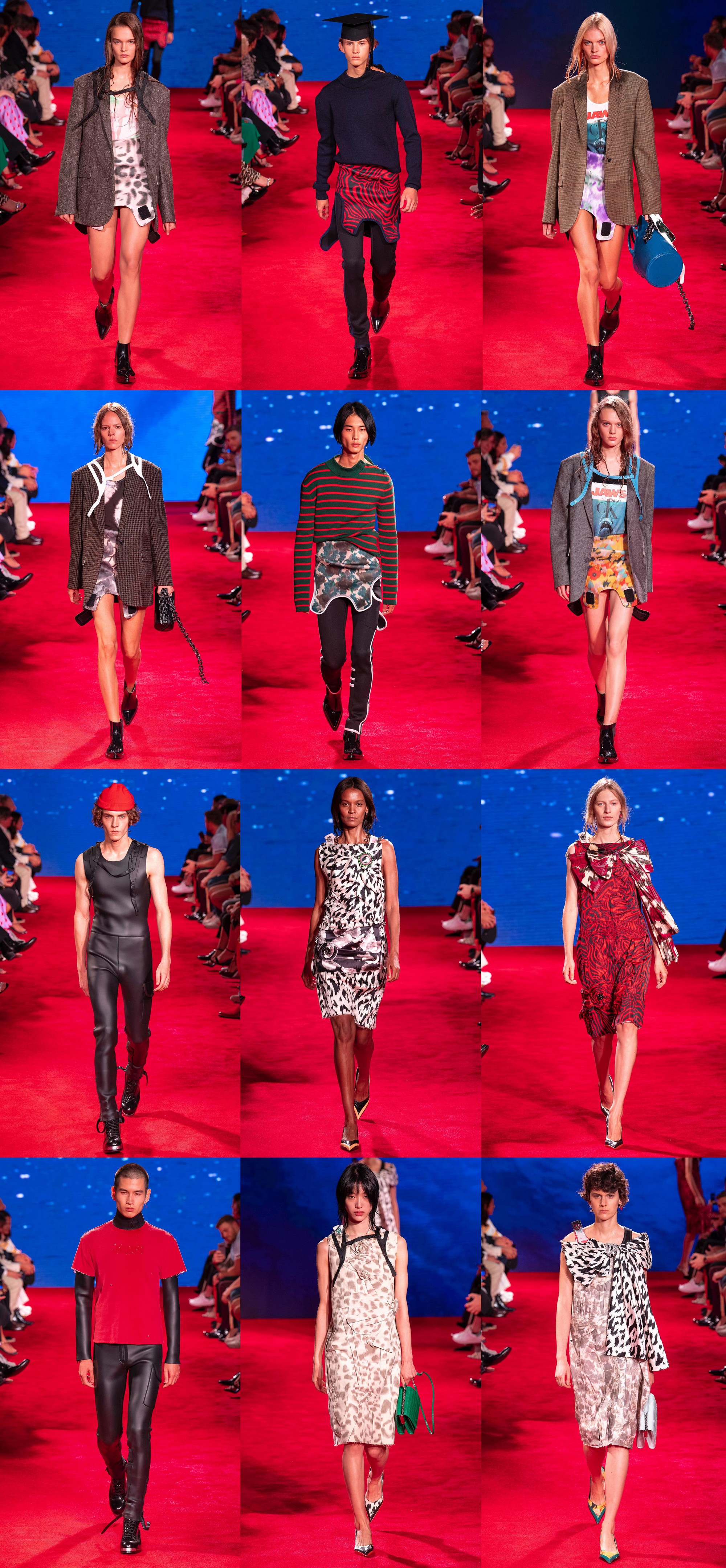 За почти два года работы в Calvin Klein Раф Симонс успешно доказывает, что американская культура, в особенности массовая — это бездонный колодец, из которого можно черпать идеи. Для новой коллекции он взял за основу два образца классики американского кинематографа: “Выпускник” 1967 года с молодым Дастином Хоффманом в главной роли и “Челюсти” 1975 Стивена Спилберга. Саундтрек последнего, который принес Оскар кинокомпозитору Джону Уильямсу, стал музыкальным сопровождением для показа. Атмосферу саспенса добавлял и традиционный для показов Рафа сет-дизайн — словно залитый кровью, выкрашенный в красный зал был разбавлен плазменными экранами по периметру с трансляцией бурлящей воды.