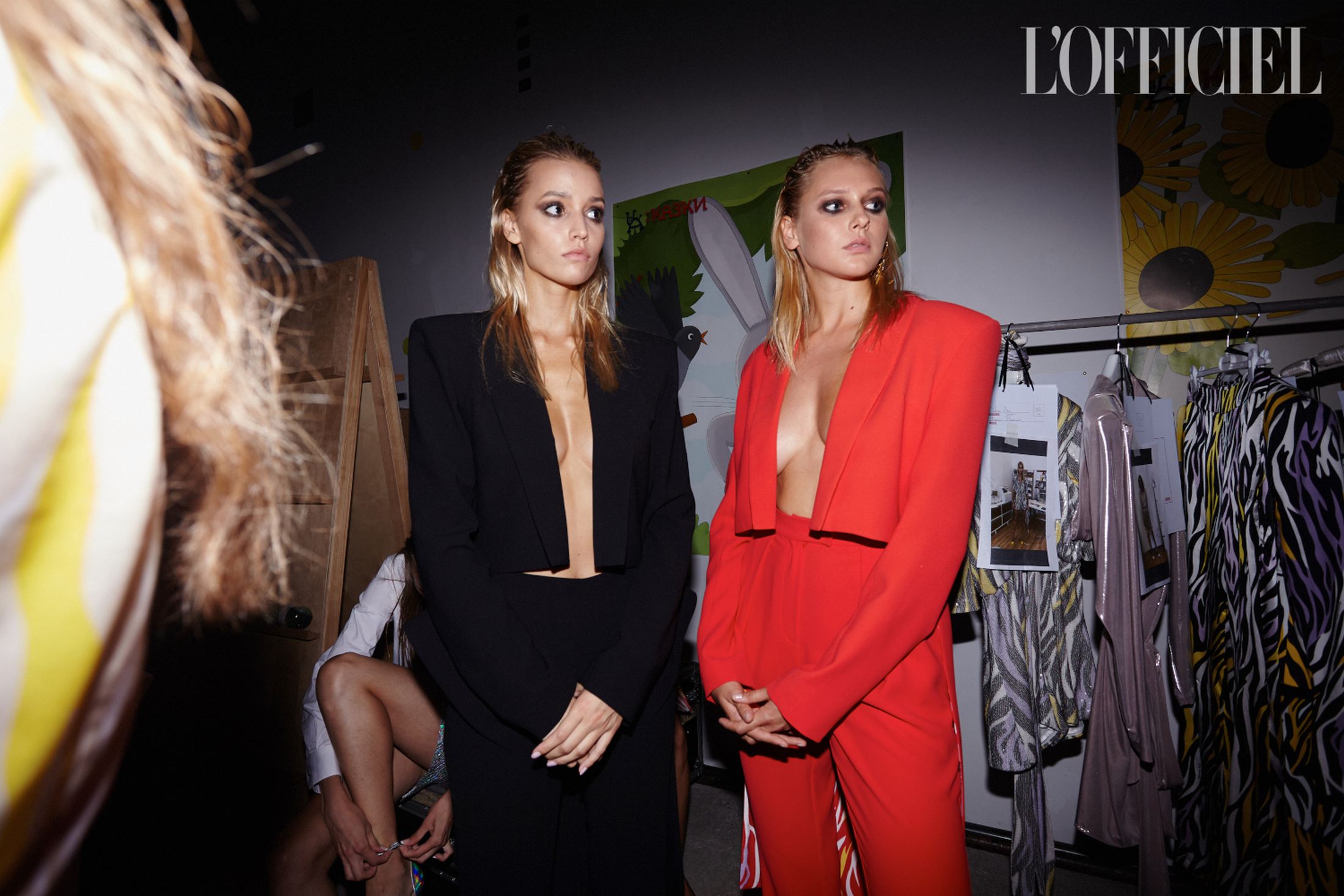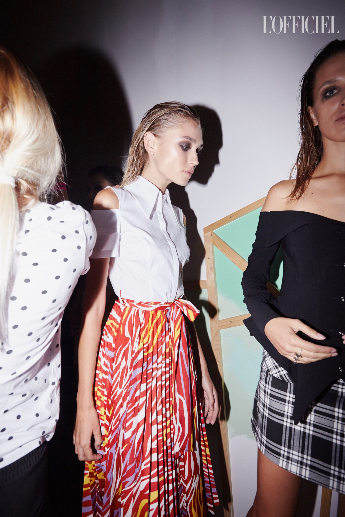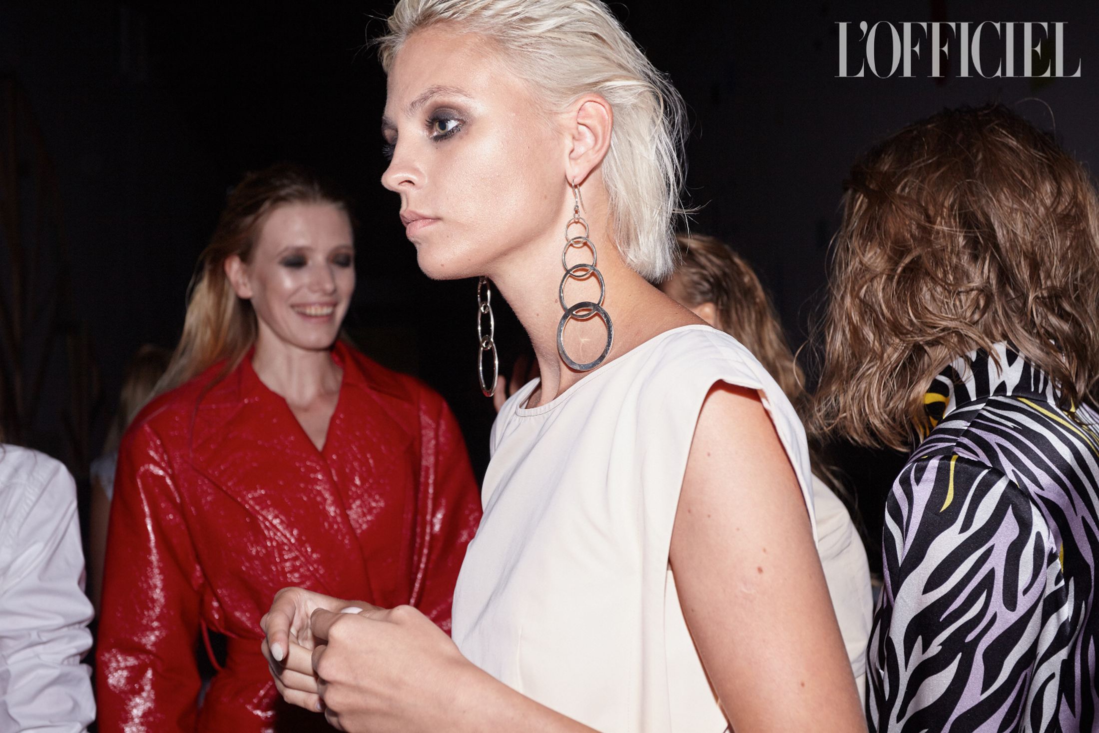 Фраки на голое тело, плащи из красной лакированной и голографической экокожи, костюмы из шелка, словно усыпанного глиттером, платье с рукавами-буфами и из блестящего шифона с капюшоном цитировали разноплановые образы Грейс с вечеринок 70-х годов. Завершала показ серия нарядов для особых случаев: вечерние шелковые костюмы, комбинезоны с акцентированными плечами и глубоким декольте, а также платья в пайетках — все запринтованные "зеброй".