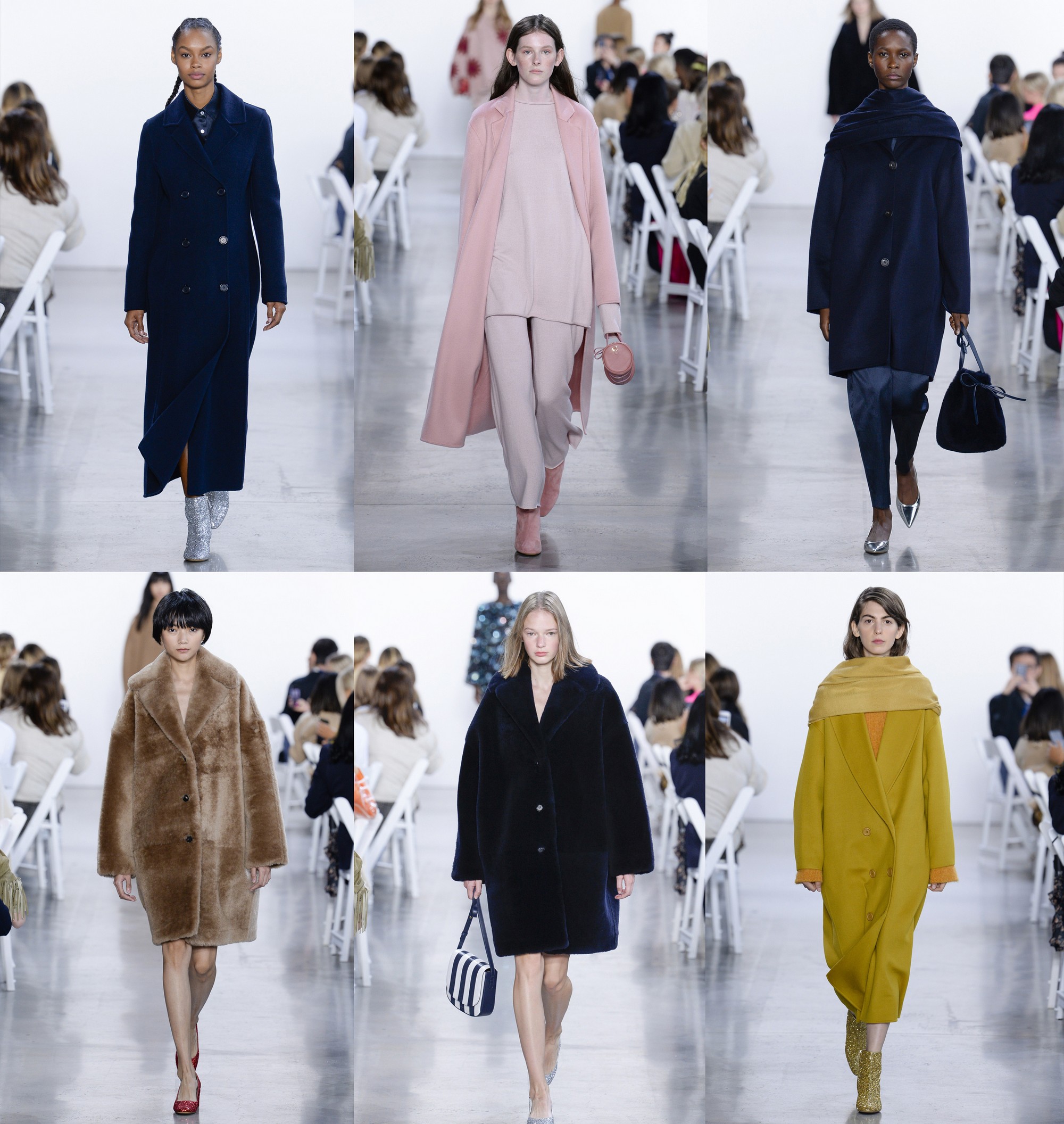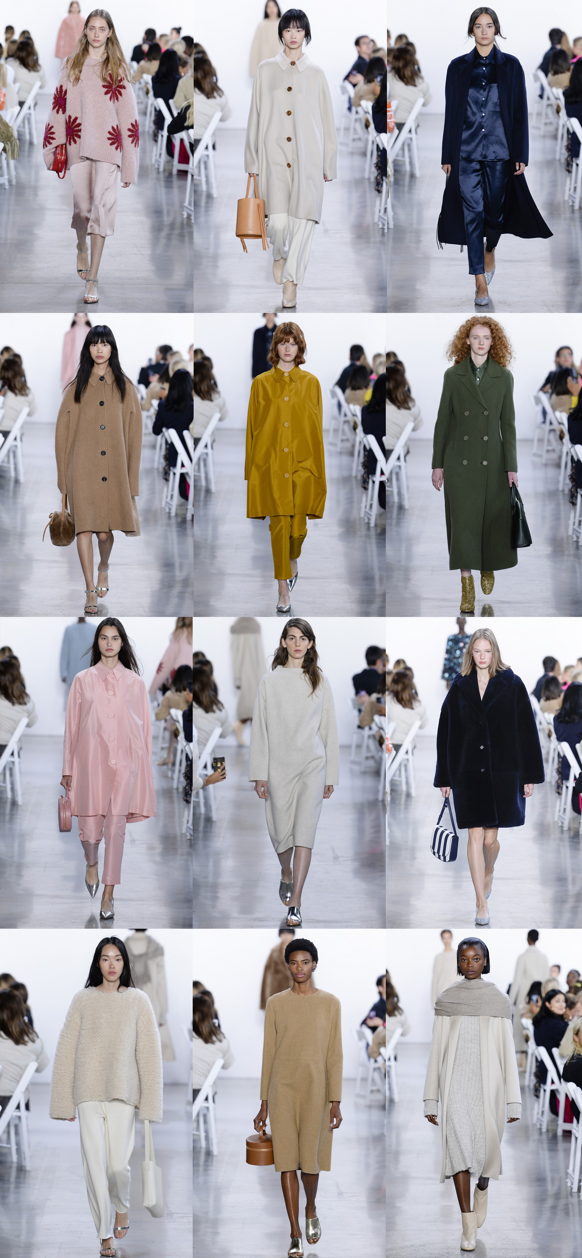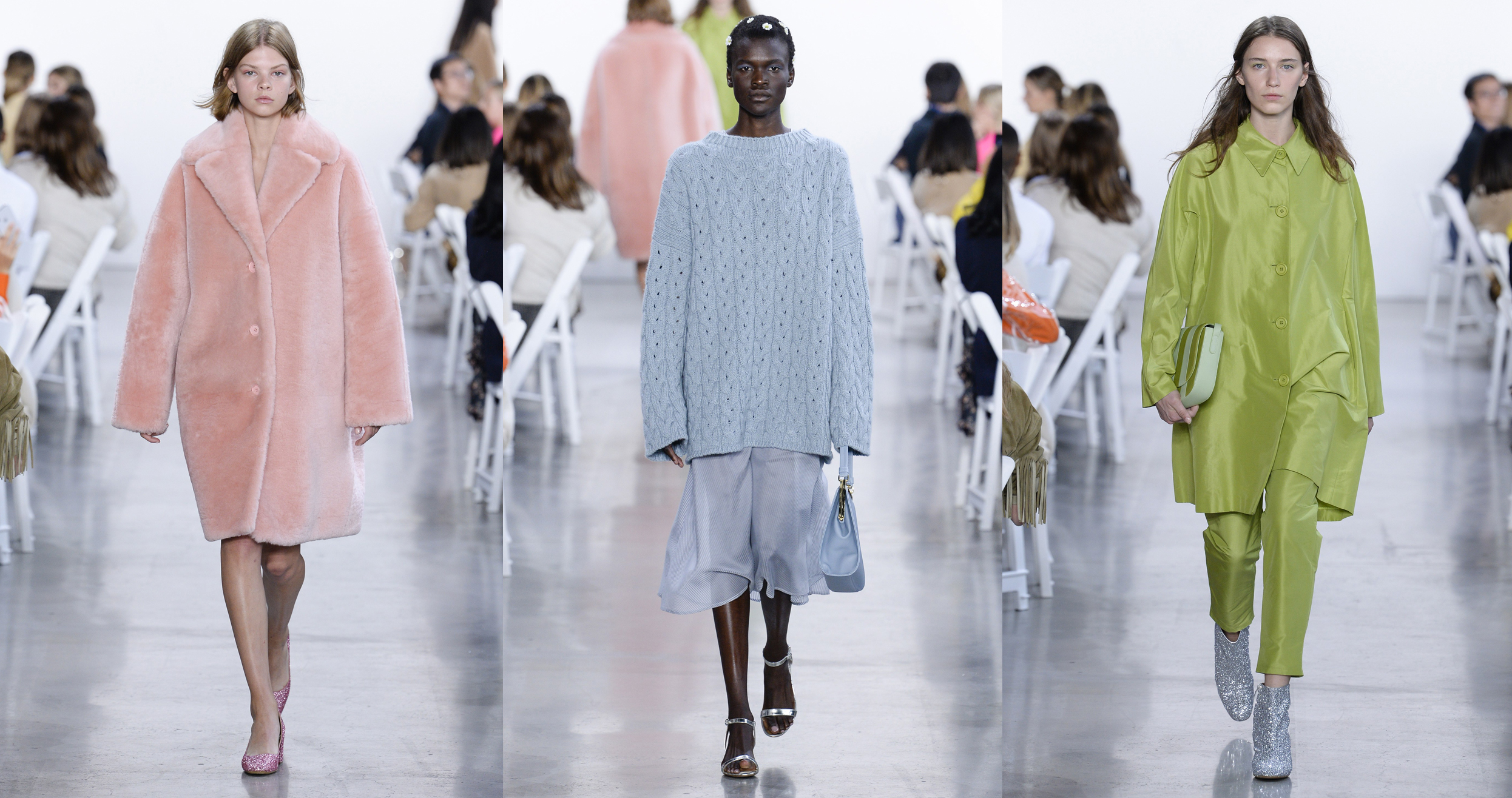 В новой коллекции, которую можно купить сразу после показа, Mansur Gavriel продолжили идеи, с которыми запускали линию одежды. Показ открыли модели, одетые с ног до головы в бежевые и светло-серые оттенки, — уютные пальто из шерсти, кашемировые туники, вязаные платья и уютные объемные свитера дизайнеры предлагают носить под шелковые кюлоты и свободные брюки. Вслед за ними пролились пастельные краски — розовая, голубая и зелёная — на мягкие пальто из искусственного меха, на атласные костюмы, шифоновые юбки и плащи. Все выглядело так, будто кто-то открыл коробку, полную пирожных из французской кондитерской Ladurée, которые, к слову, послужили главным украшением сет-дизайна показа.