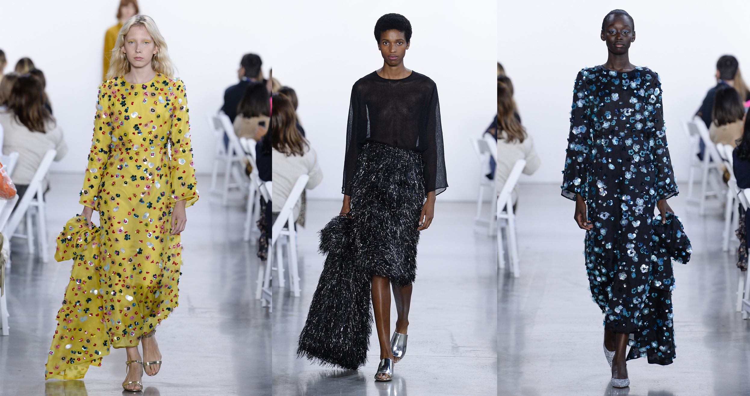 В череде всех этих уютных и тёплых вещей неожиданными стали вечерние платья — их было всего три. Первая пара — будто близнецы: одно дизайнеры сшили из ярко-желтого шелка и расшили разноцветными наивными цветочками из бисера, а второе — как в негативе, из черного шелка с нежно-голубыми цветами. Показ завершил total-black-образ: модель нарядили в прозрачную кофту с длинными рукавами и пушистую юбку-карандаш из серебристых перьев.