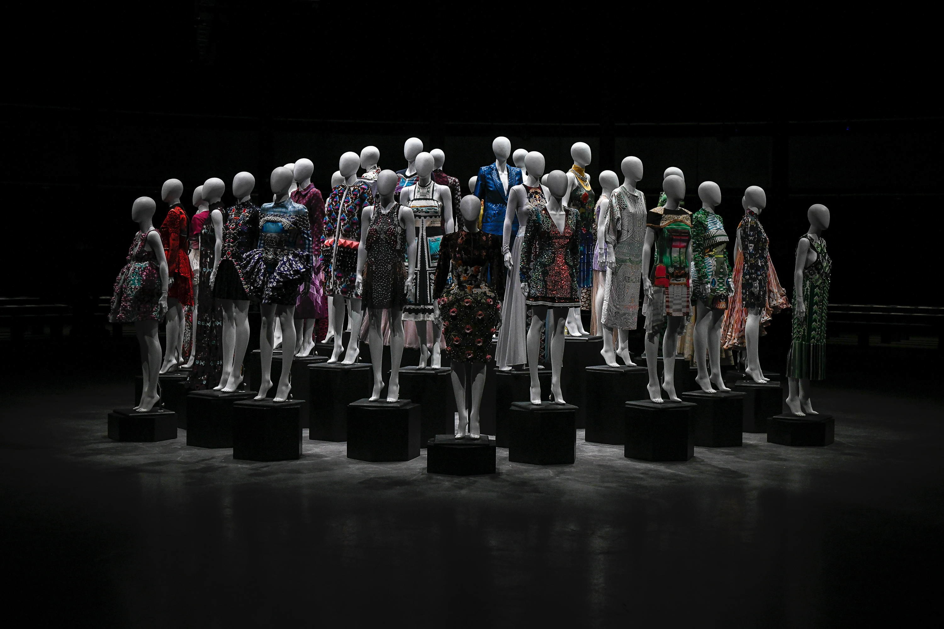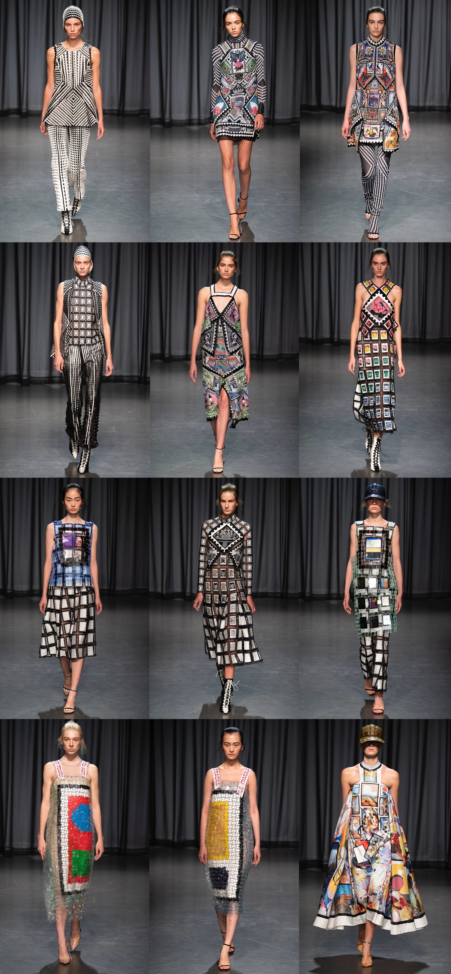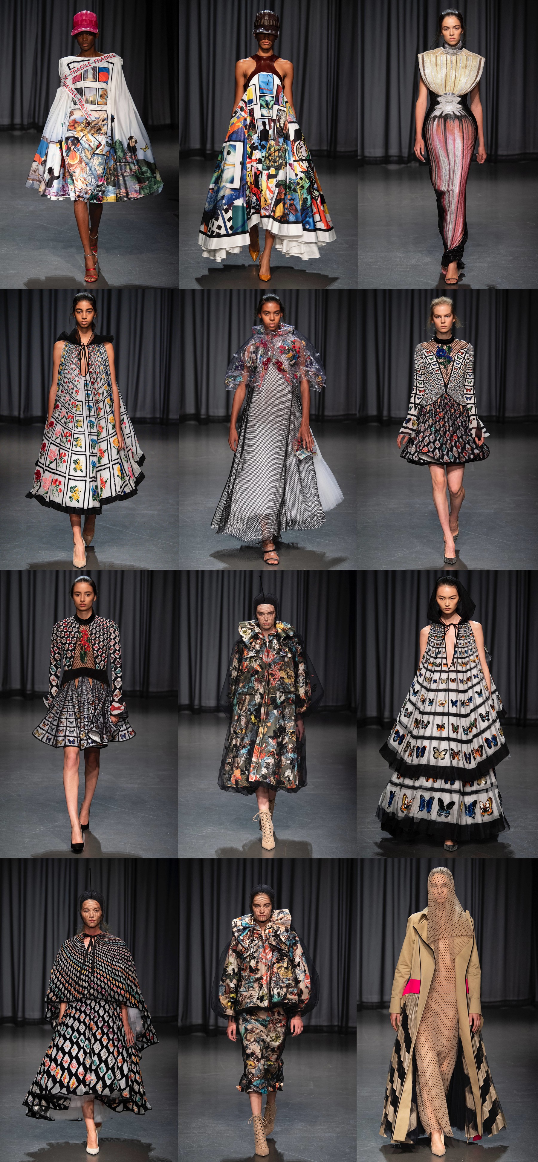 Первый блок платьев, усыпанный почтовыми марками и банкнотами, цитирует коллекцию Mary Katrantzou весна-лето 2013. В этот раз дизайнер располагает марки в порядке сетки, а в промежутках пришивает полоски прозрачного кружева. Когда модели шли по подиуму, они мерцали вышивкой из крошечных песчинок бисера. Дальше — цветочный блок: дизайнер высадила цветы на объемных плащах, пышных платьях А-силуэта с капюшонами и воздушных юбках. Иногда их сменяли насекомые — бабочки и жучки, — но после десятка просмотренных подряд нарядов вынуждены признать, что различить, что именно изображено на принтах, весьма трудно.