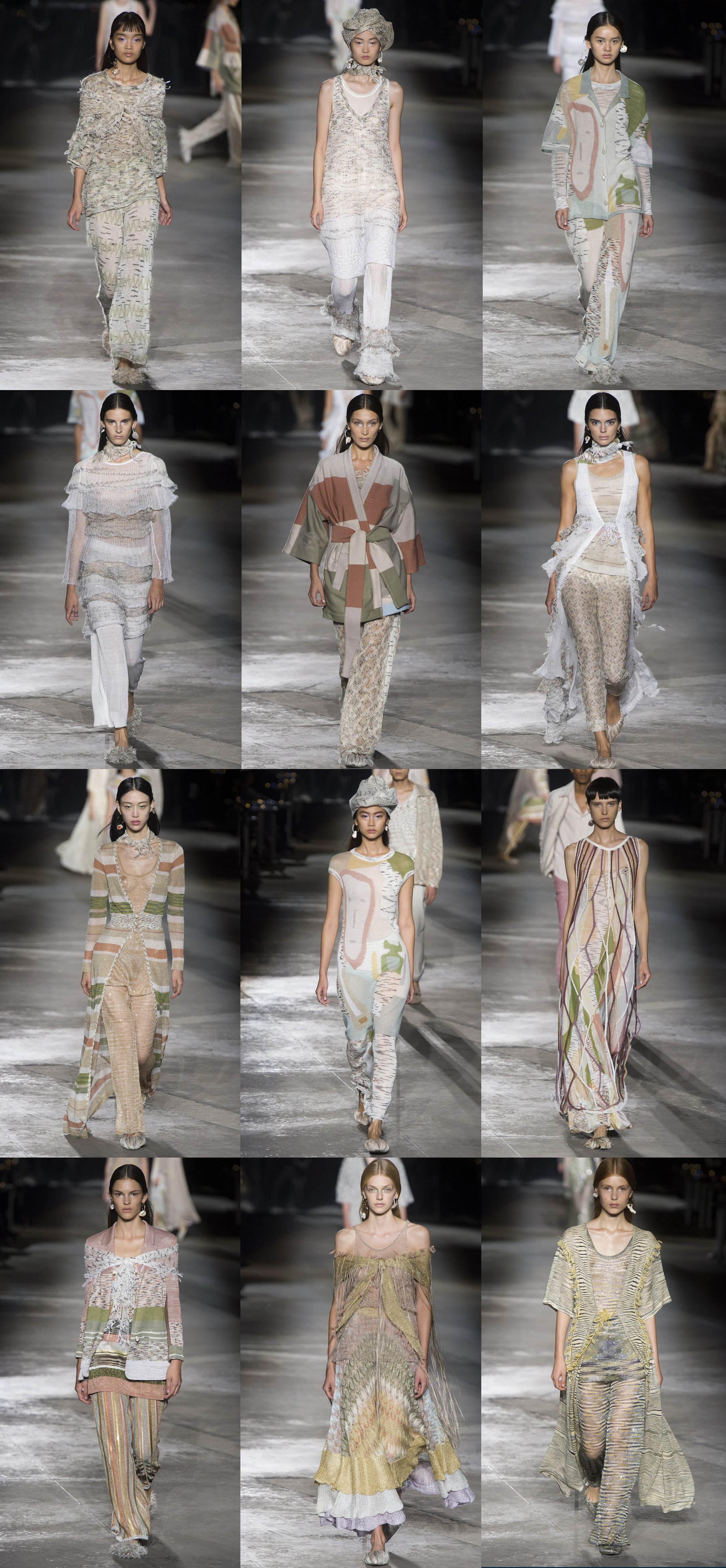 Коллекция весна-лето 2019 у Missoni получилась с очень выдержанной цветовой гаммой: белый цвет с вкраплениями светло-серых узоров постепенно перешел в выбеленные пастельные оттенки, которые к концу показа приобрели насыщенность и завершились классическим денимом. Анджела Миссони сделала ставку на многослойность – трикотажные полосатые накидки и кейпы она предложила носить поверх полупрозрачных костюмов и пэчворк-платьев. Мужские образы получились еще более лаконичными – полосатые костюмы, дополненные V-образными свитерами в тон, брюки и куртки из светло-голубого и бледно-розового денима и рубашки свободного кроя.