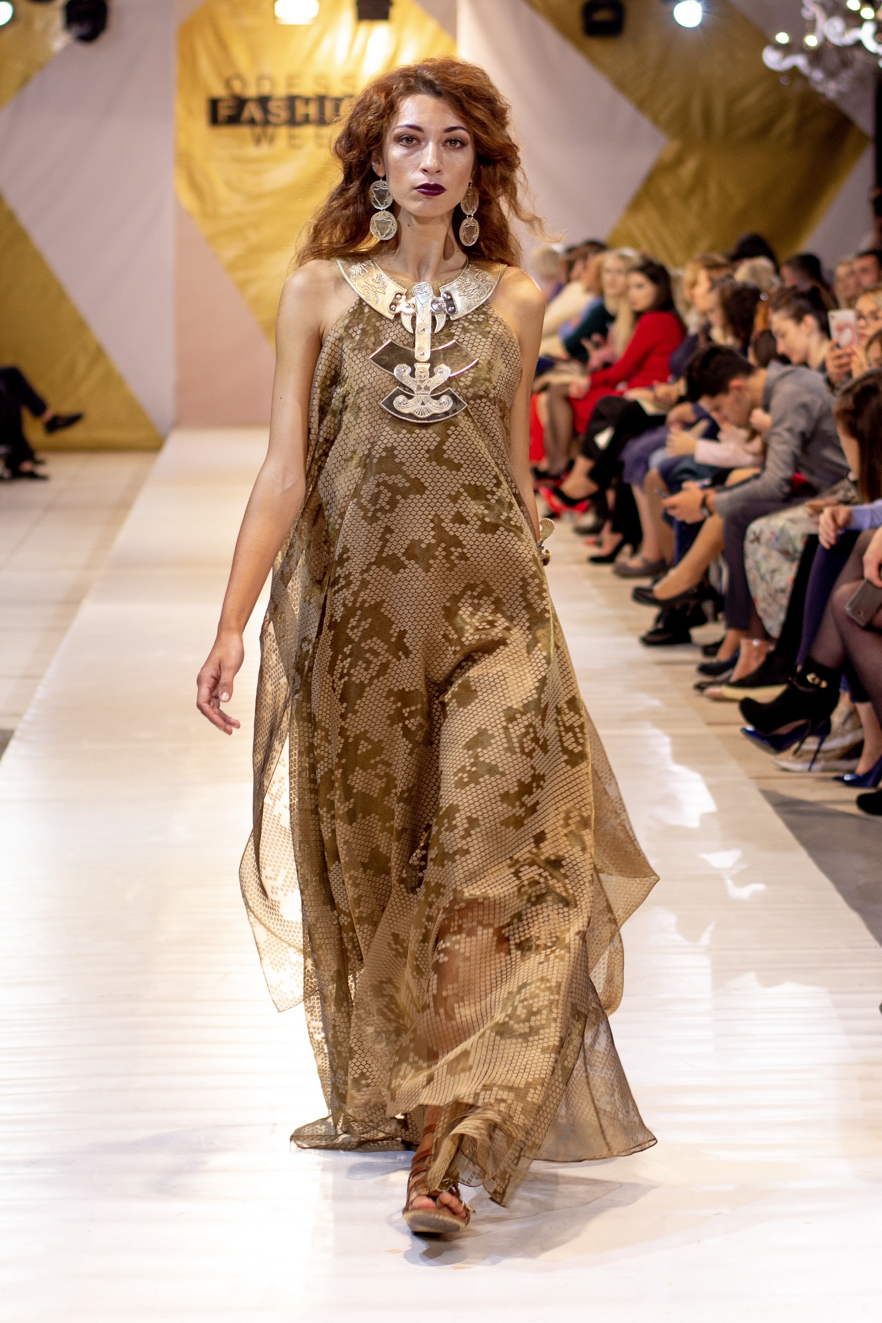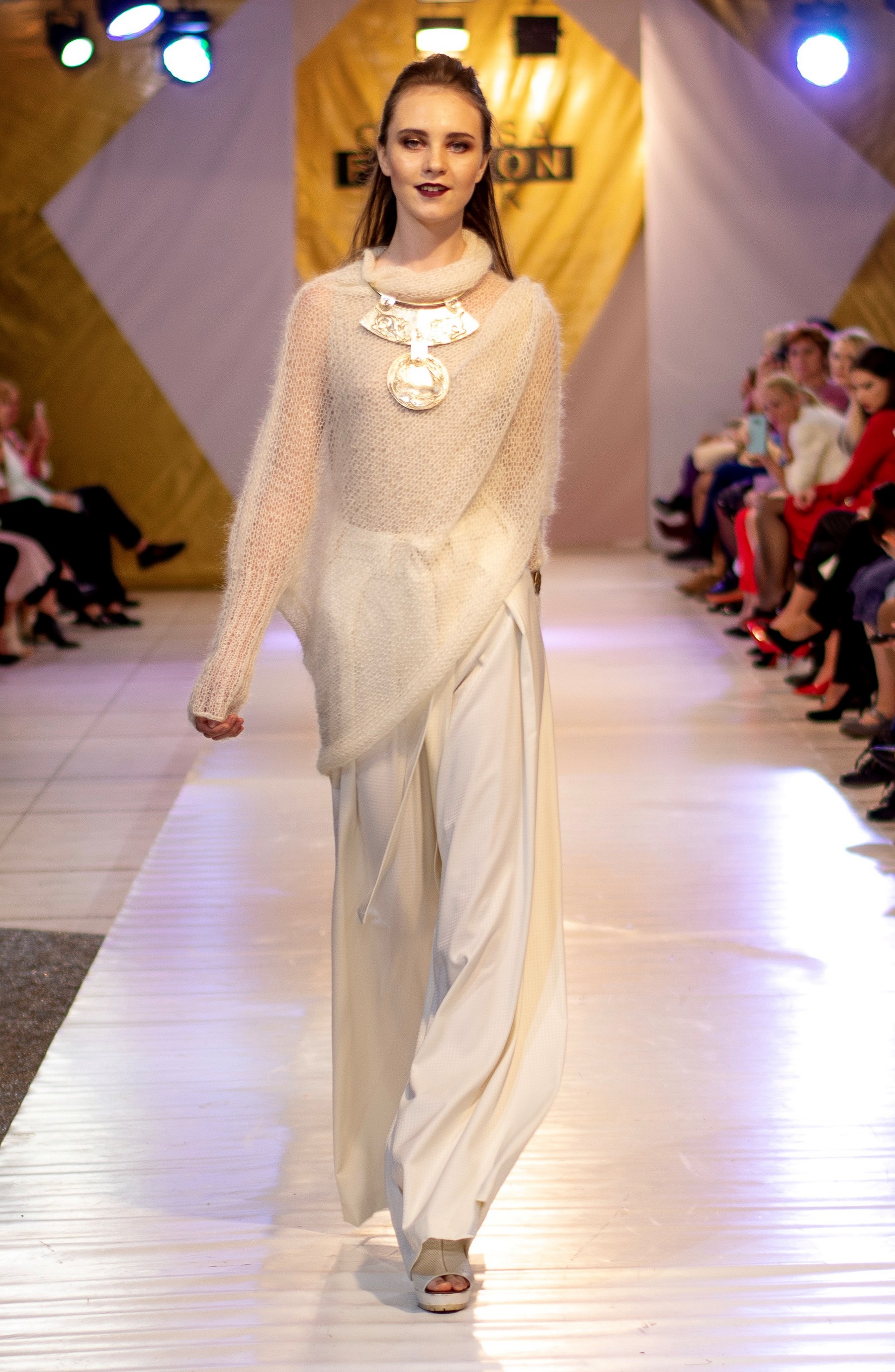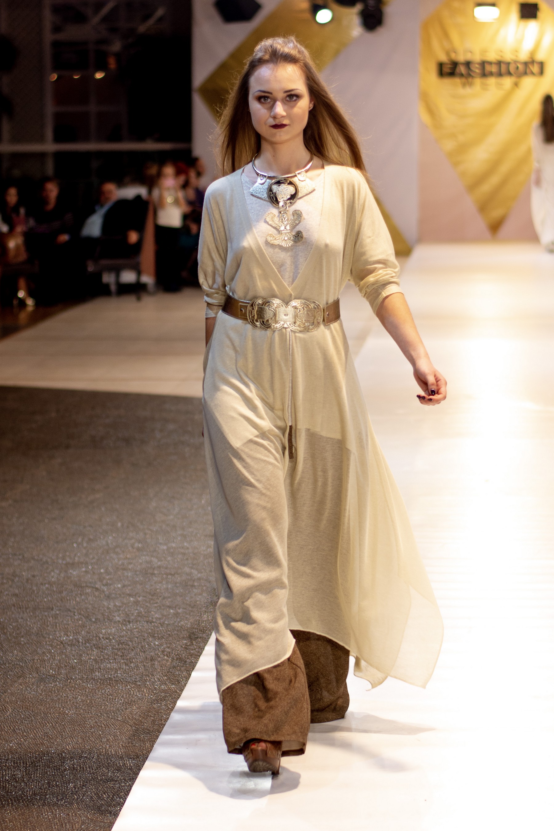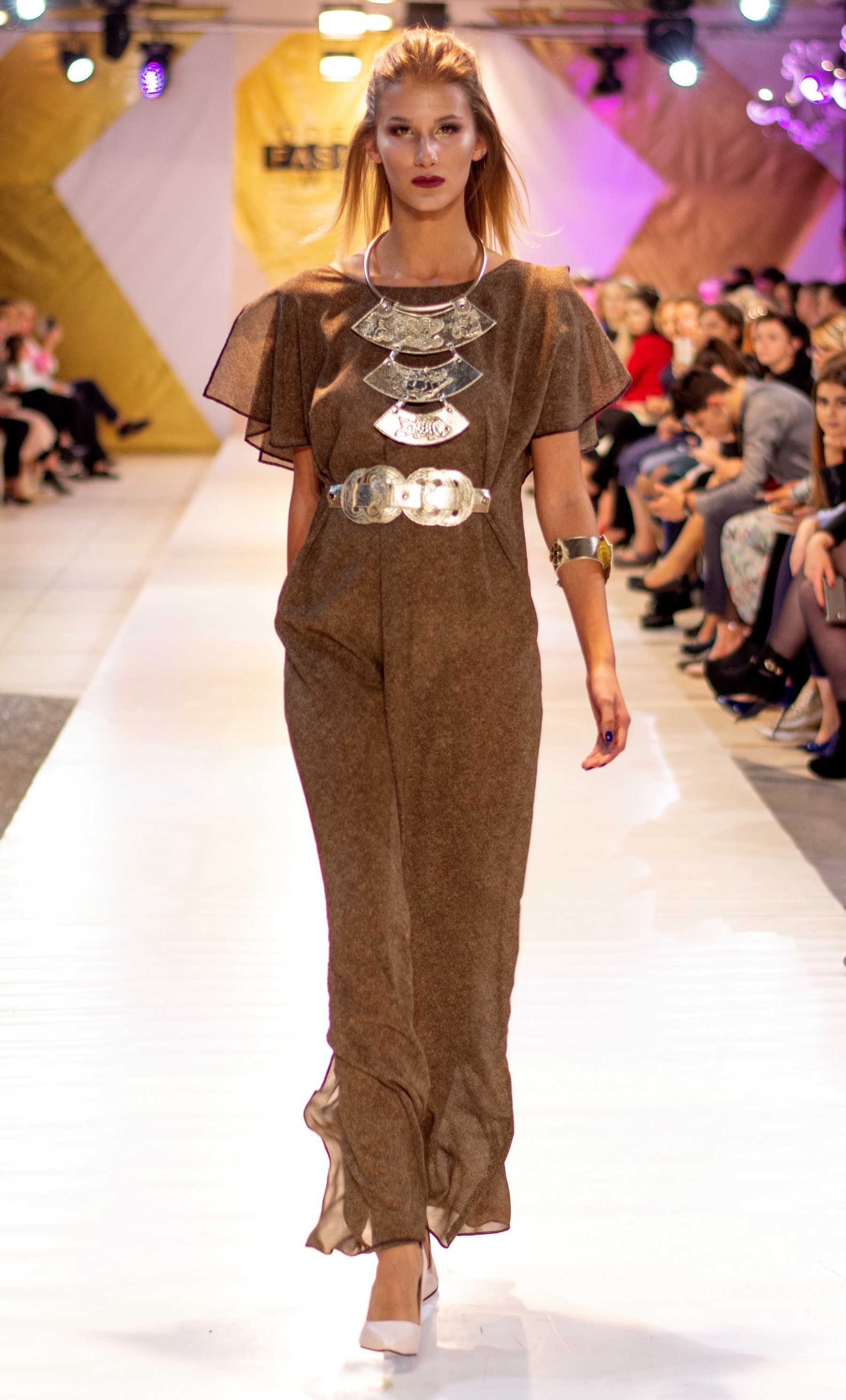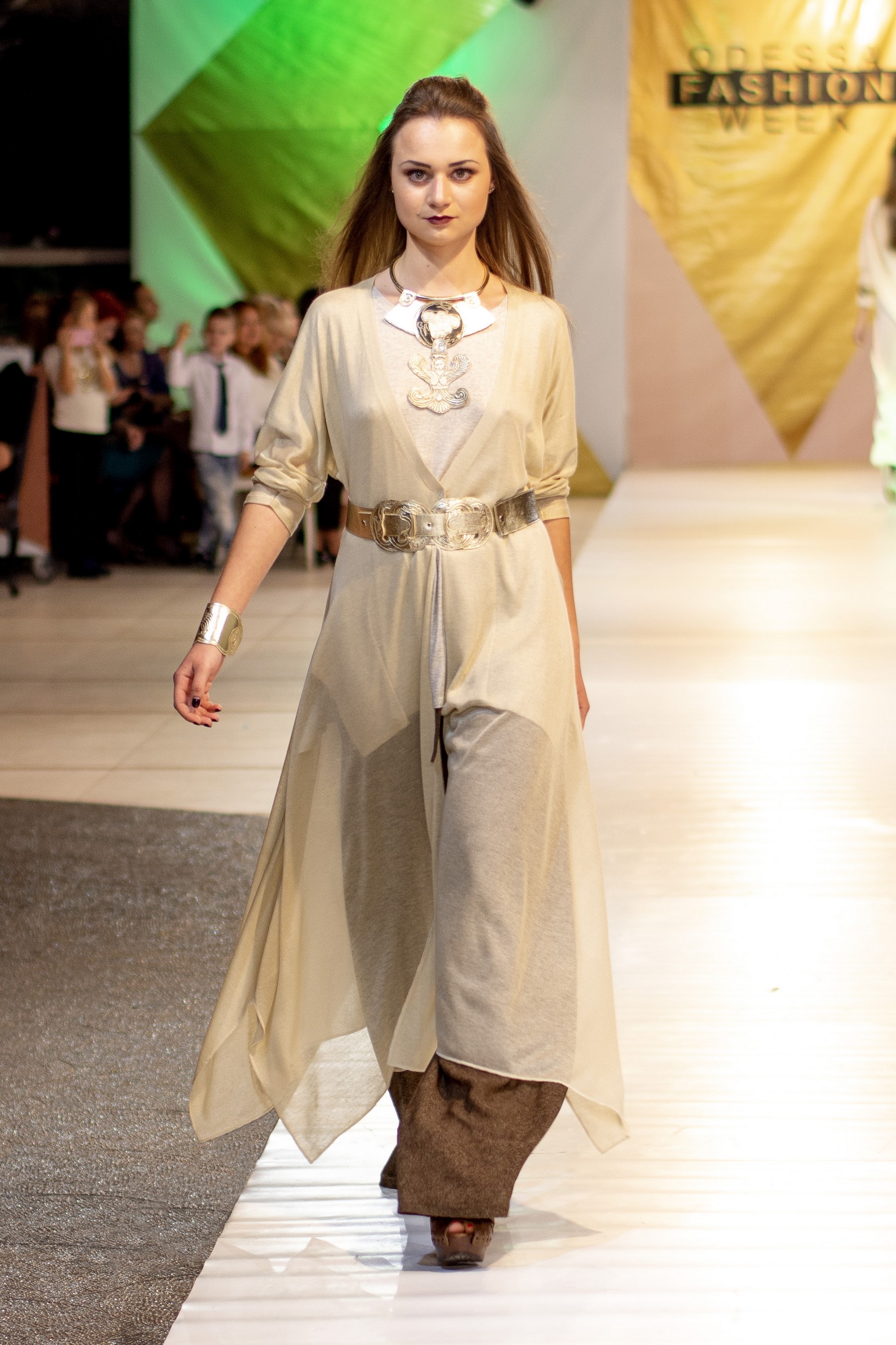 Коллекция бренда Elen Godis пронизана теплым светом осеннего солнца и посвящена загадочной истории скифов. Назвав ее "Скифское золото", дизайнер комбинировала мягкую белую шерсть с органзой медового цвета и шифоном шоколадного оттенка. А браслеты, пояса и колье украсили изображения сказочных грифонов, пантер и золотых оленей.