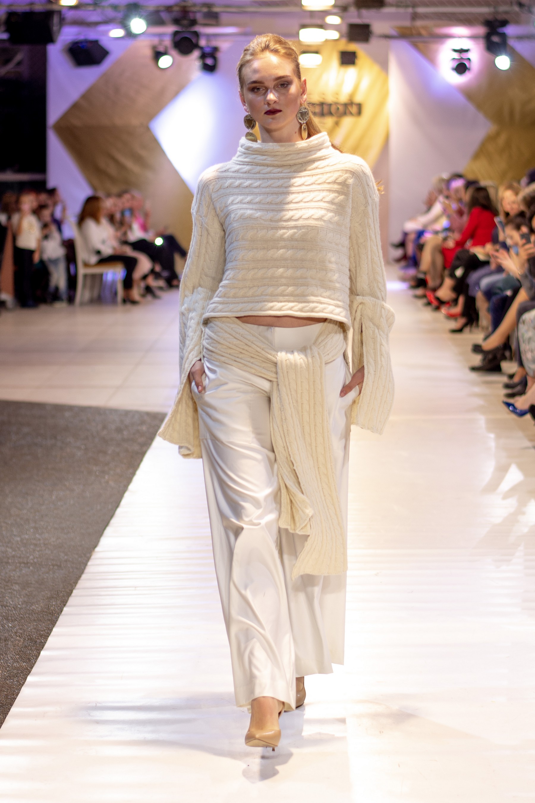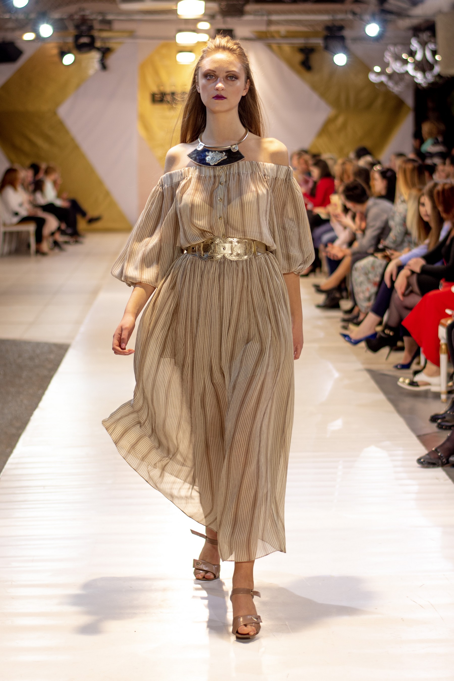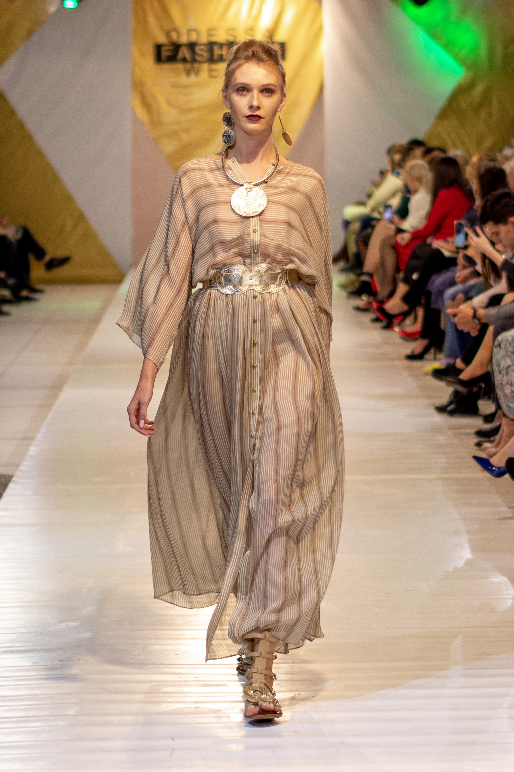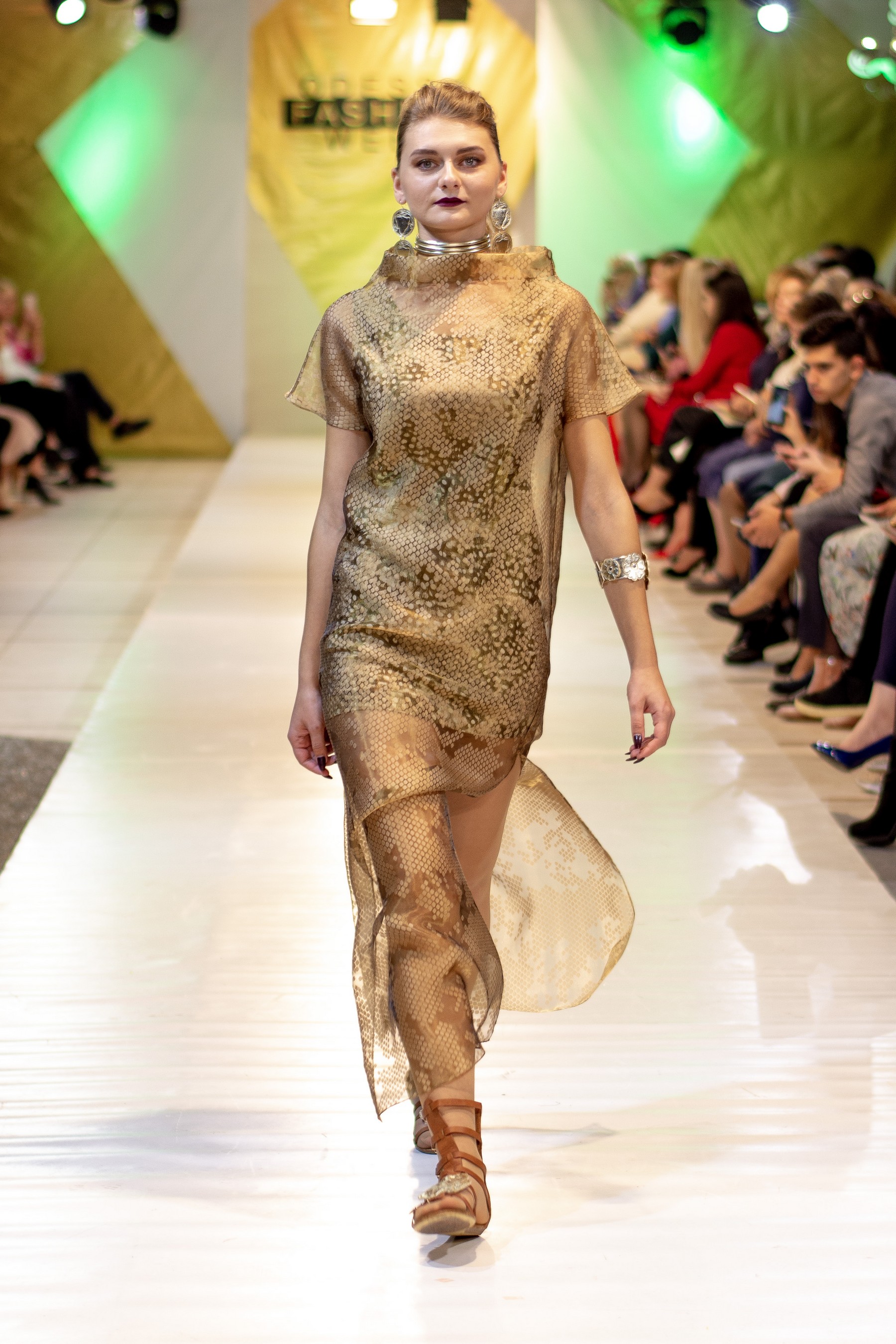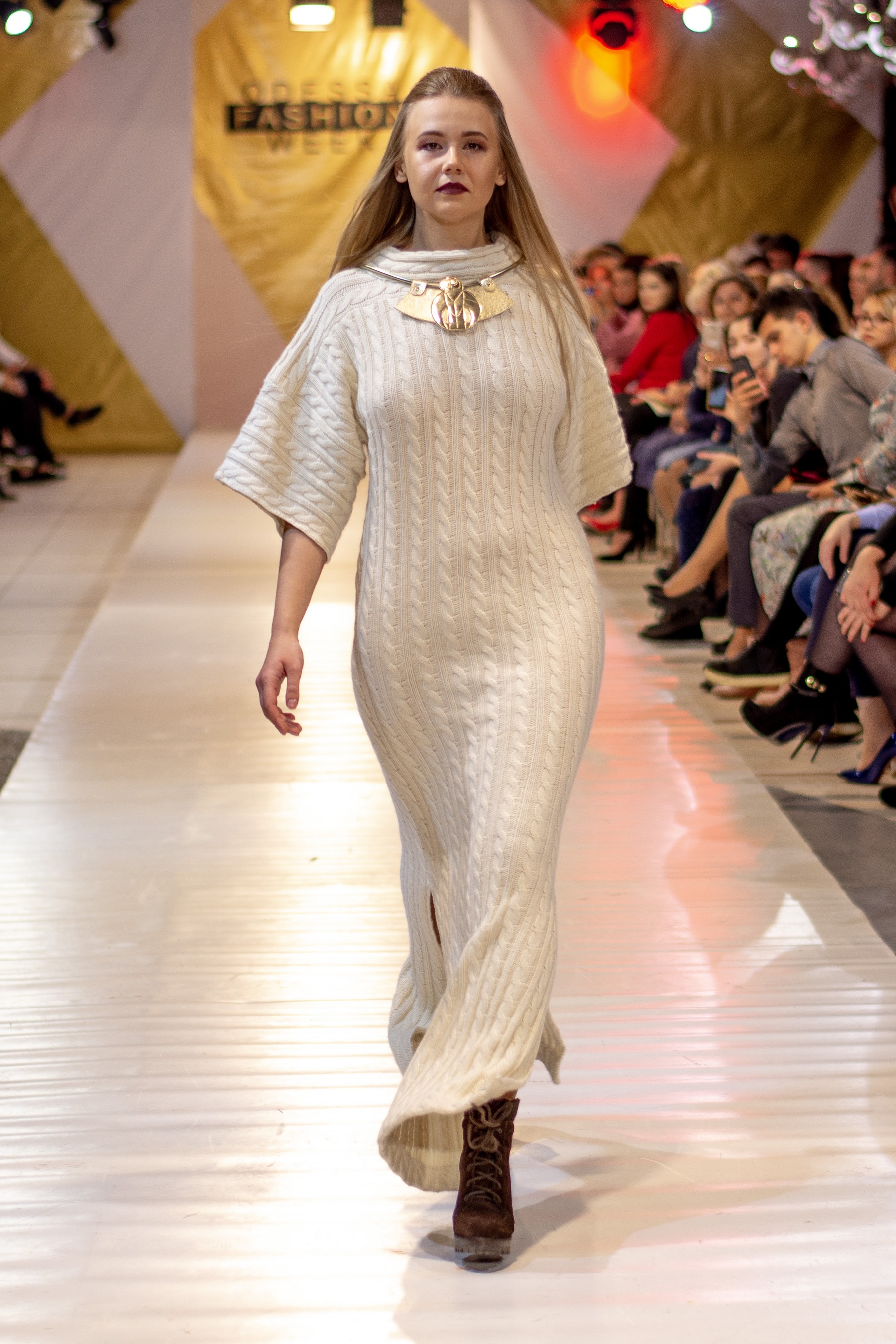 Коллекция бренда Elen Godis пронизана теплым светом осеннего солнца и посвящена загадочной истории скифов. Назвав ее "Скифское золото", дизайнер комбинировала мягкую белую шерсть с органзой медового цвета и шифоном шоколадного оттенка. А браслеты, пояса и колье украсили изображения сказочных грифонов, пантер и золотых оленей.