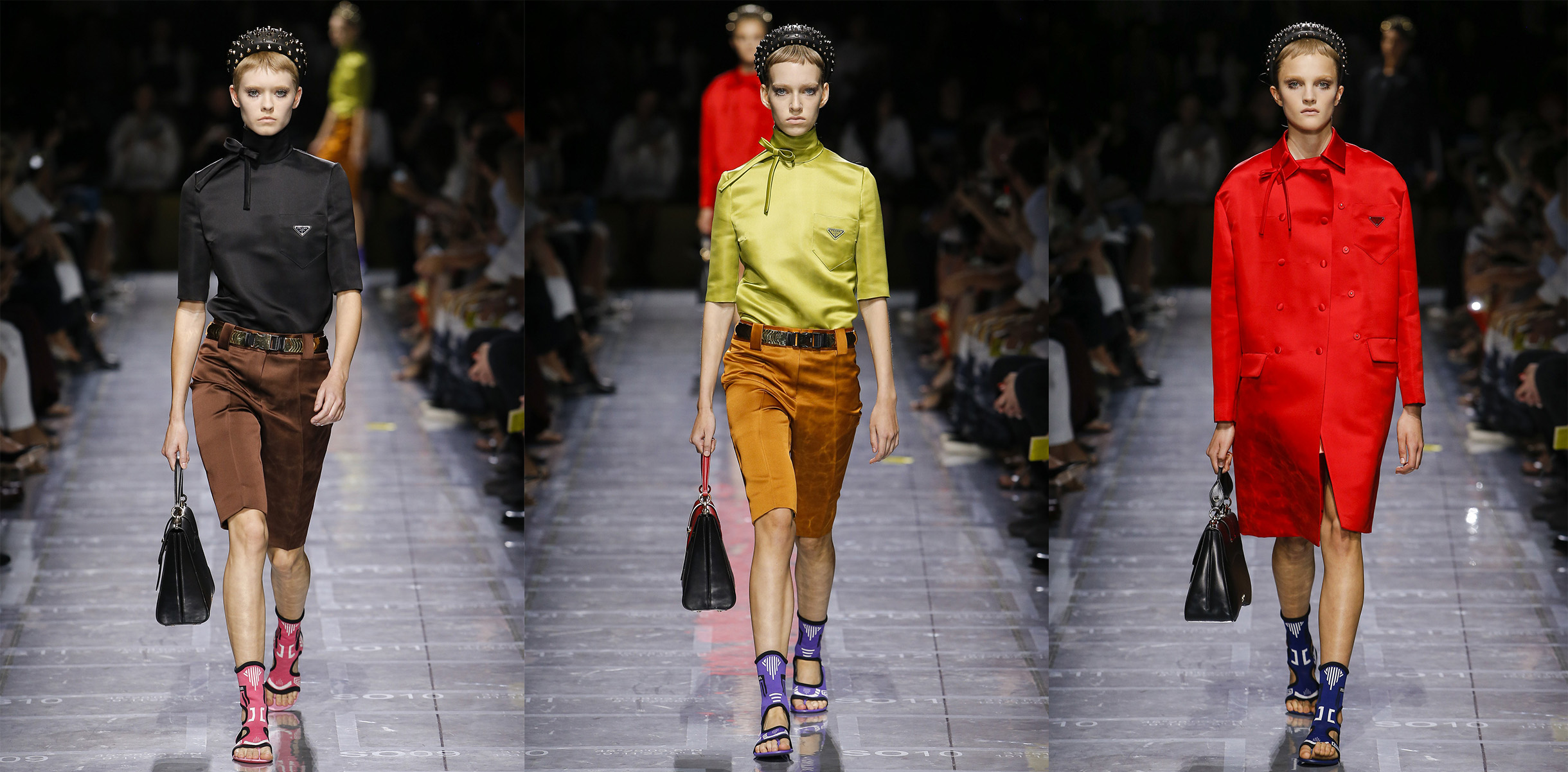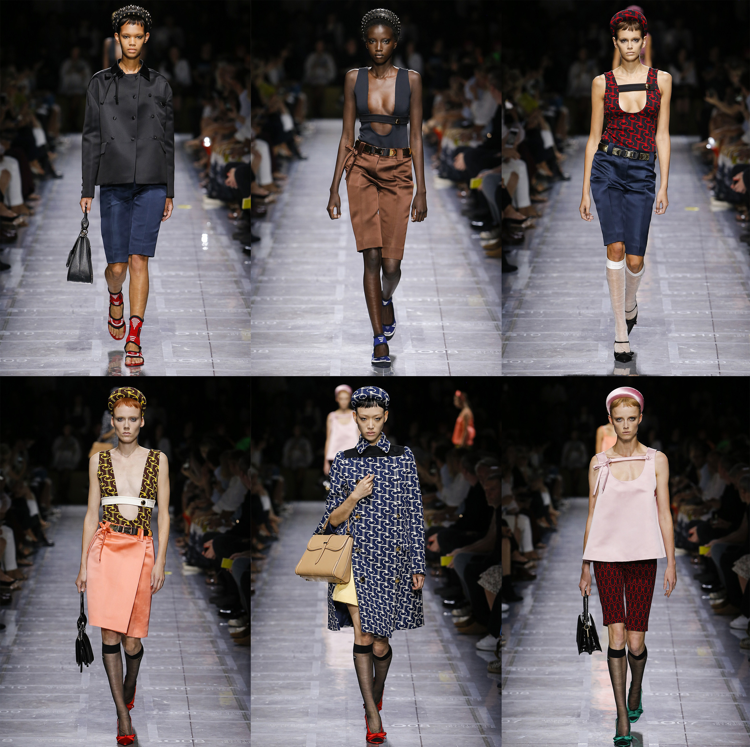 Следом коллекция приобретает краски: Миучча ведет зрителей от классической цветовой гаммы Prada конца 80-х — начала 90-х до ярких и полных принтов 00-х и 10-х. Во втором блоке коллекции появляются те же боди с глубокими вырезами, но уже с юбками — силуэтными и летящими. Прада показывает идеальное пальто — такое же кукольное, как и платья, и даже немного буржуазное. На нем принт пейзажа с миланским видом — современная архитектура, сад и женщины.