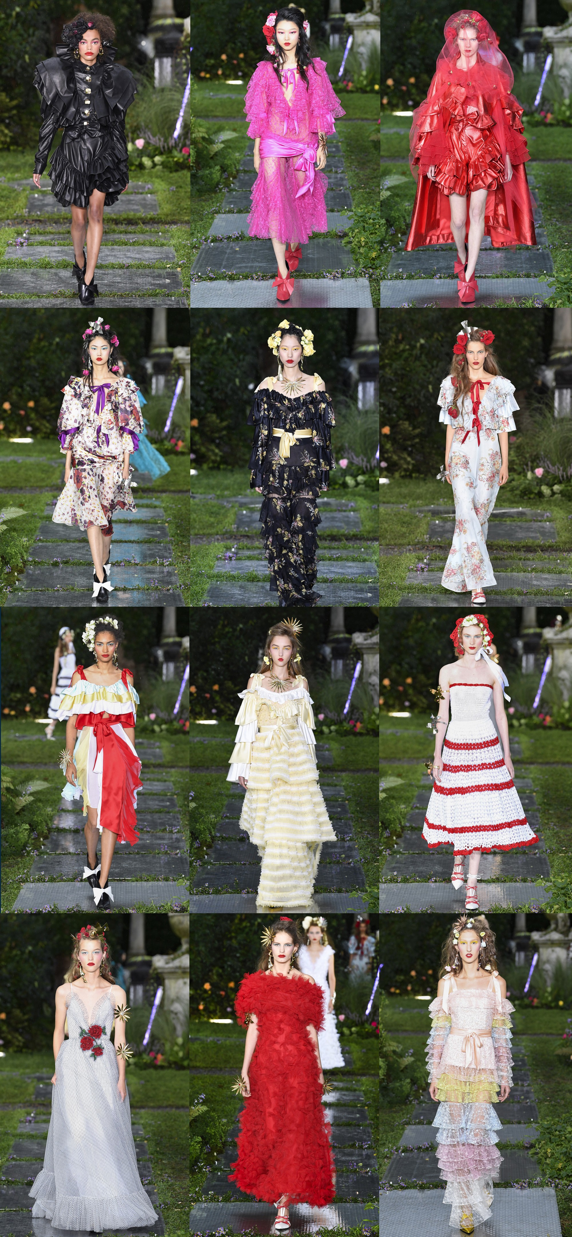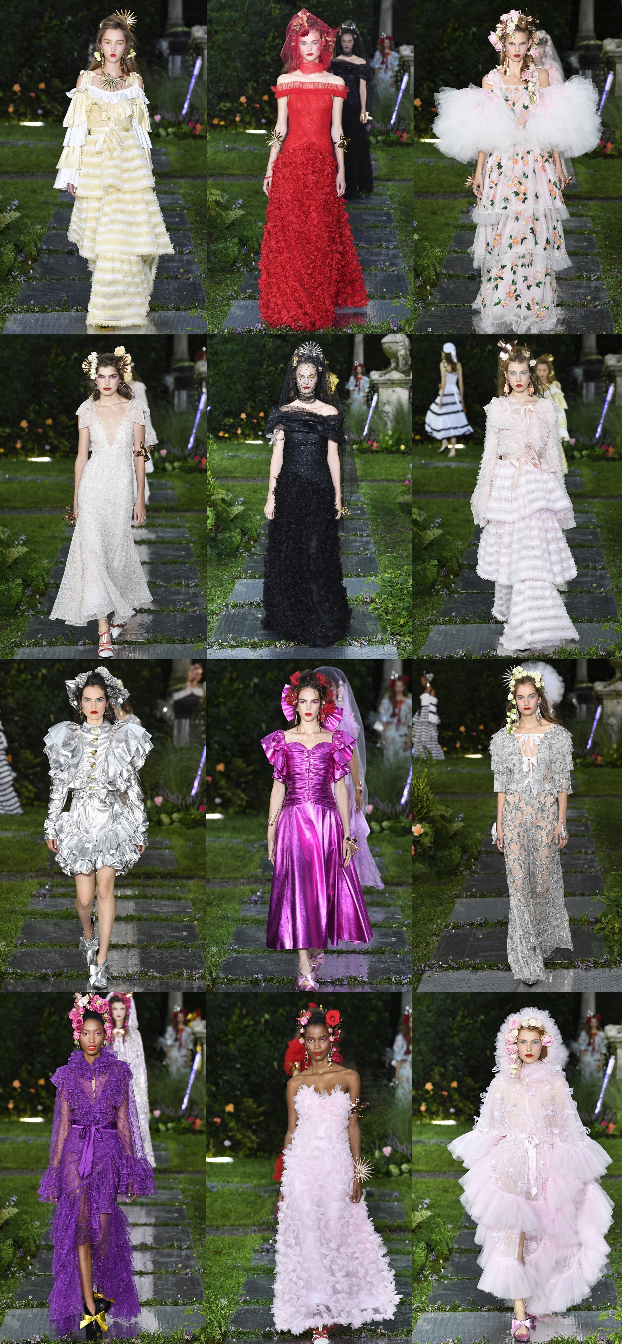 В новой коллекции сестры Кейт и Лора Малливи остались верны своей излюбленной цветочной теме и придали ей напряженности благодаря вставкам из кожи и тканей металлических оттенков. Щедро расшитые рюшами, воланами и бесчисленными слоями воздушной ткани платья чередовались со спокойными моделями в белом цвете — с объемными рукавами или открытыми плечами. Цветочные принты и вышивки дизайнеры разбавили горизонтальной полоской, а пышный декор – вуалями и кейпами с капюшоном.