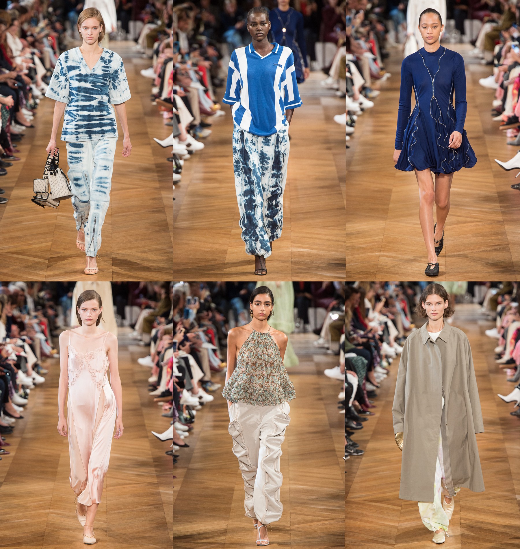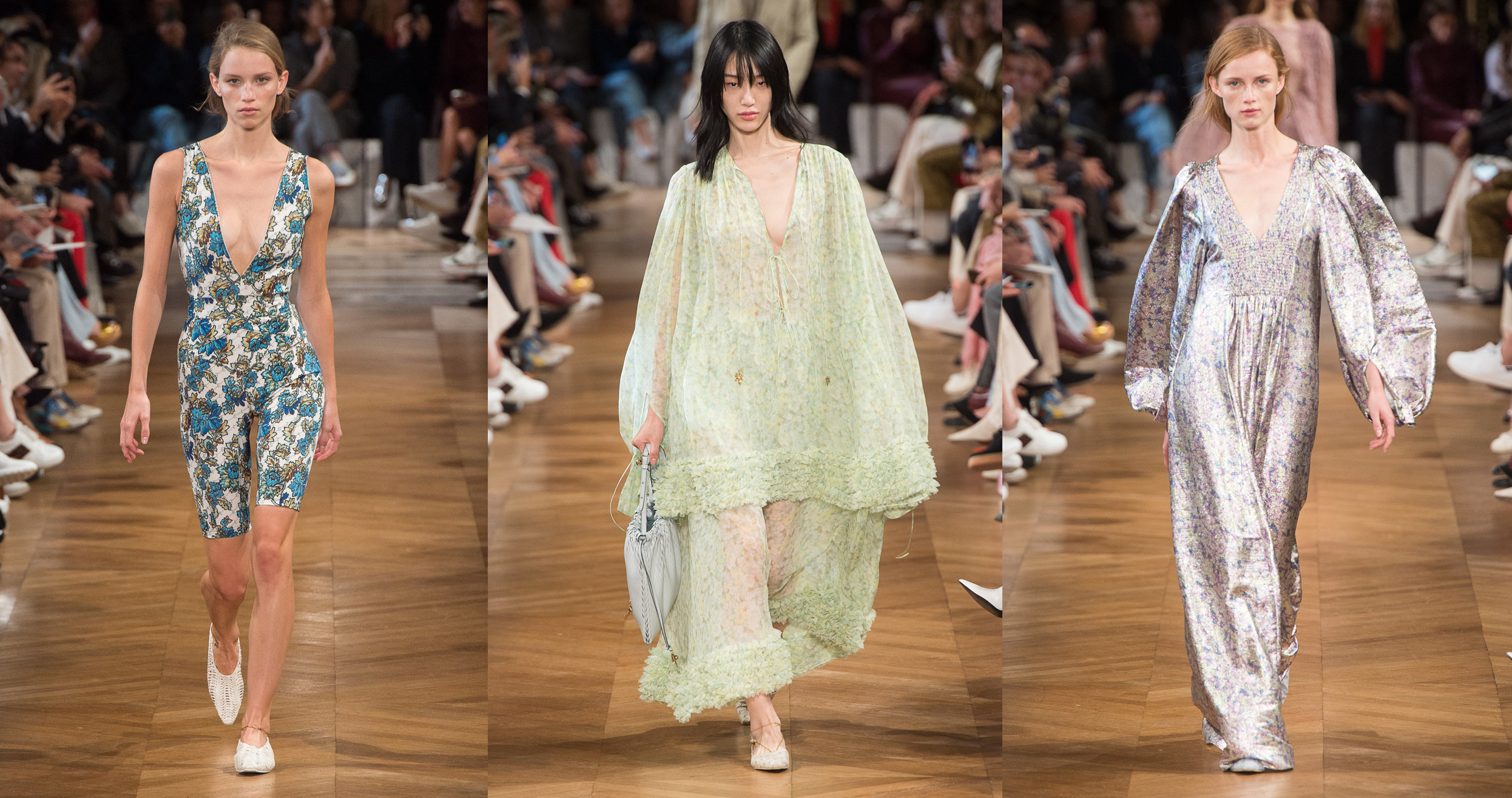 Переход в вольное плавание не отразился на эстетике бренда: Stella McCartney остались верны своему миксу спортивного и классического стиля, представив череду брючных костюмов расслабленного кроя. О том, что формирование Маккартни как дизайнера пришлось на 90-е, напомнило кремовое платье-комбинация и минималистские плащи маскулинного кроя, а для завершающей части дефиле она выпустила на подиум легкие коктейльные платья из шифона и шелка с длинными объемными рукавами.