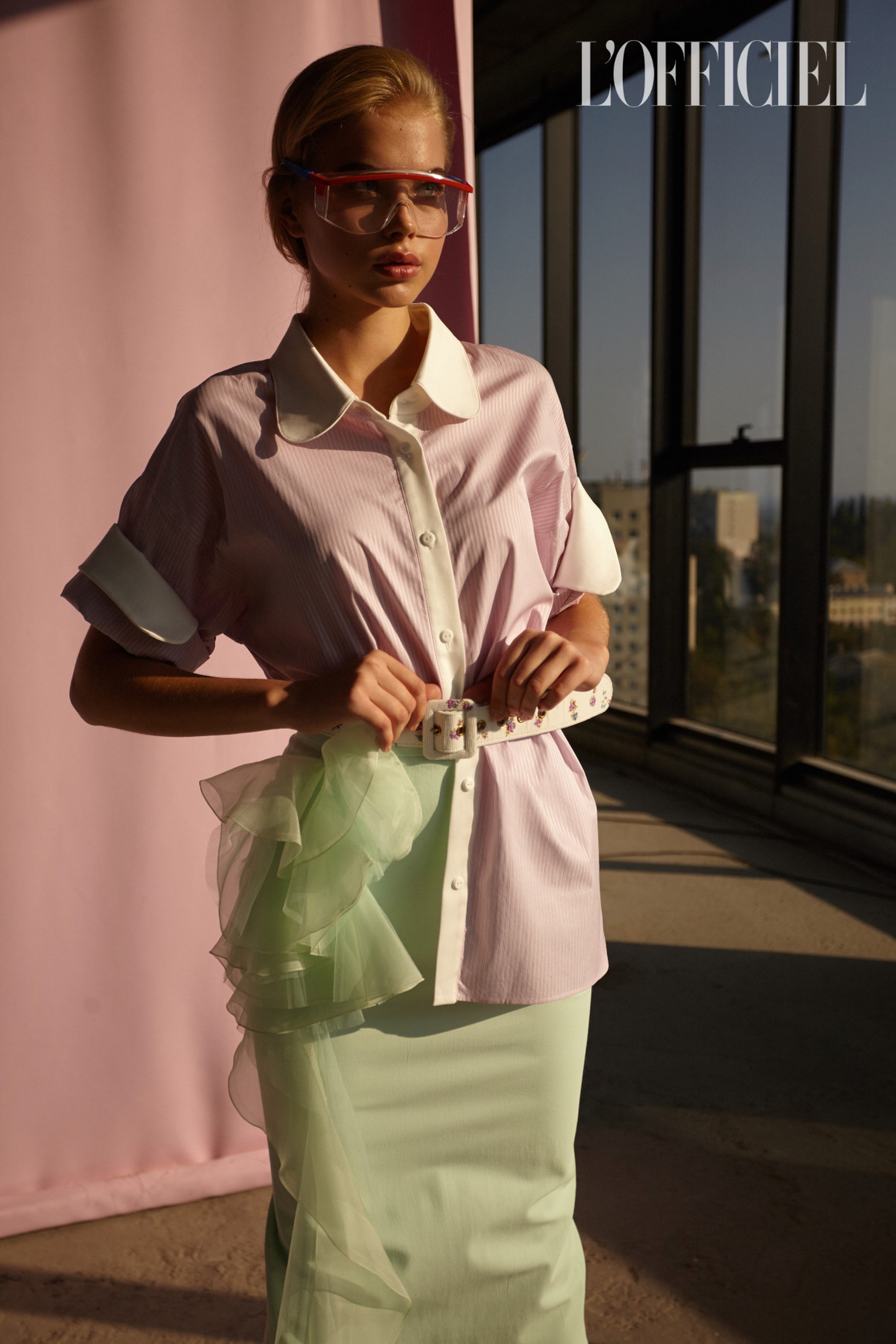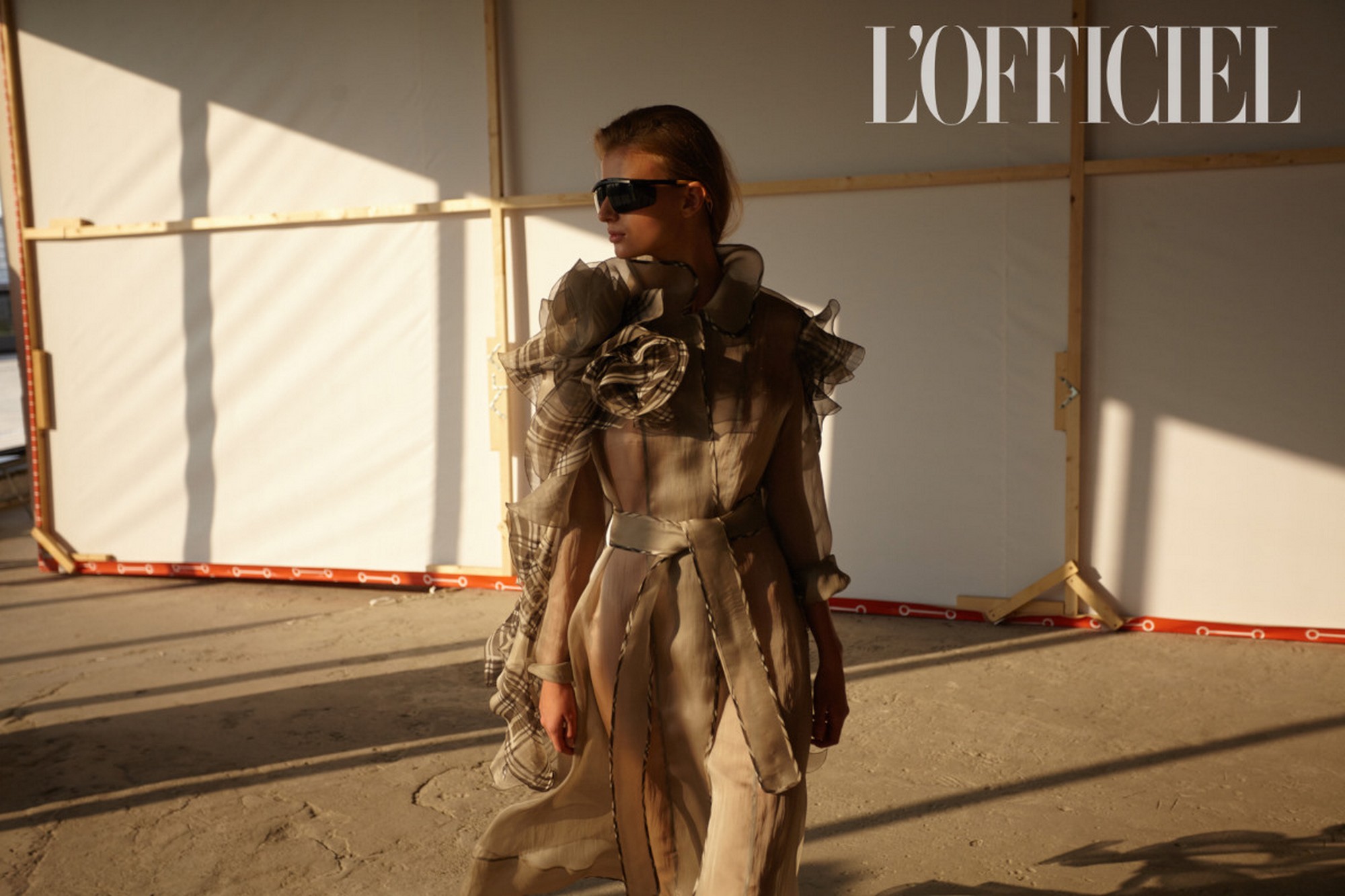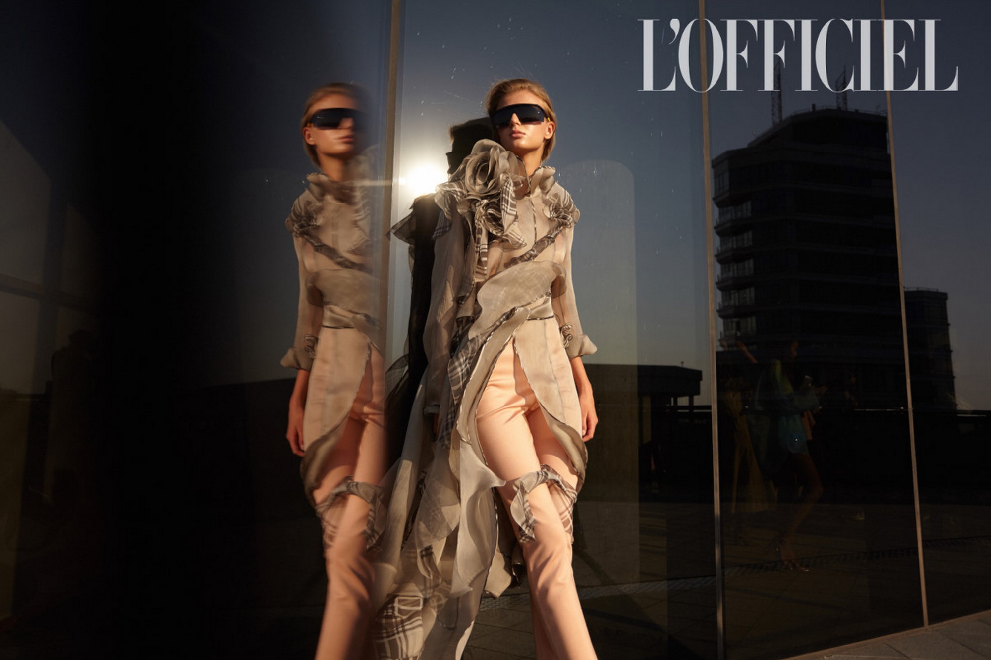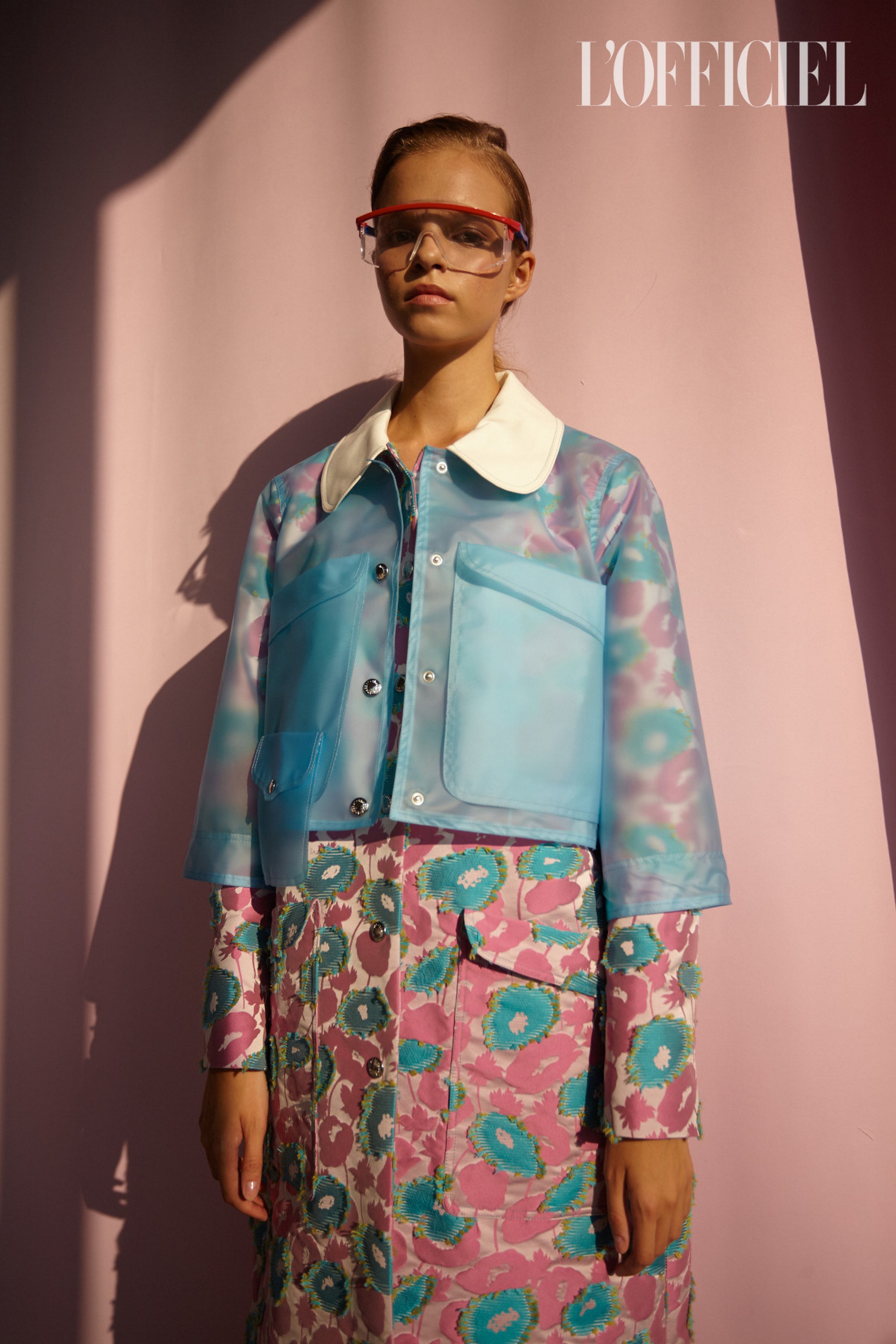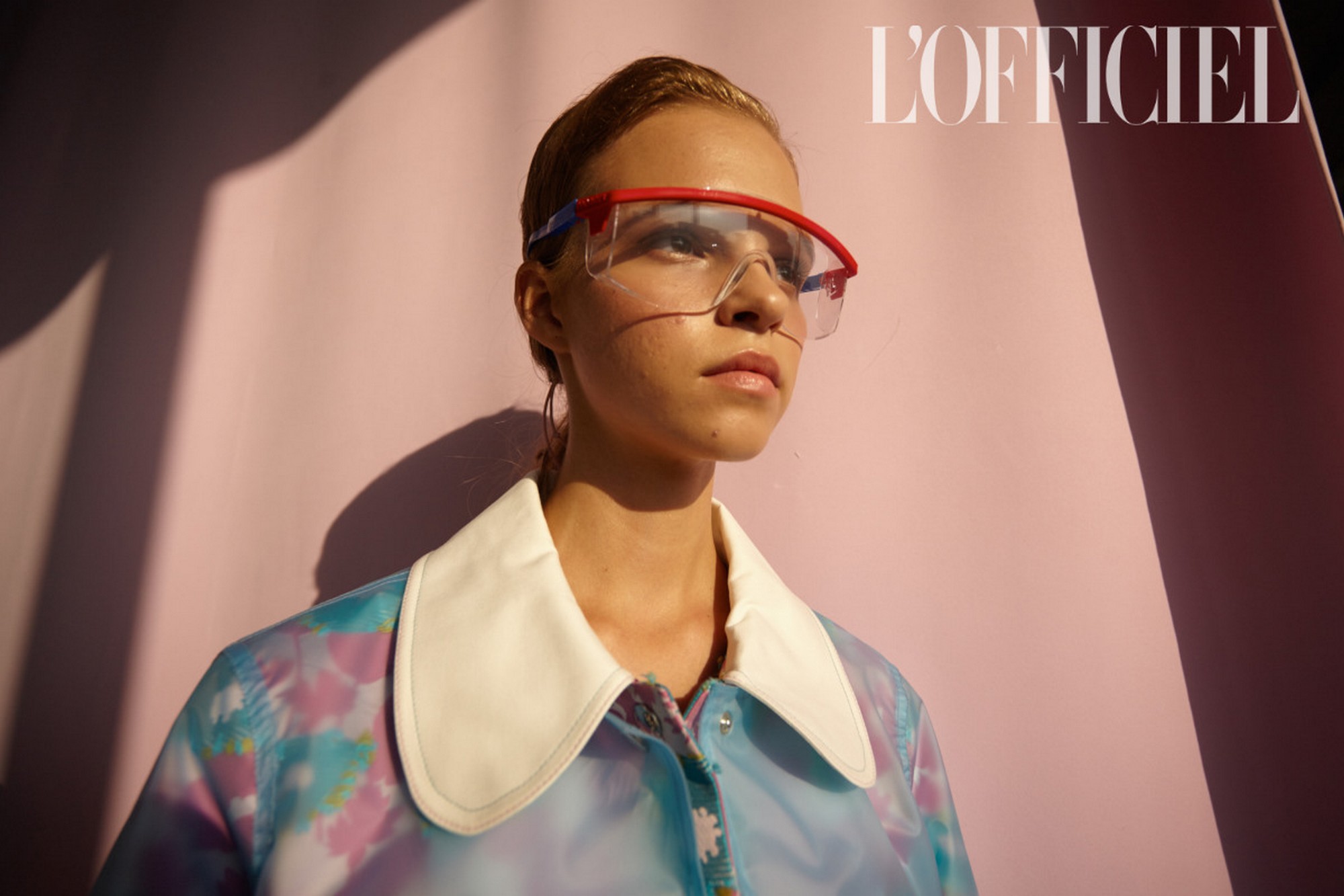 Тему показа Кати Сильченко можно было предугадать еще по приглашению на показ – вместо бумажного пригласительного гости получили прозрачные пластиковые очки, в которых обычно трудятся рабочие на стройках. Дизайнер исследовала рабочую униформу женщин послевоенного периода 40-х годов, когда женщинам приходилось выполнять всю тяжелую работу наравне с мужчинами. "Женщины не отходили от станка, при этом умудрялись быть любящими мамами и заботливыми женами. Я думаю, что благодаря их вере, труду и отваге вернулась жизнь", — рассказывает Катя.