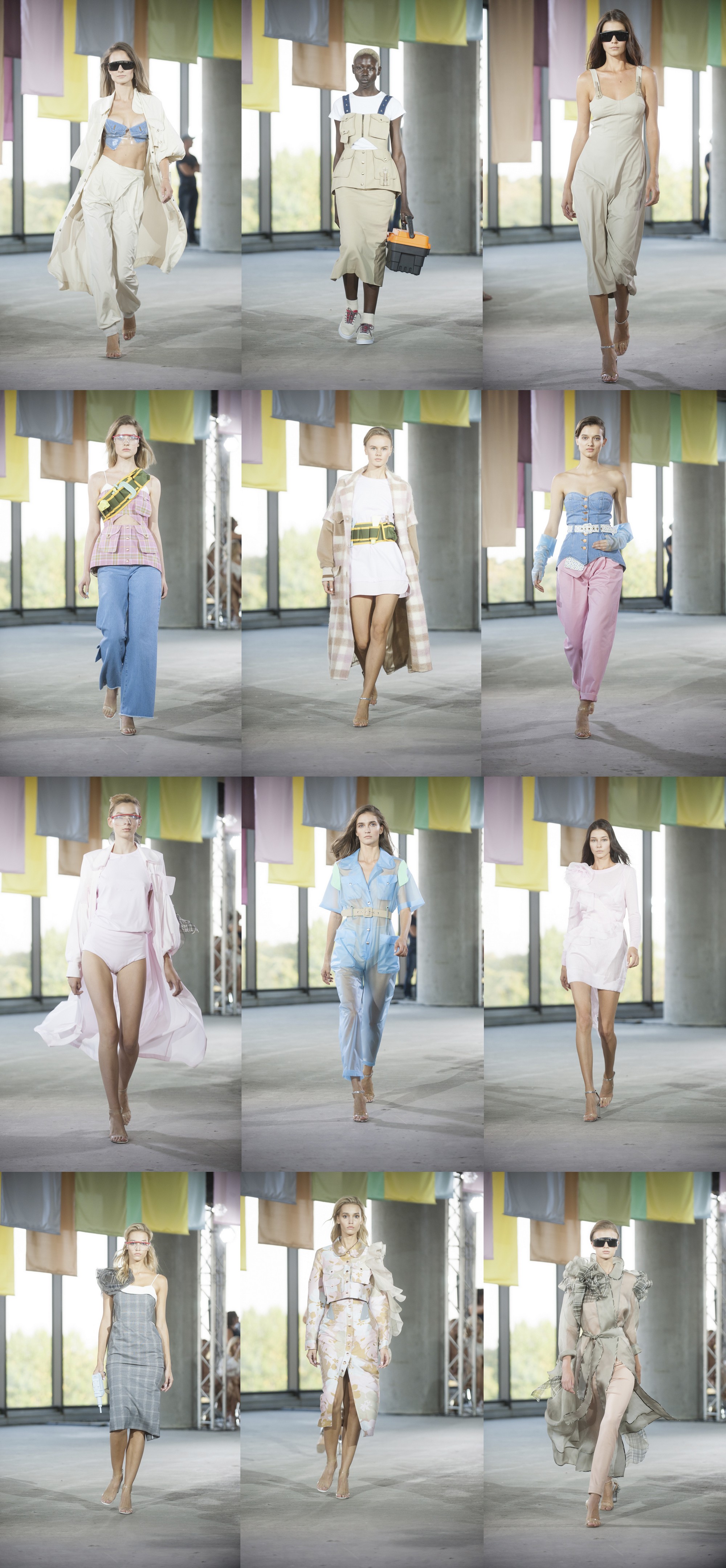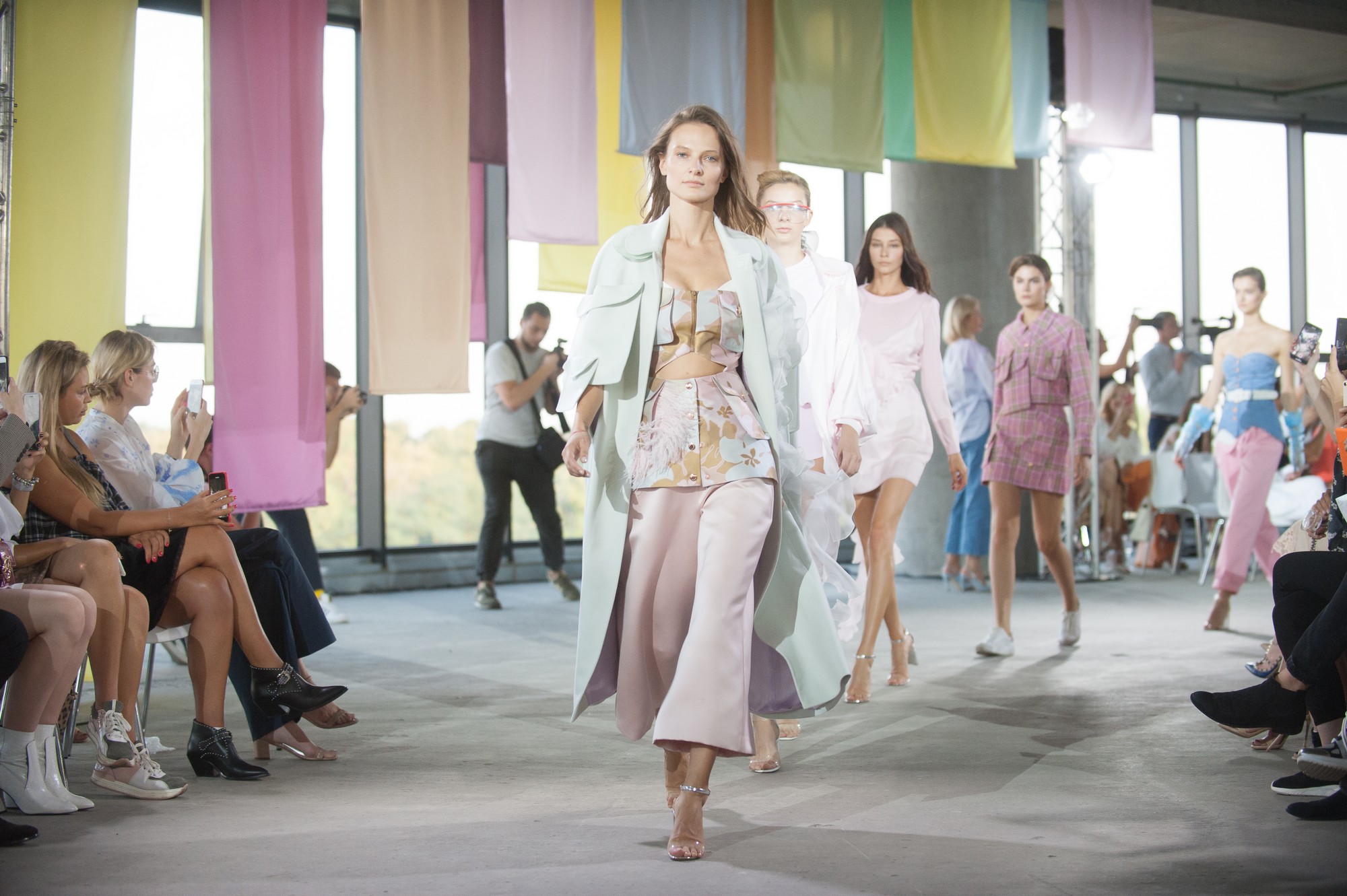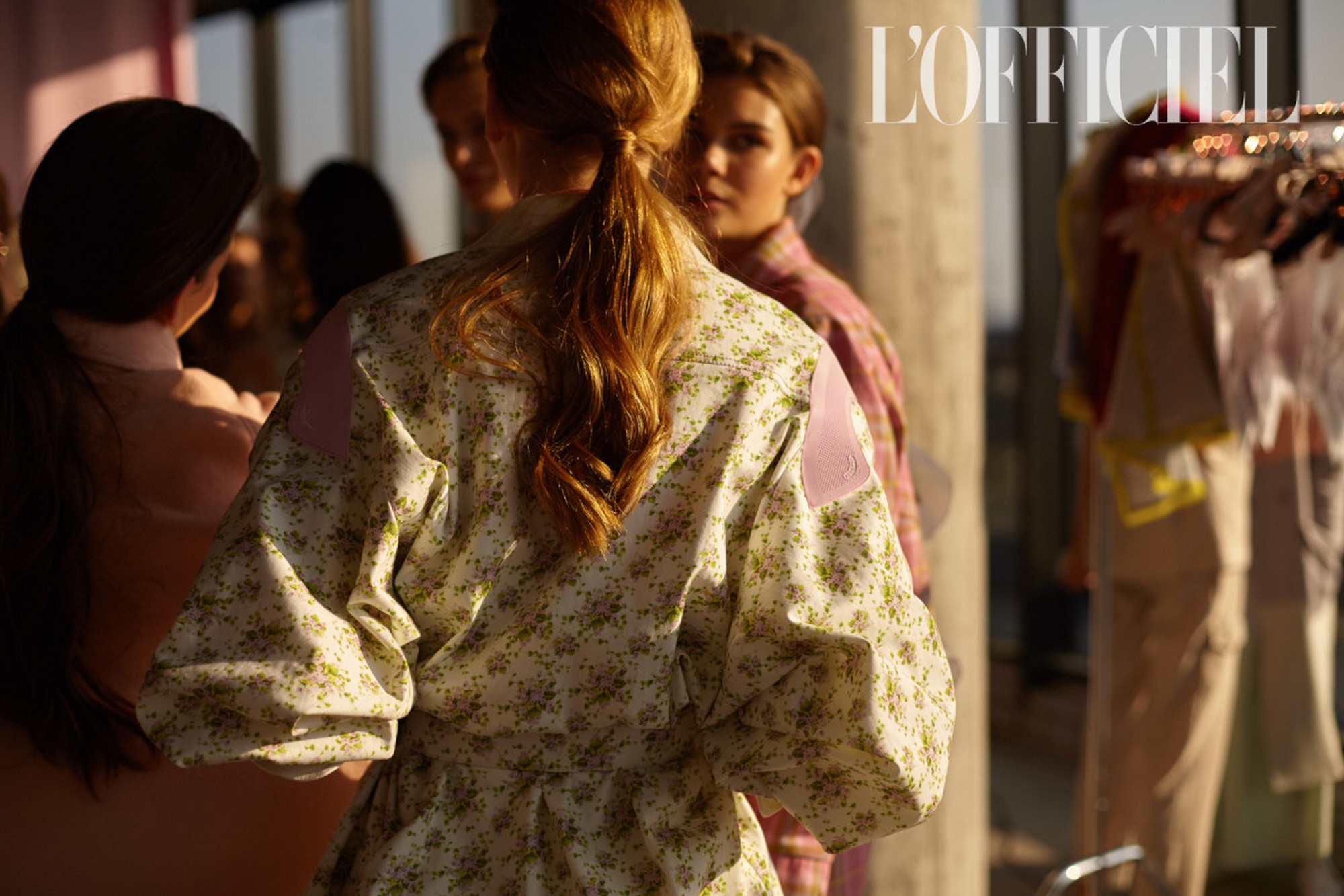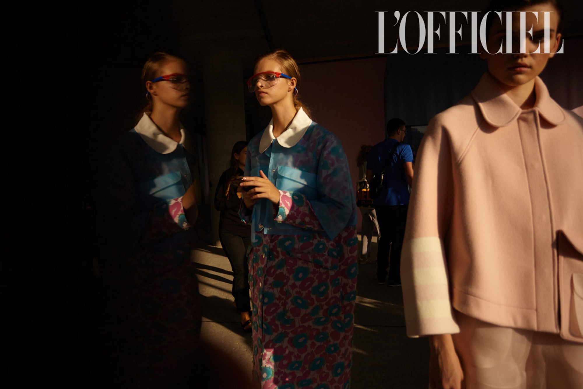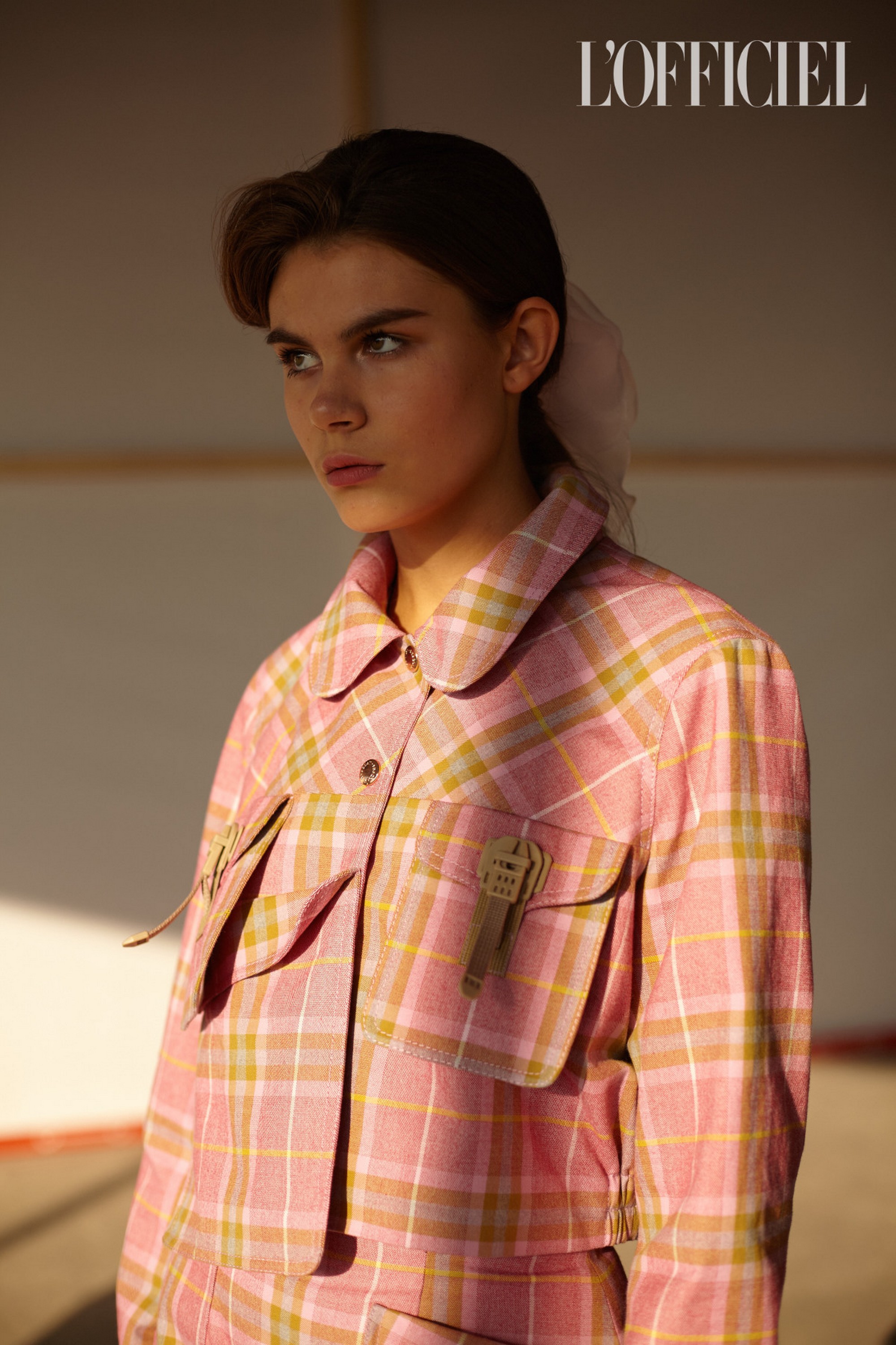 Тему показа Кати Сильченко можно было предугадать еще по приглашению на показ – вместо бумажного пригласительного гости получили прозрачные пластиковые очки, в которых обычно трудятся рабочие на стройках. Дизайнер исследовала рабочую униформу женщин послевоенного периода 40-х годов, когда женщинам приходилось выполнять всю тяжелую работу наравне с мужчинами. "Женщины не отходили от станка, при этом умудрялись быть любящими мамами и заботливыми женами. Я думаю, что благодаря их вере, труду и отваге вернулась жизнь", — рассказывает Катя.