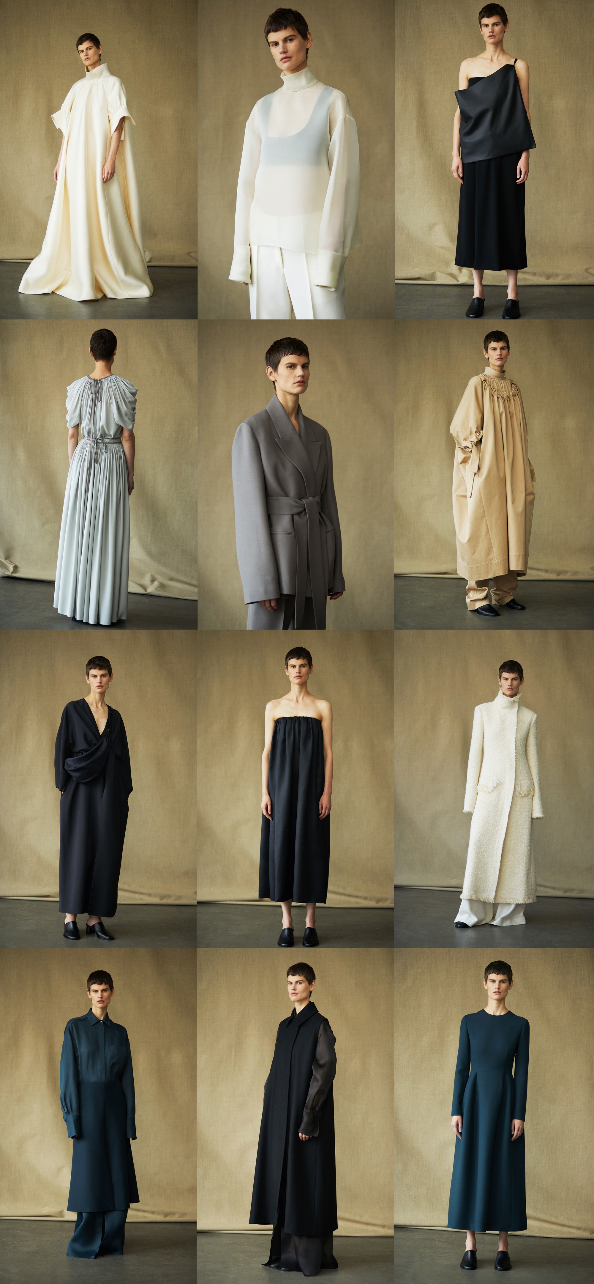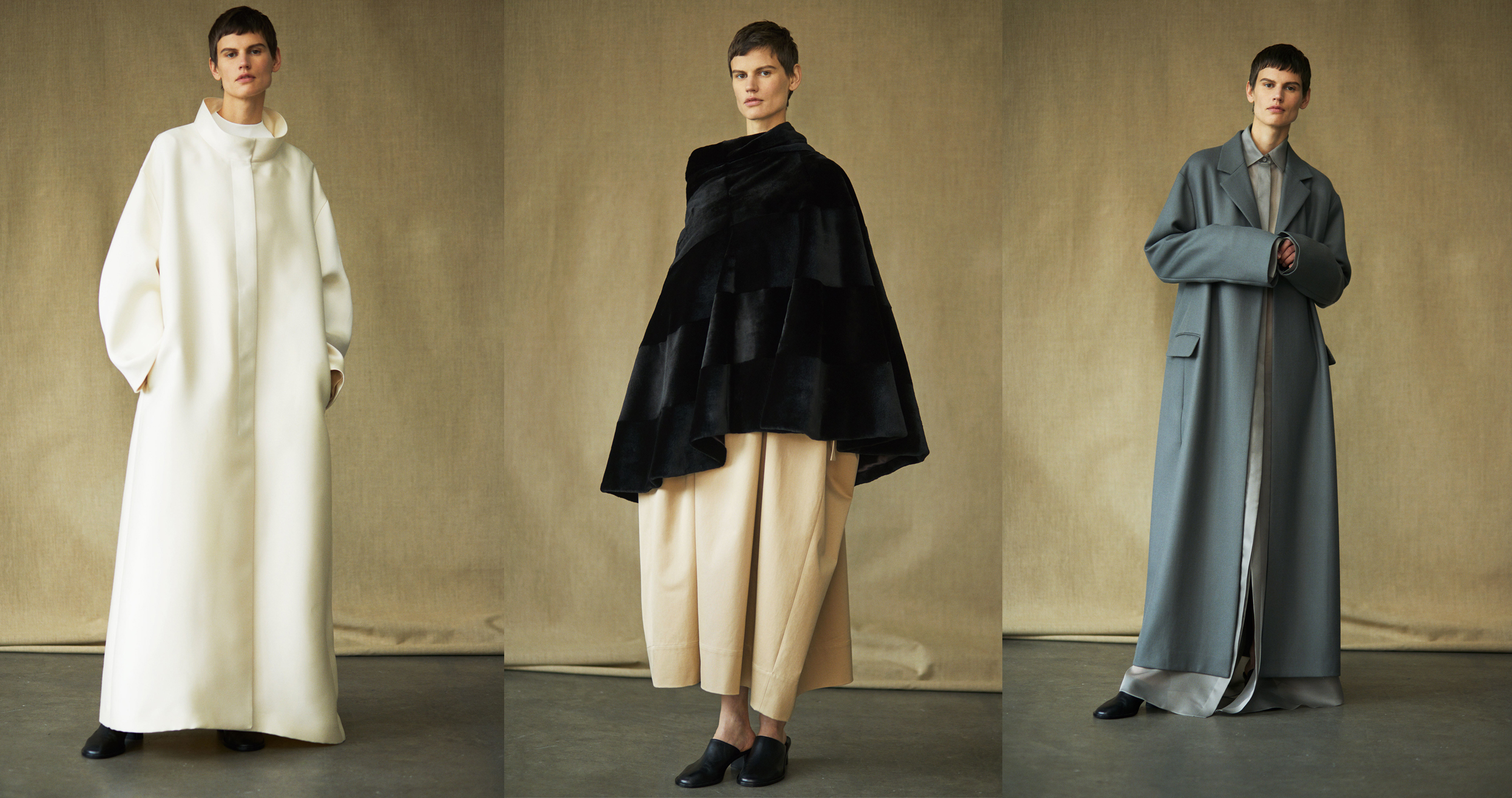 В новой коллекции Олсен сосредоточились на изучении объемов и многослойности. За счет кроя огромные полотна ткани превратились в тяжелые платья с викторианскими воротниками, бархатные уютные пончо и оверсайз пальто. Работа над мужской коллекцией сказалась и на видении сестер женского гардероба — прямые брюки со стрелками на высокой талии и пиджаки-кимоно.