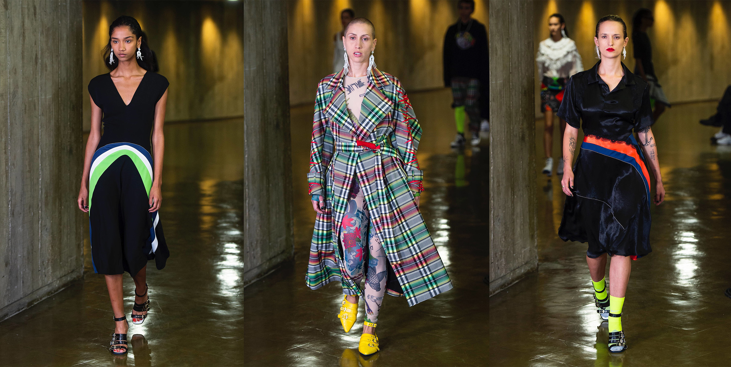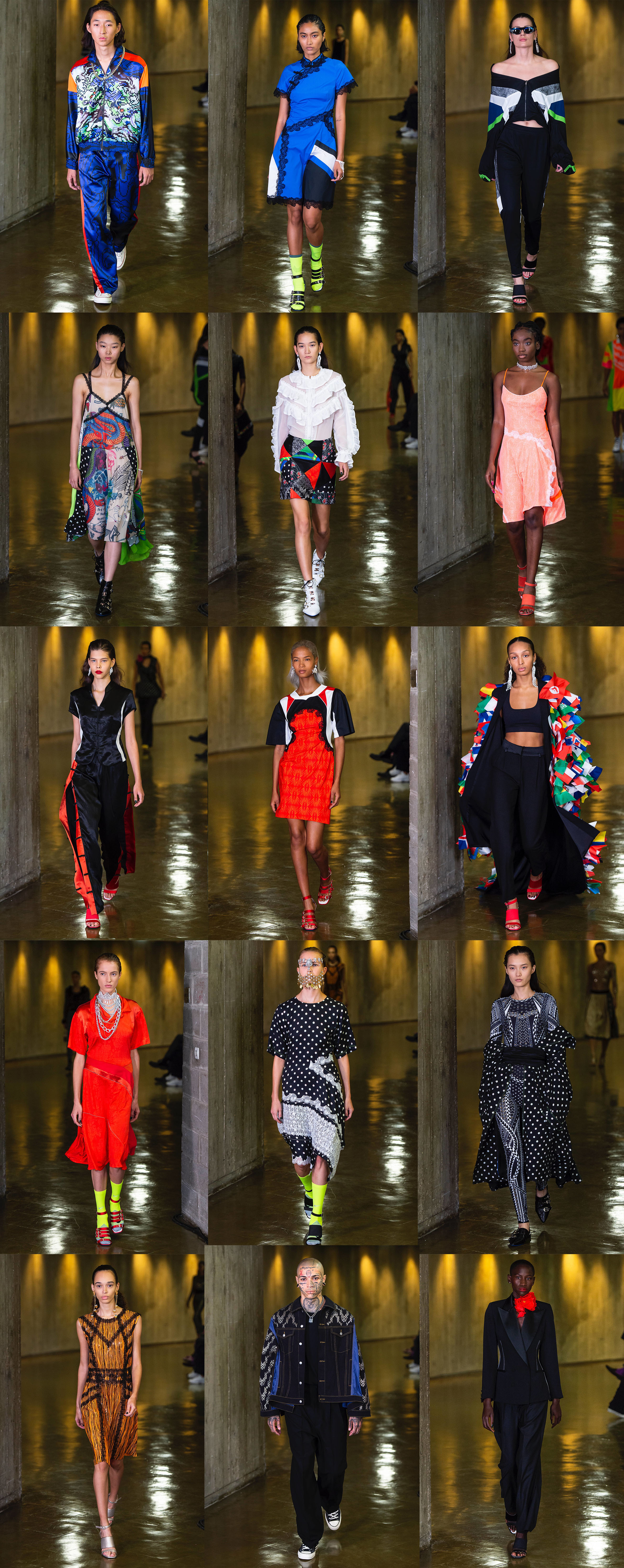 У африканцев Коше взяла дашики – цветастые рубашки с V-образной горловиной, у американцев – технику пэчворк, у японцев – клетчатые узоры, а у индийцев – украшения для лица. В коллекции также прослеживались мотивы смокингов Ива Сен-Лорана и боди, запринтованные татуировками, которые в свое время придумал Жан-Поль Готье. Шелковые платья перемежались с тренчами, спортивные олимпийки – с платьями в горох, украшенными воланами, а платья-комбинации – с облегающими блестящими комбинезонами. О кругосветном характере ярче всего дизайнер сказала базовым темно-синим плащом, нашив на его спину десятки флагов разных стран, – наряд, достойный мисс мира или посла доброй воли ООН.