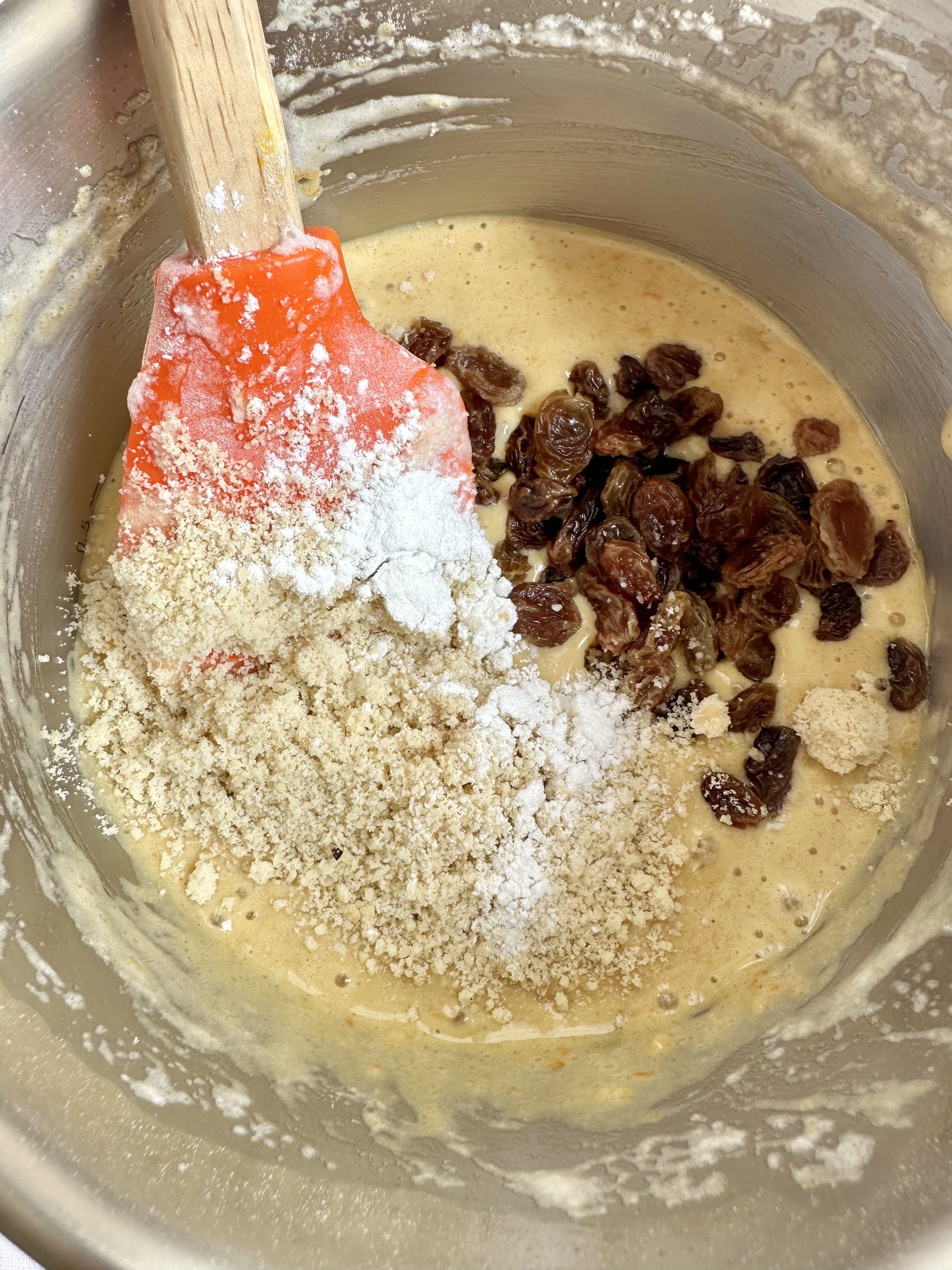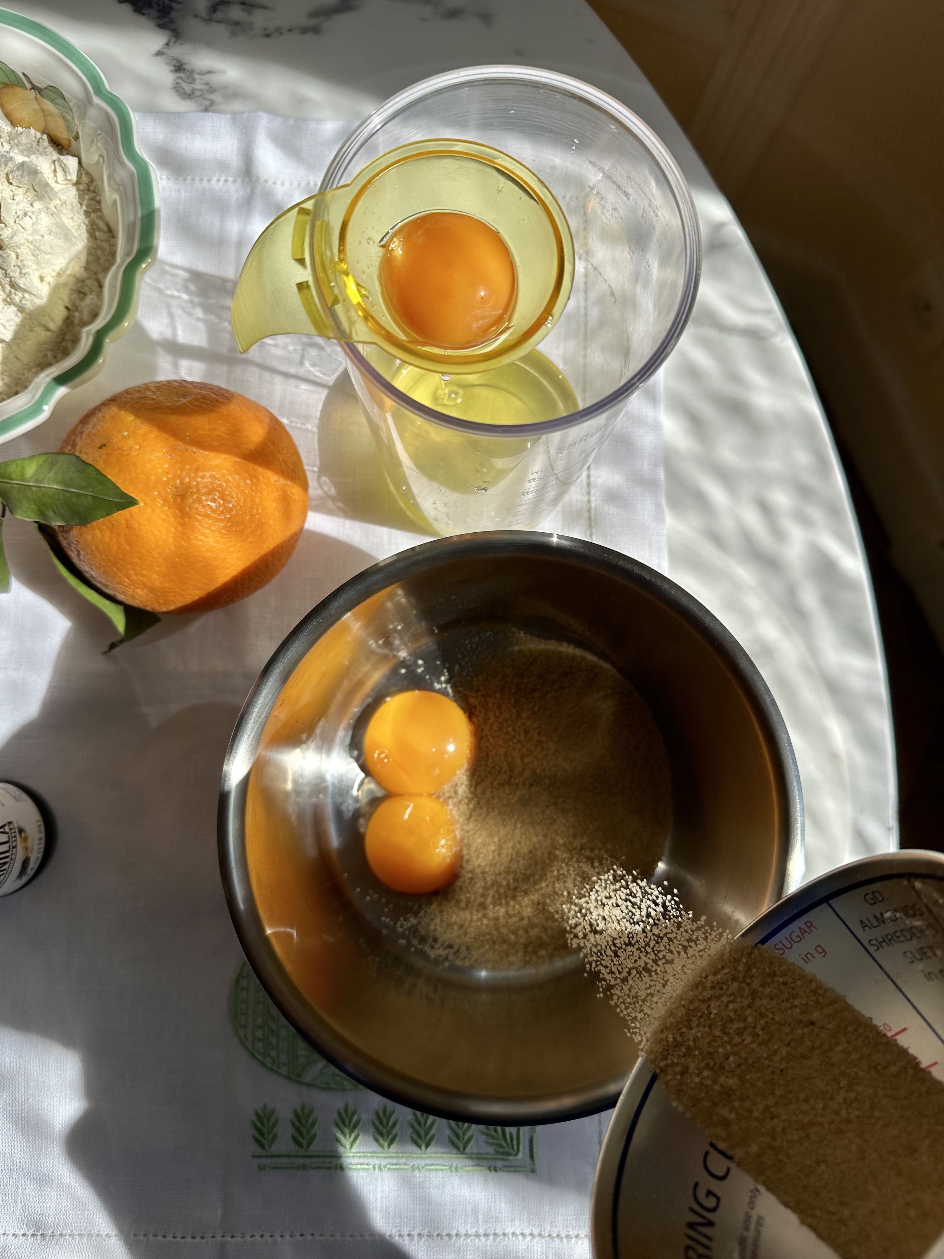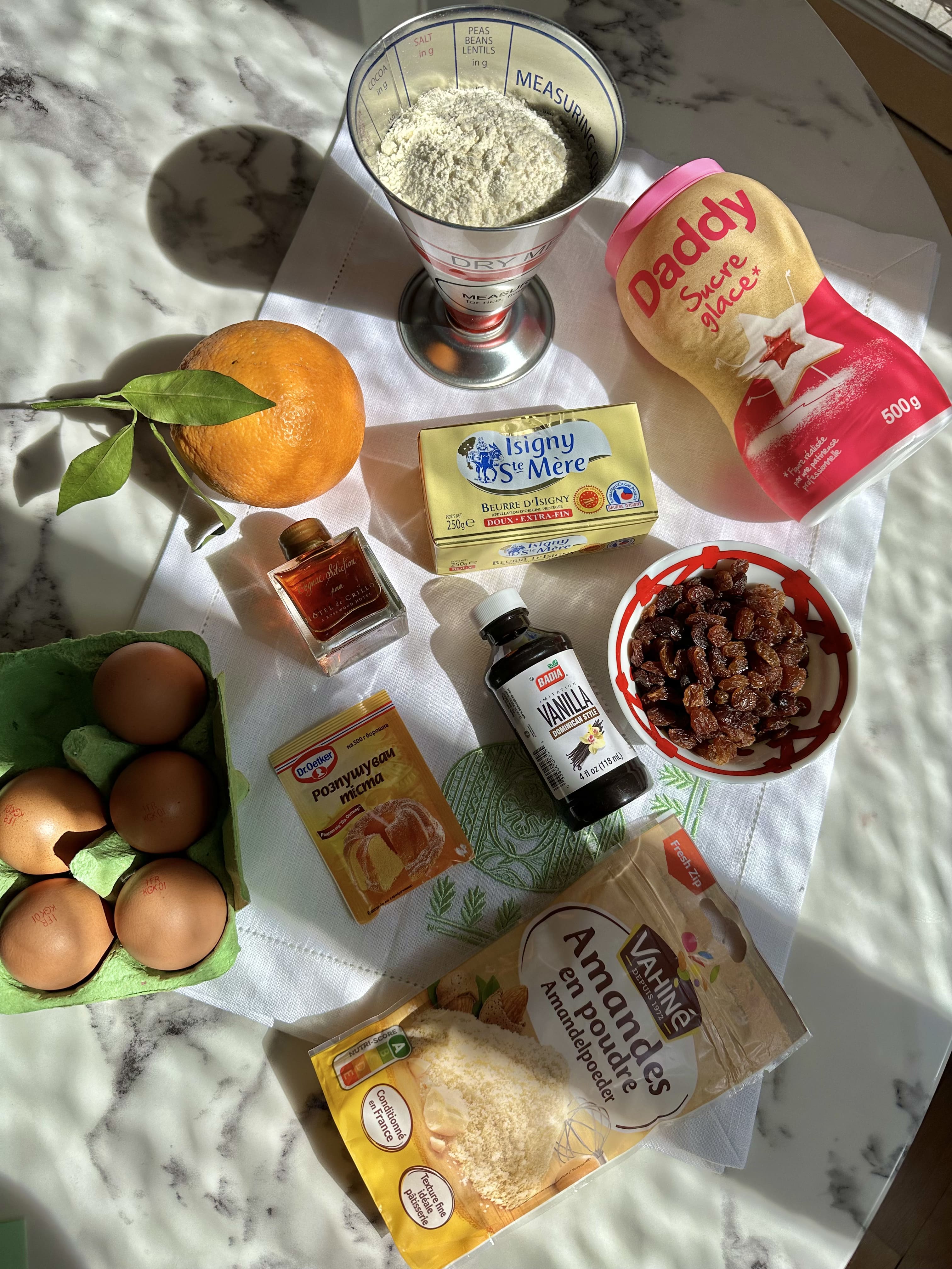 Отже, беремо: 4 яйця, 100 г цукру, 150 г борошна, 2 столові ложки мигдального борошна, жменю родзинок, 1/3 чайної ложки пекарського порошку, 1 столову ложку ванільного екстракту, цедру одного апельсина, столову ложка коньяку, вершкове масло для форми, цукрову пудру та червону вузьку стрічку для подачі.