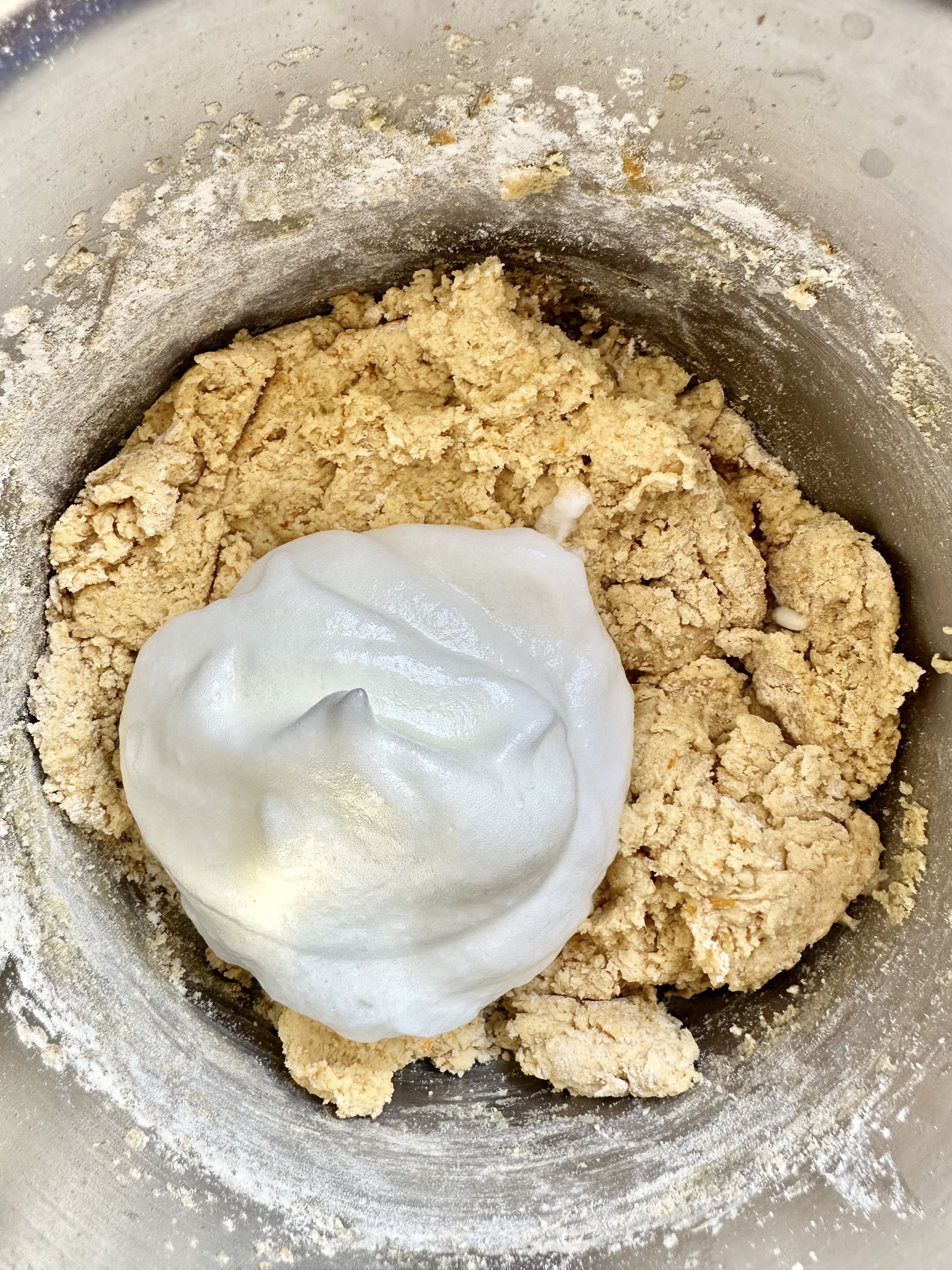 Додати борошно та розпушувач, перемішати. Збити білки до м'яких піків і обережно ввести в тісто.