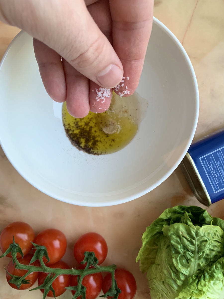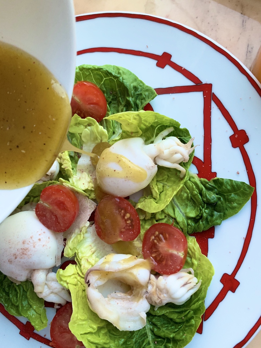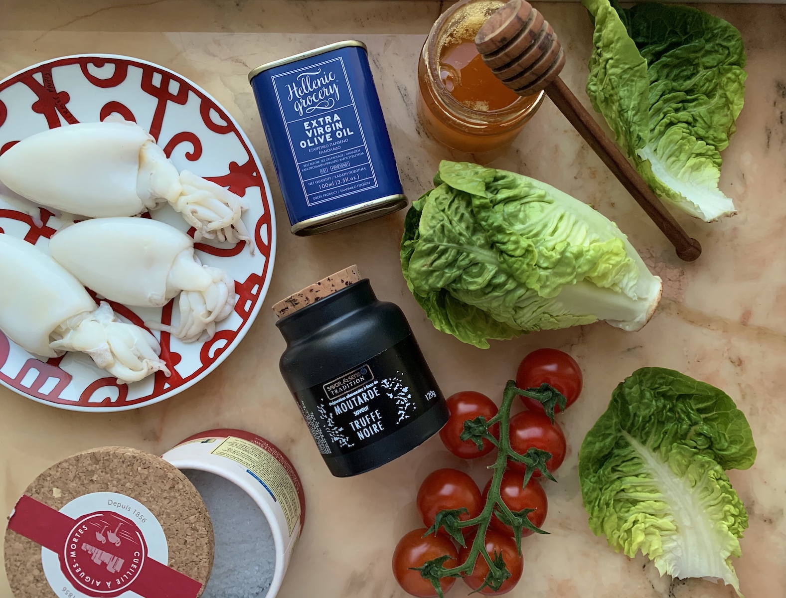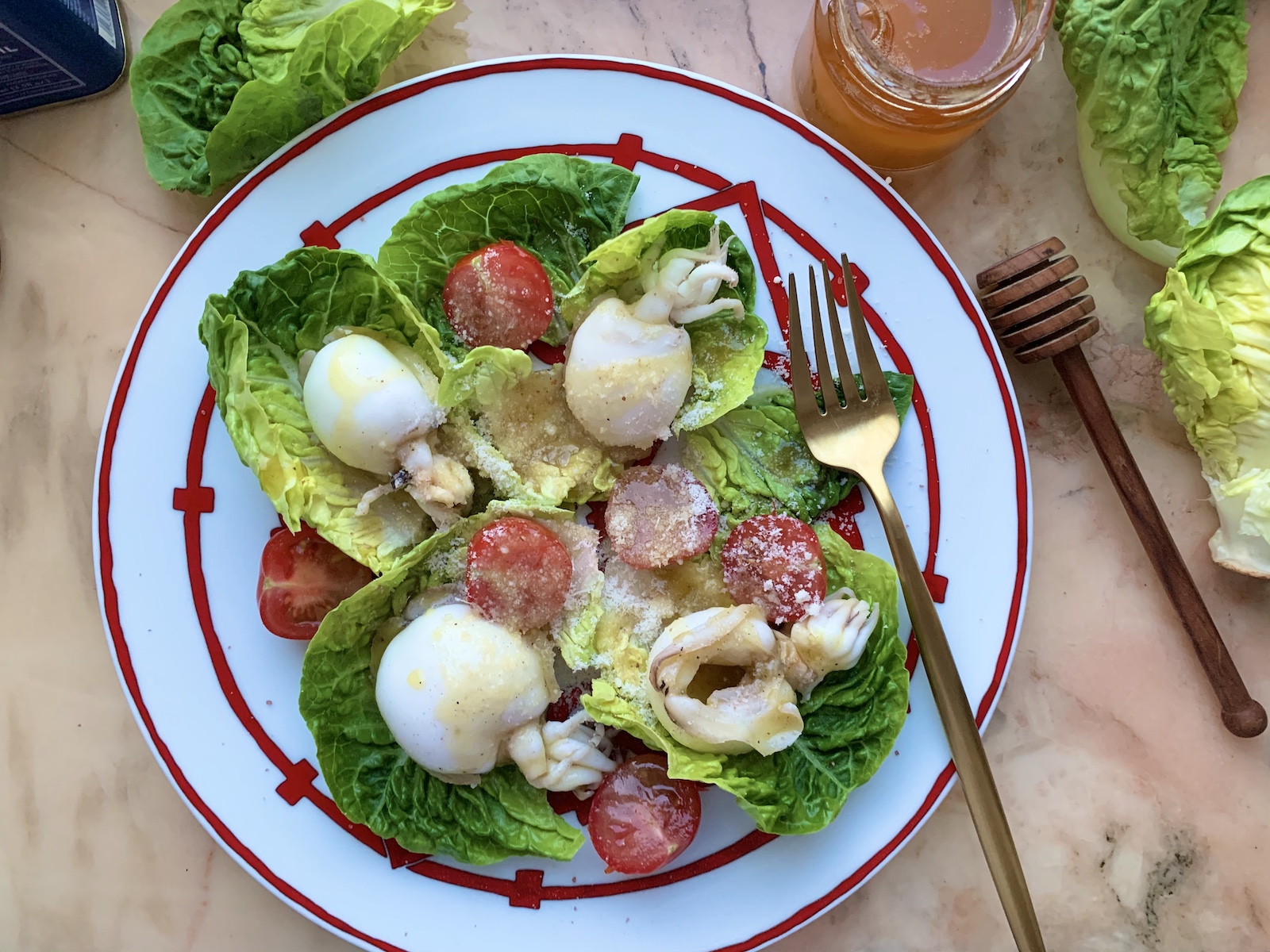 Итак, на 1 порцию берем: 1 маленький кочан римского салата, 4-6 помидорок черри, 4 каракатицы, немного тертого пармезана. Для заправки: 2 столовые ложки оливкового масла, 1 чайную ложку меда, 1 чайную ложку горчицы, щепотку соли и щепотку свежемолотого перца.