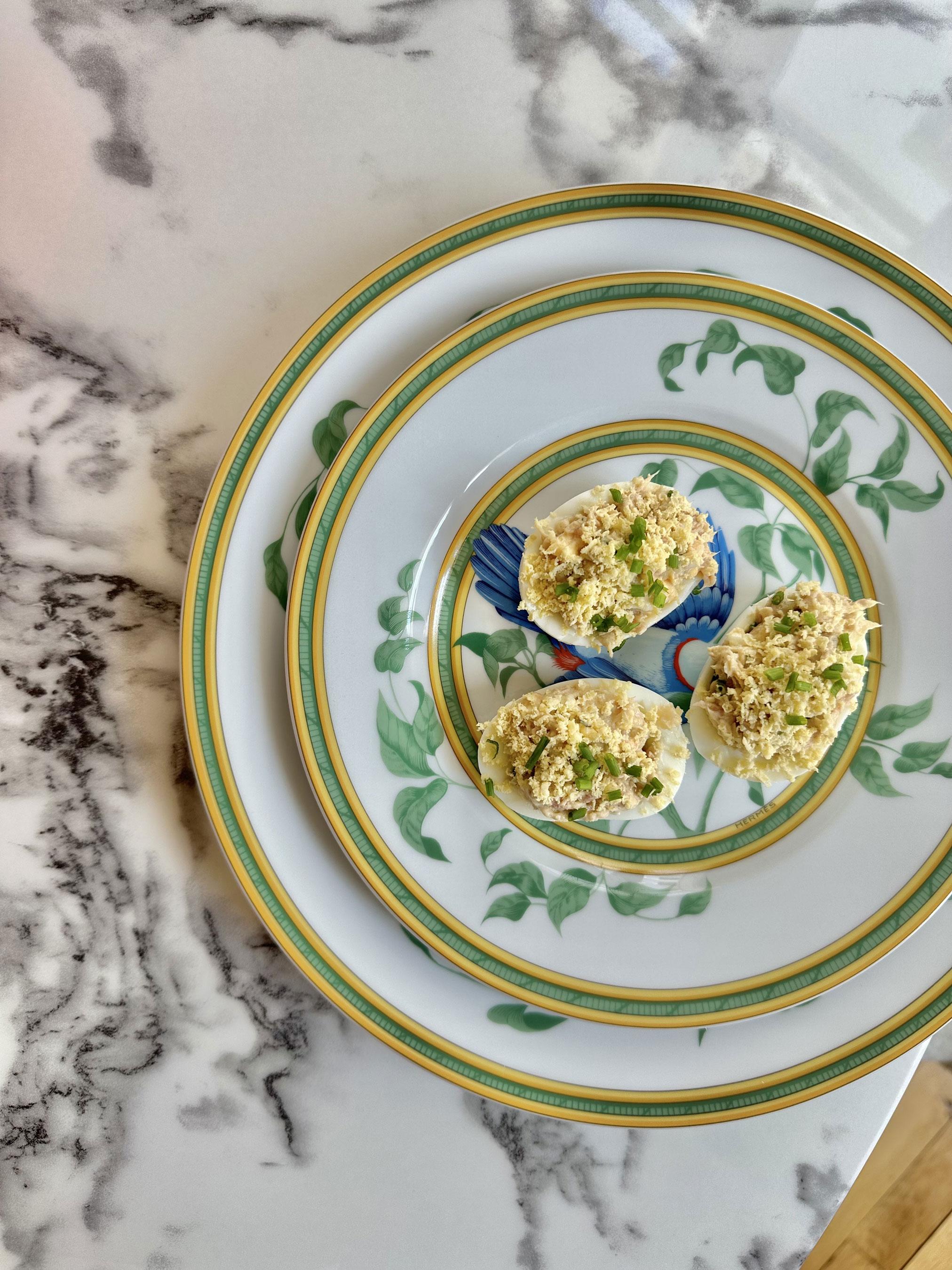 Відварені та охолоджені яйця розділити навпіл, витягти жовток і акуратно вирізати білок, щоб вмістилося більше начинки. Жовтки та частину білків скласти в миску, розім'яти виделкою. Додати тунця, натертий сир, подрібнену цибулю, спеції, майонез, добре перемішати. Заповнити половинки яєць начинкою, посипати сиром та цибулею. Негайно подати з келихом білого сухого вина або шампанського.