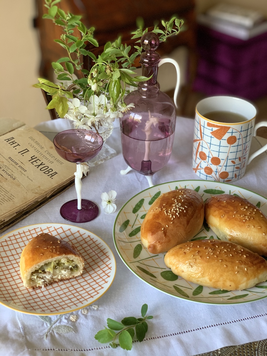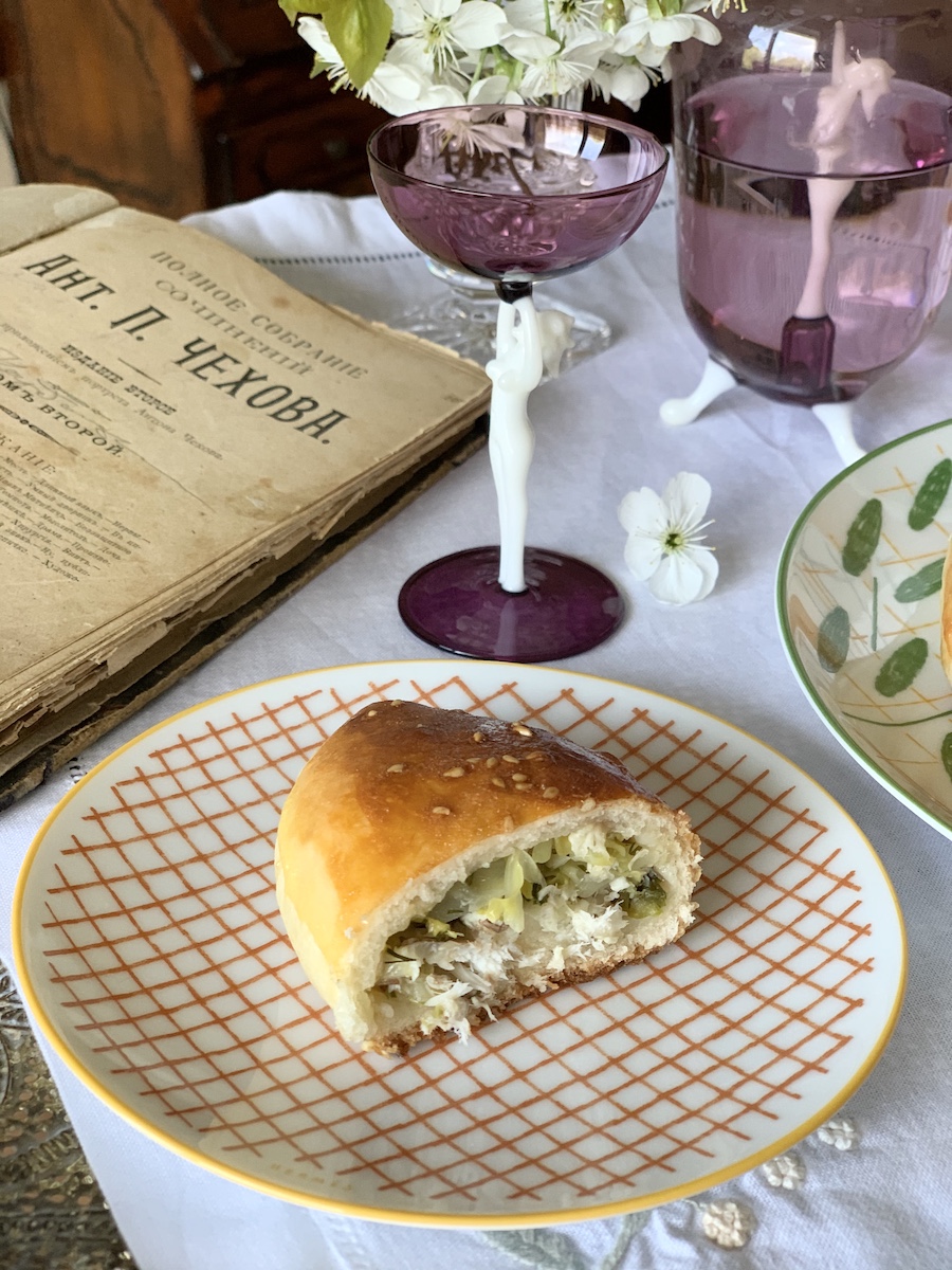 «Пирог с капустой по семейному рецепту был коронным блюдом сестры писателя, Марии Павловны Чеховой. С ним связана замечательная история Московского Художественного театра. После премьеры чеховских спектаклей Мария Павловна приносила артистам свой капустный пирог, так называемый «капустник». Ужин с пирогом сопровождался шутками и розыгрышами. С этого времени веселые импровизированные концерты в МХТ так и называются – «капустники», – из книги «Кулинарные рецепты семьи Чеховых».
