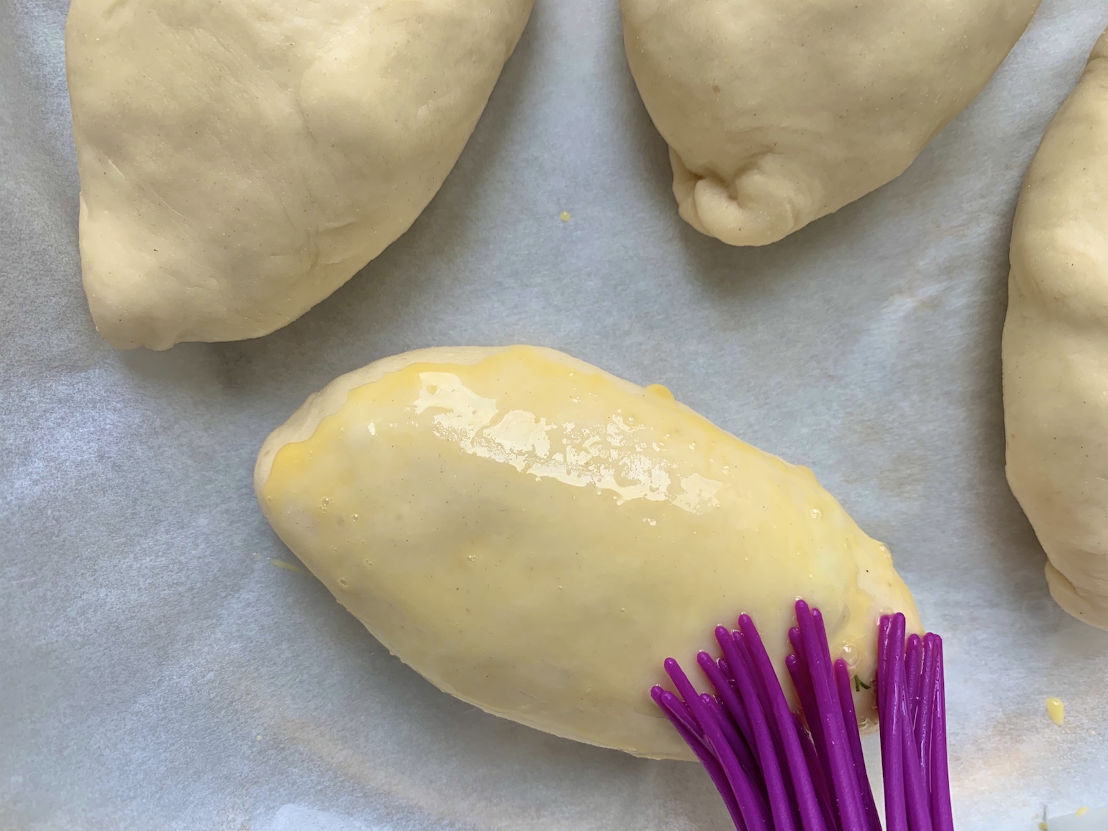Как только сформованы все пирожки, готовим глазурь: смешиваем желтки, молоко и сахар, наносим кисточкой, сверху посыпаем семенами кунжута.