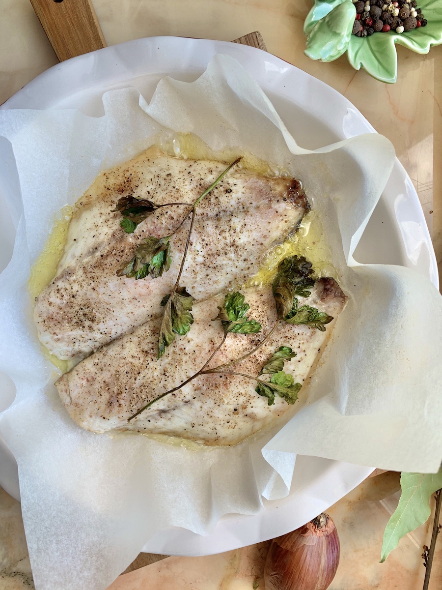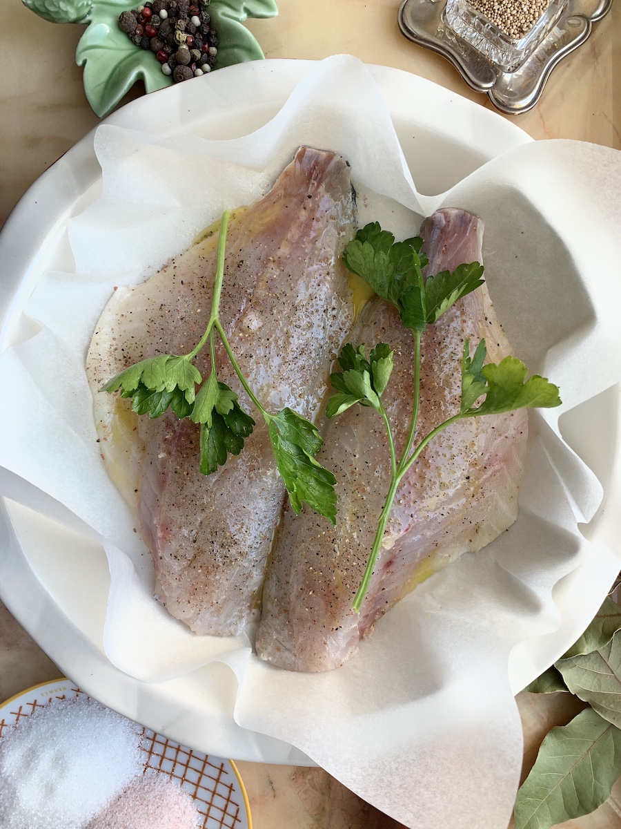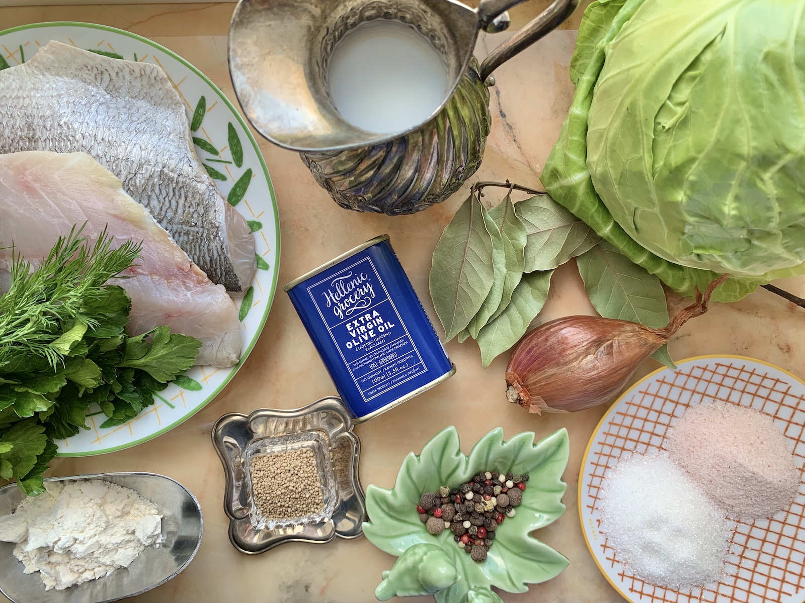 Итак, для теста берем: 250 мл молока, 100 мл подсолнечного рафинированного масла, 1 столовую ложку соли, 1 столовую ложку сахара, 2 чайные ложки сухих дрожжей, 500 г муки и еще 100 г для раскатки теста. Для начинки: 2 филе свежей дорады (или 400 г любой белой рыбы), 1 средний кочан капусты, 1 крупный лук-шалот, 2 столовые ложки оливкового масла, 25 г сливочного масла, свежемолотый перец, соль, 2 лавровых листа, небольшой пучок укропа, пару веточек петрушки и еще немного оливкового масла. Для смазывания пирожков: 2 сырых желтка, 2 столовые ложки молока, 1 чайная ложка сахара, немного семян кунжута.