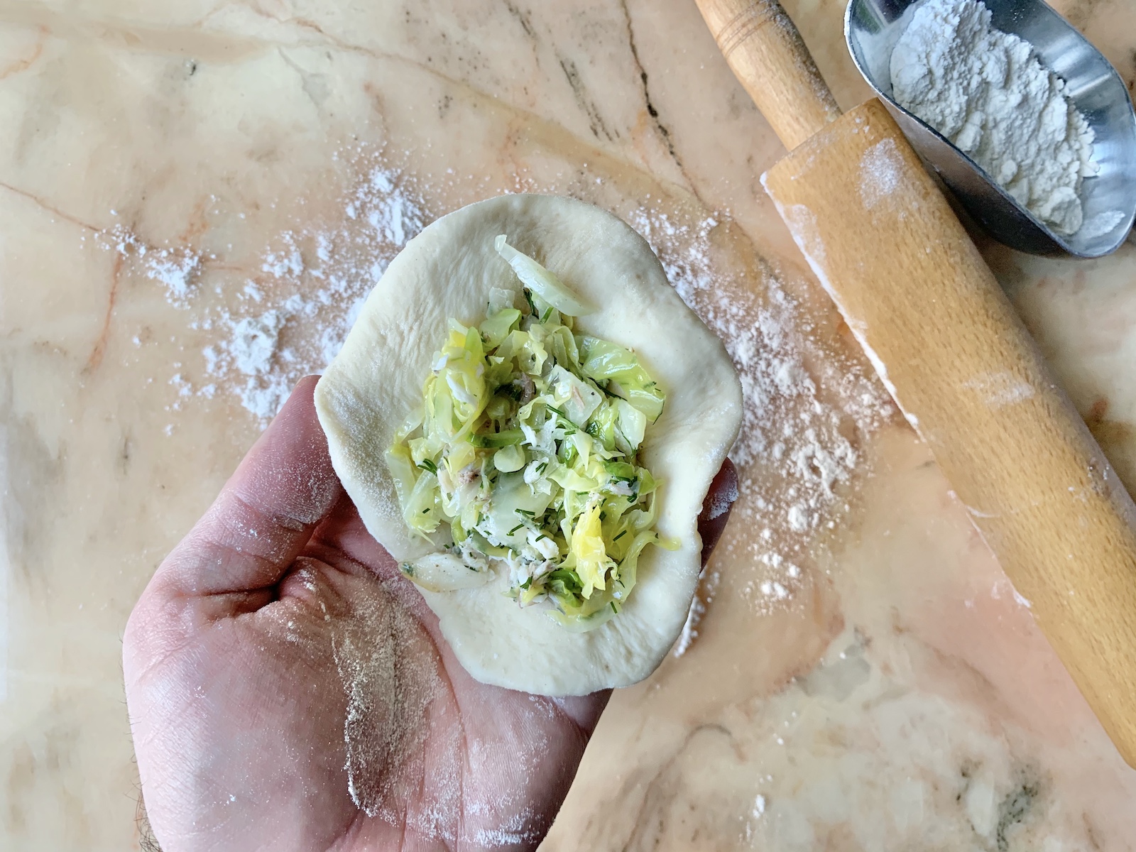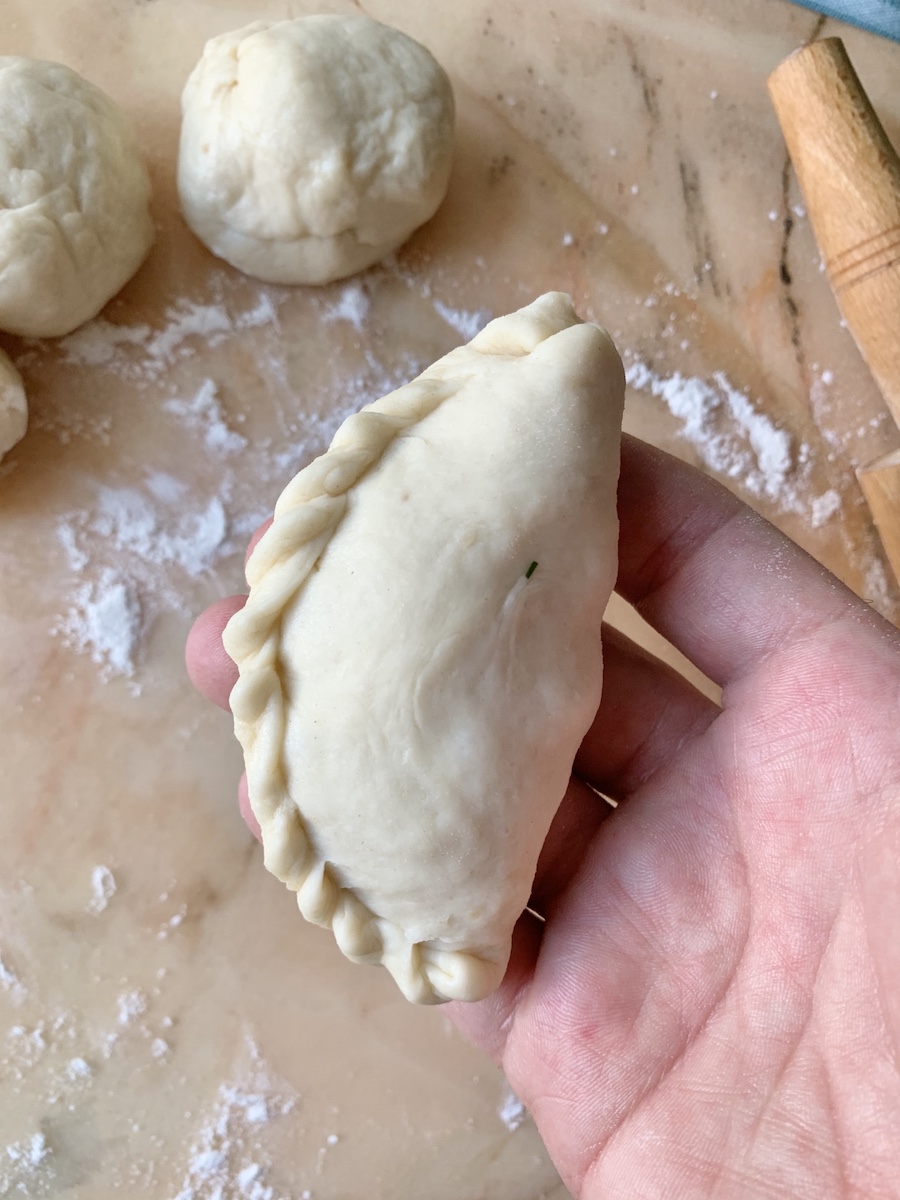 Возвращаемся к тесту. С помощью насадки вымешиваем поднявшееся тесто еще пару минут - всё готово. Отщипываем небольшой кусочек теста, раскатываем на присыпанной мукой поверхности круг толщиной не более трех миллиметров, защипываем края дважды (как на фото) и кладем пирожок швом вниз на выстланный пекарской бумагой противень.