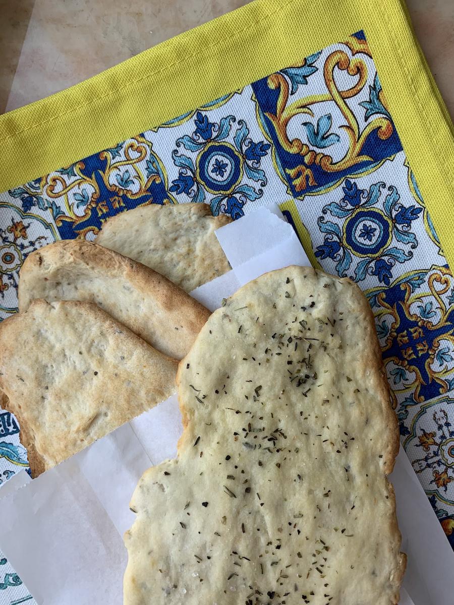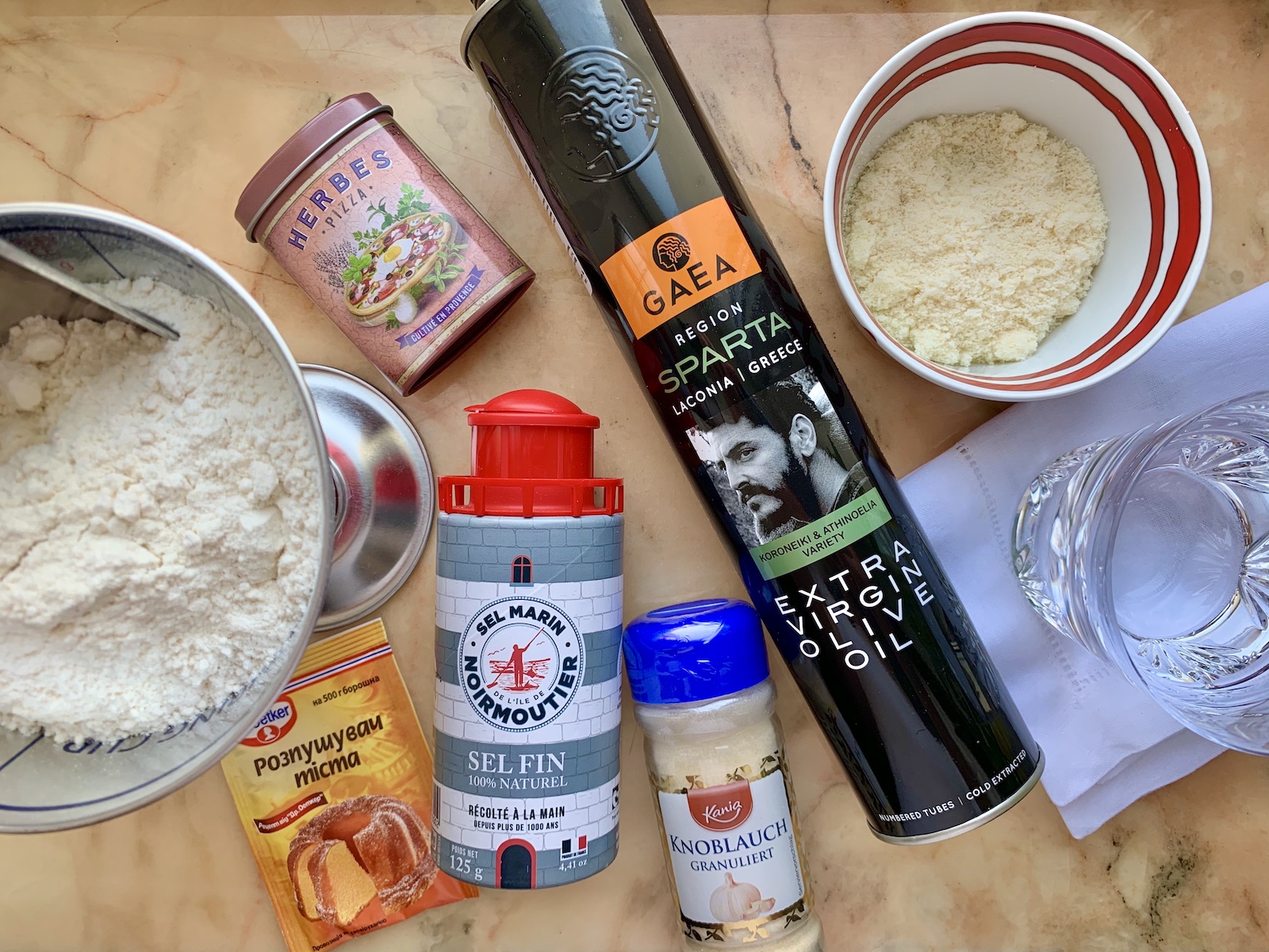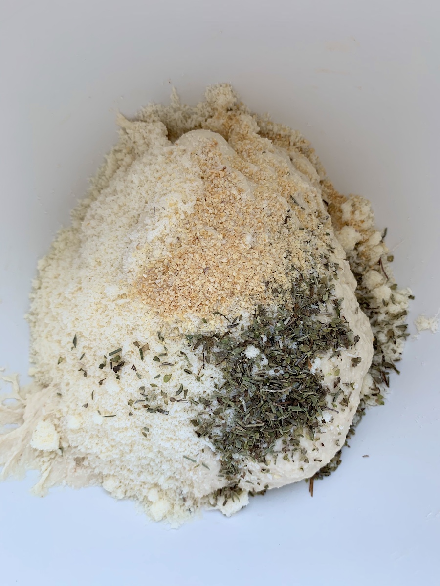 Итак, на 6 порций берем: 330-380 г муки, 180 мл холодной воды, 10 г пекарского порошка, 7 г сахара, 12 г соли, 25 мл оливкового масла, по одной столовой ложке смеси сушеных трав (чабер, тимьян, розмарин, орегано), натертого пармезана и сушеного чеснока.