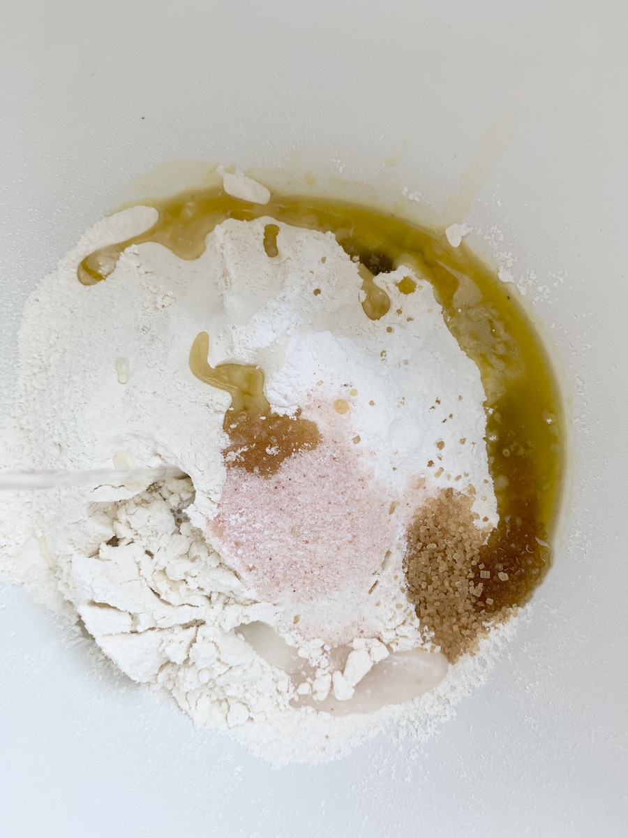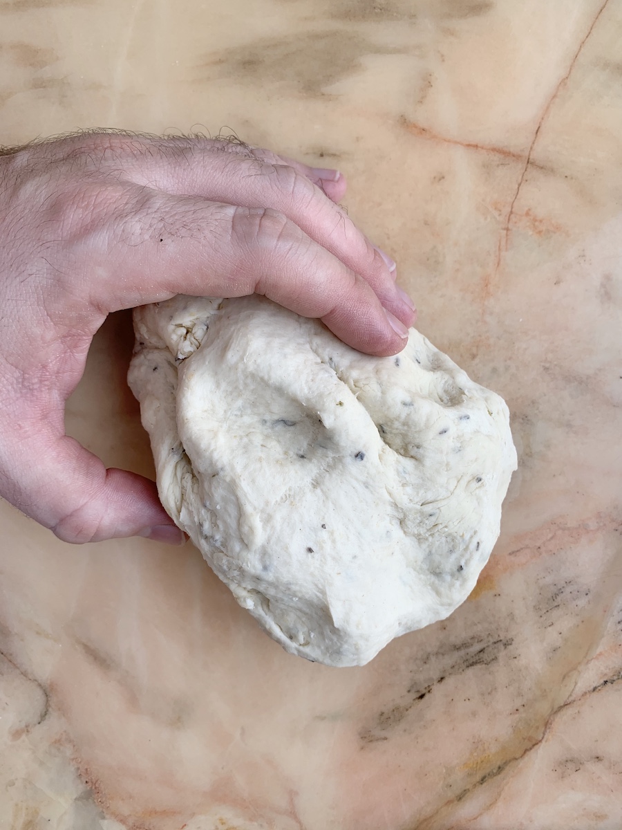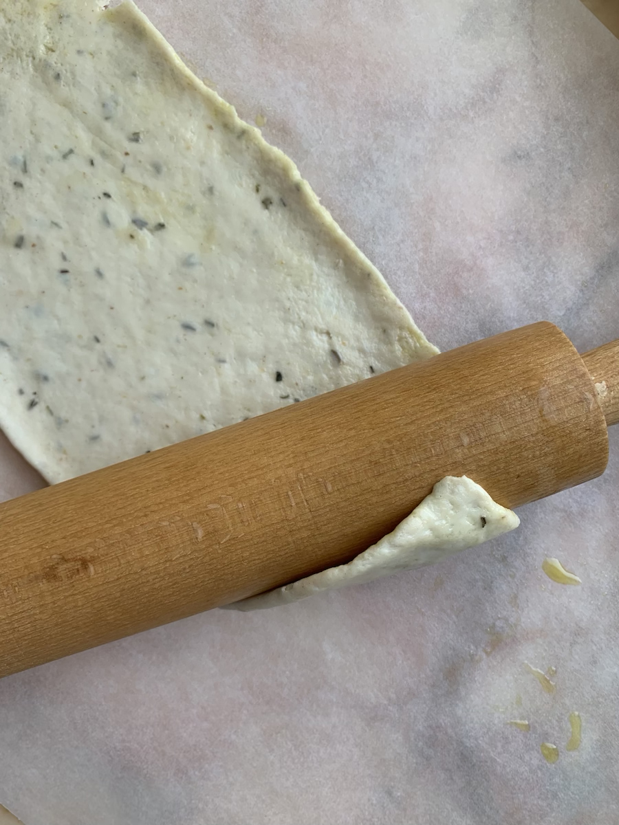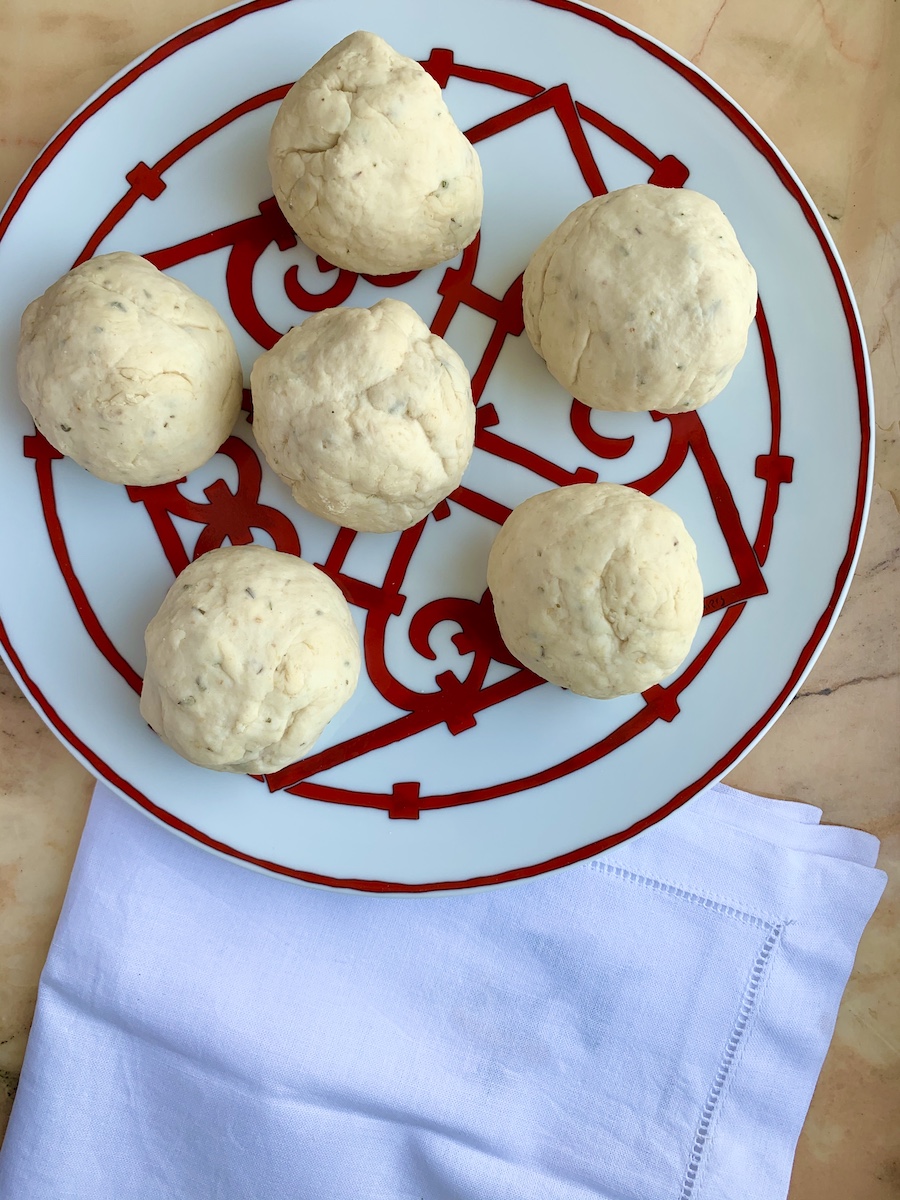 Итак, на 6 порций берем: 330-380 г муки, 180 мл холодной воды, 10 г пекарского порошка, 7 г сахара, 12 г соли, 25 мл оливкового масла, по одной столовой ложке смеси сушеных трав (чабер, тимьян, розмарин, орегано), натертого пармезана и сушеного чеснока.