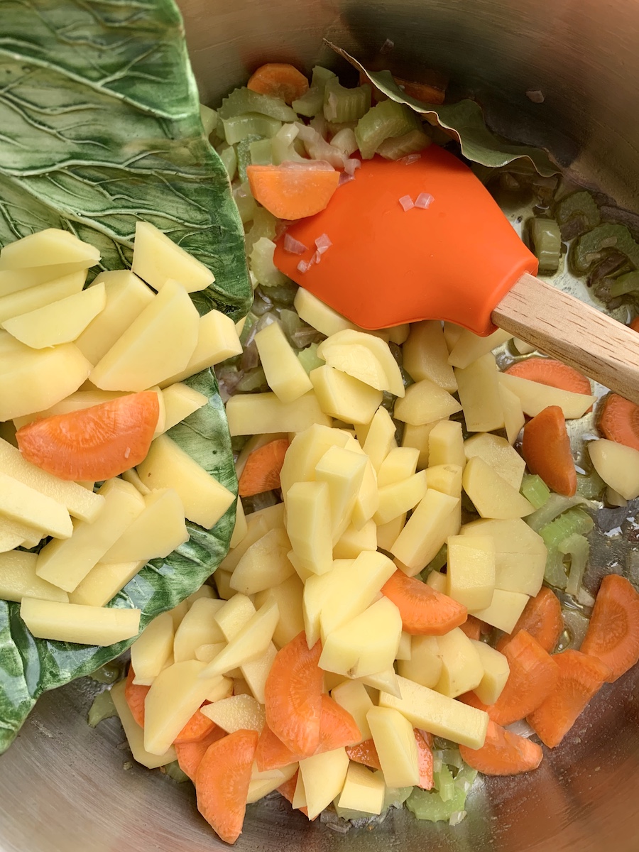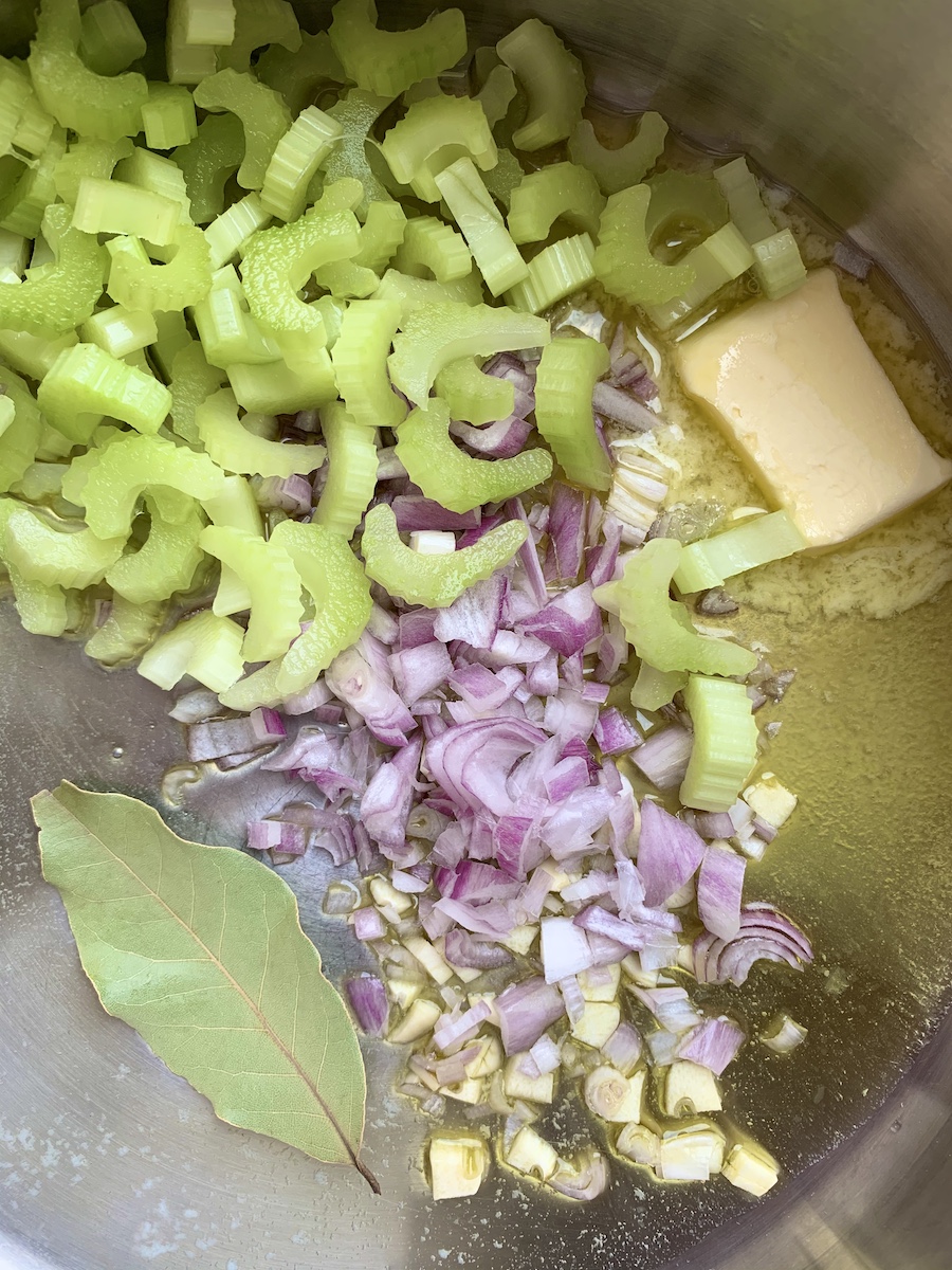В кастрюле разогреть сливочное и оливковое масло, пассировать мелко нарезанные шалот, чеснок, сельдерей и целый лавровый лист на среднем огне в течение 5 минут. Тем временем очистить картофель и морковь, помыть, нарезать небольшими кусочками и отправить в кастрюлю. Постоянно помешивая, прогревать 5 минут. Залить овощи кипятком (1,5 литра), доводить до кипения на среднем огне.