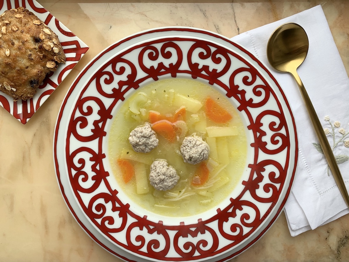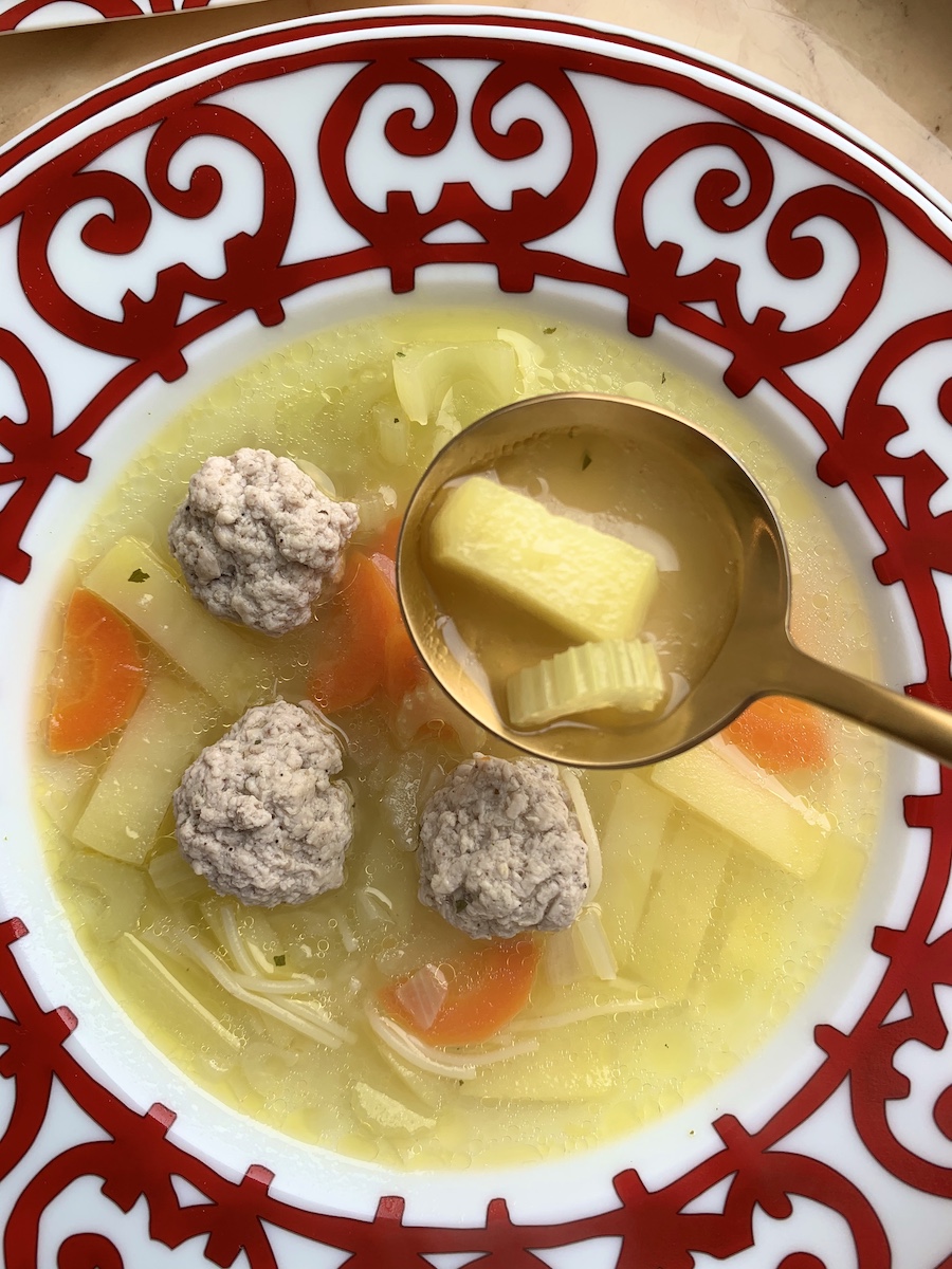 Итак, на 1,5 литра супа берем 1 среднюю морковь, 4-6 небольших картофелины, 3 стебля сельдерея, 1 лук-шалот, 1 зубок чеснока, горсть вермишели, 20 г сливочного масла, 20 мл оливкового масла, соль, свежемолотый перец, 1 лавровый лист и приправы для супа (по вкусу), 200 г любого мяса для фрикаделек (у меня - телятина).