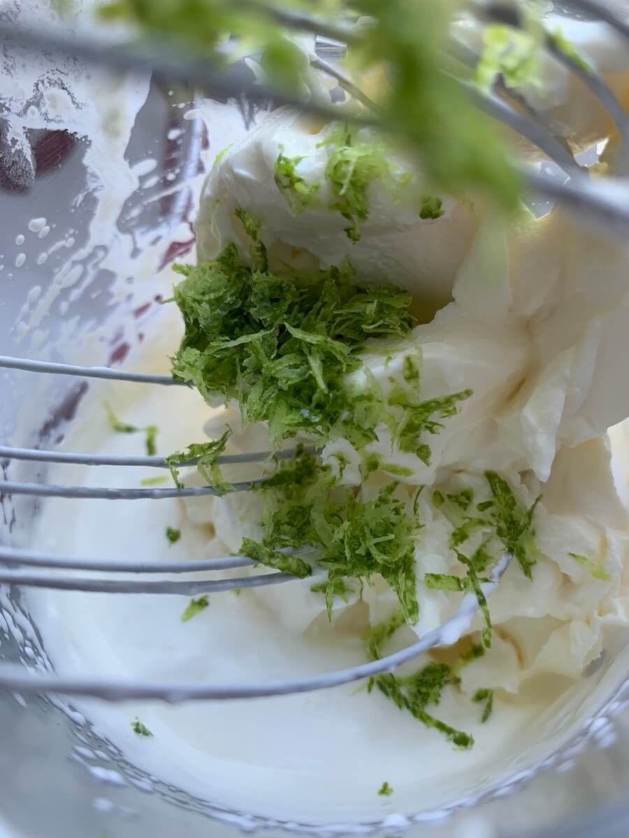 Для крема взбить сливки, добавить к ним маскарпоне, сок и цедру половины лайма, сахарную пудру, снова взбить. Густо намазать кремом верх пирога и посыпать грецкими орехами. При желании можно разрезать пирог на коржи и смазать их кремом.