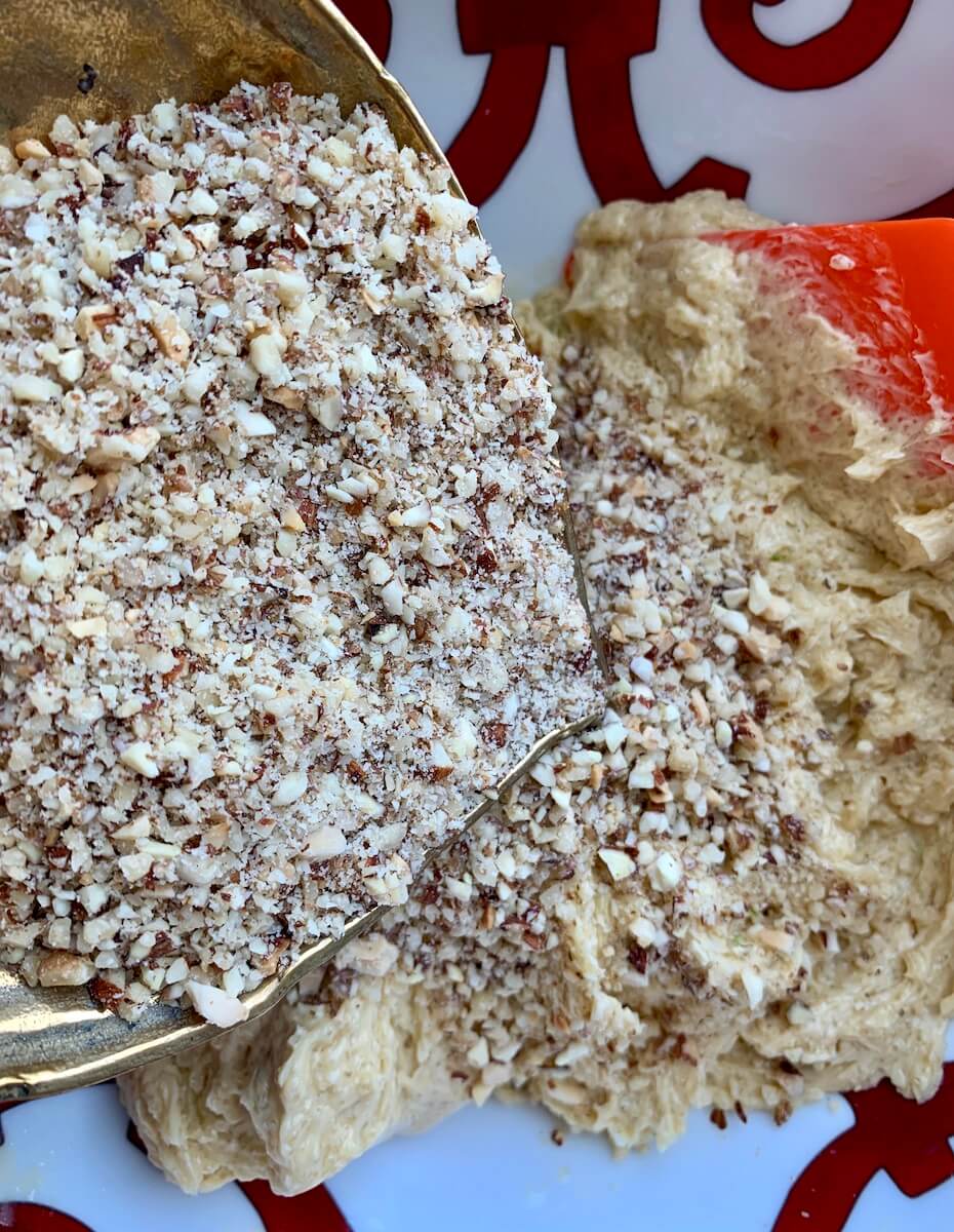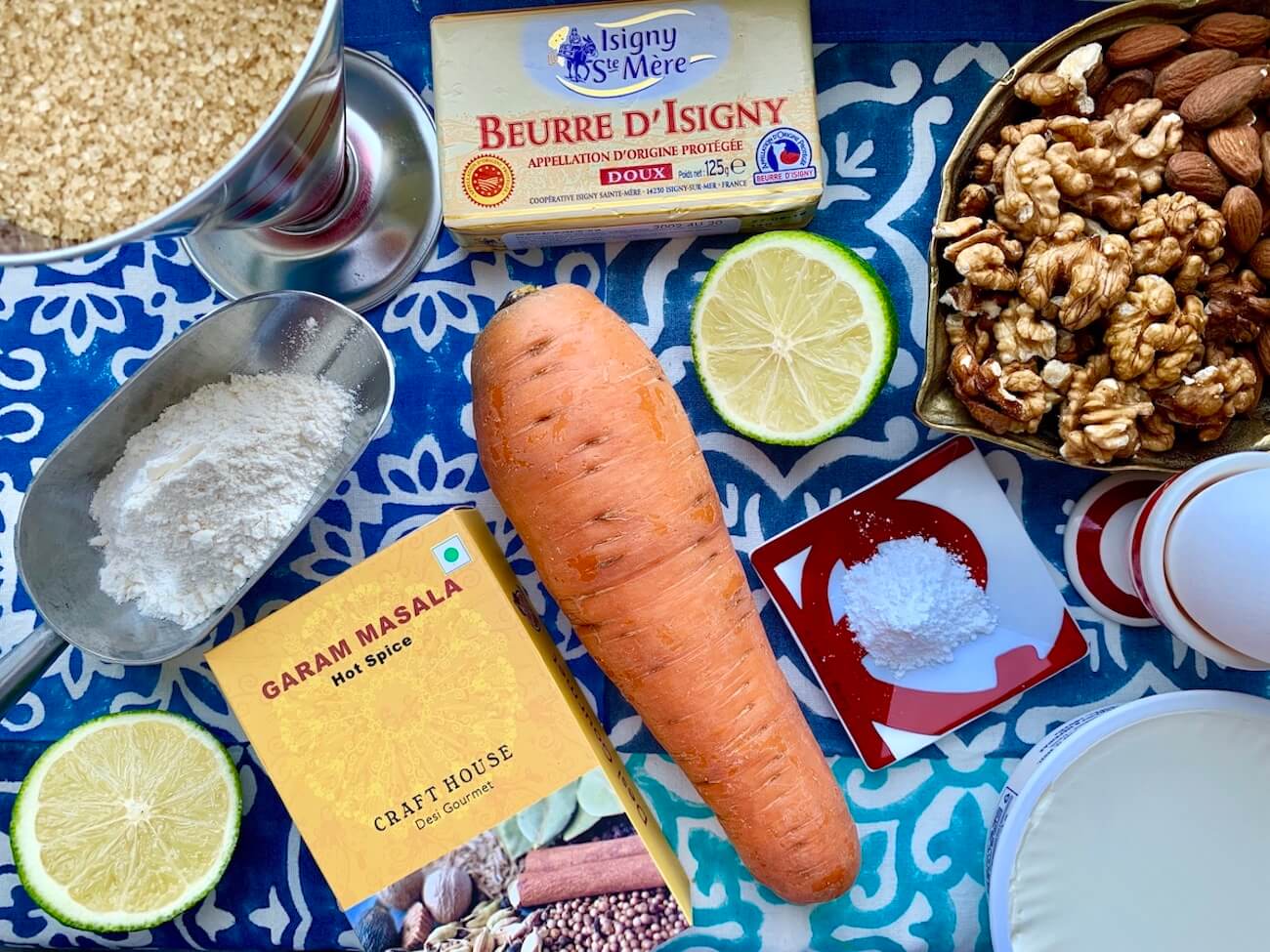 Итак, для теста берем 300 г размягченного сливочного масла, 250 г тростникового сахара, 5 крупных яиц, цедру и сок 1/2 лайма, 170 г муки, 5 г пекарского порошка, 120 г молотого миндаля, 120 г молотых грецких орехов, 1 ч.л. с горкой молотой корицы, 1 ч.л. молотого имбиря, щепотку молотого мускатного ореха, 1 ч.л. масалы (индийской смеси), 300 г моркови. Для крема: 150 г маскарпоне, 200 г сливок жирностью 33%, сок и цедра ½ лайма, 2 столовые ложки сахарной пудры, горсть нарубленных грецких орехов для подачи.