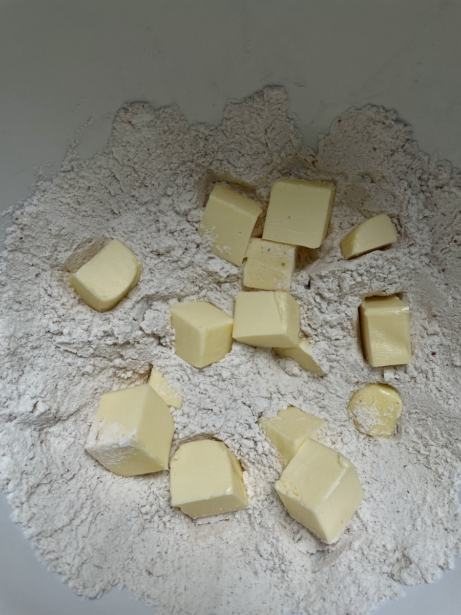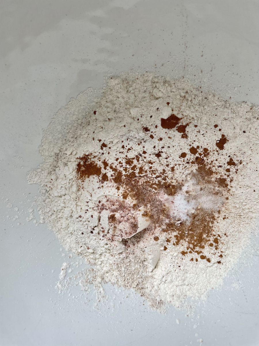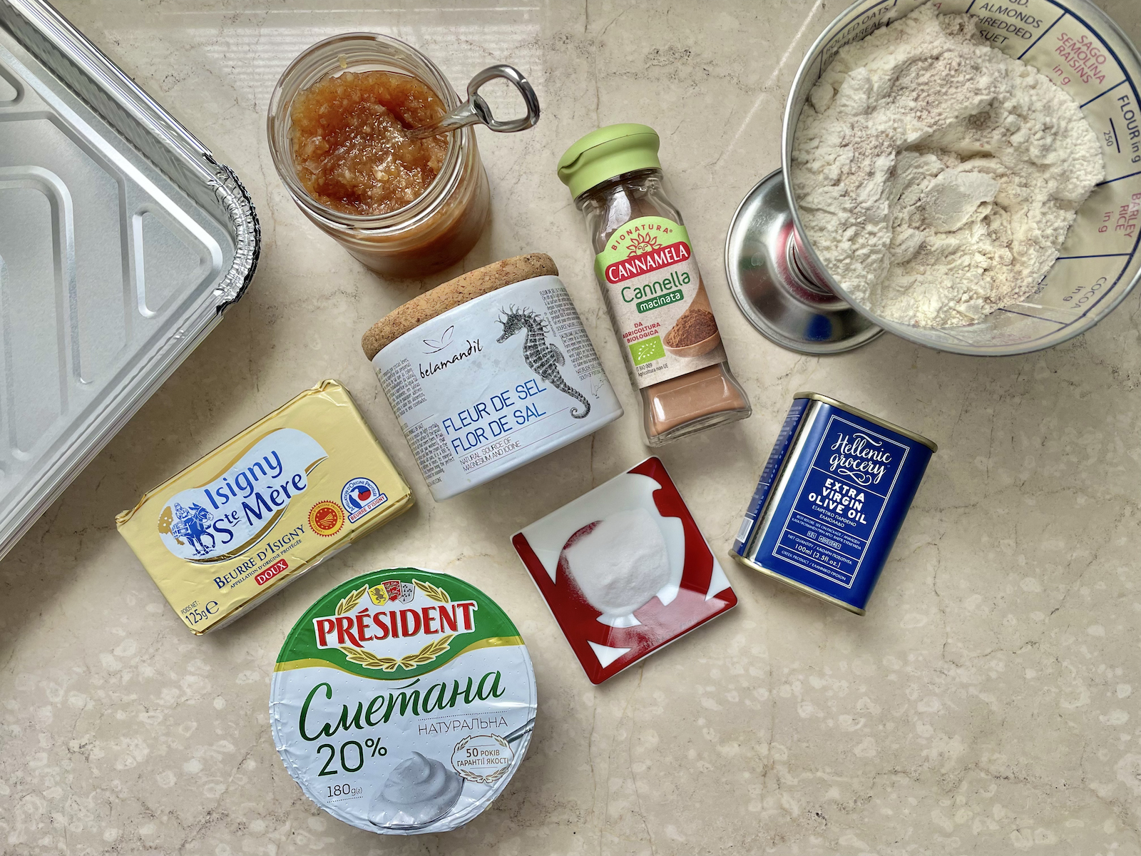 Итак, берем 100 г обычной и 100 г цельнозерновой муки, ¼ чайной ложки соды, ¼ чайной ложки соли, 1 чайную ложку молотой корицы, 100 г холодного сливочного масла, 100 г сметаны, 1 столовую ложку растительного масла. Для начинки у меня оказалась банка домашнего мармелада из лайма и лимона с небольшим добавлением сахара. Для подачи можно добавить сахарную пудру.