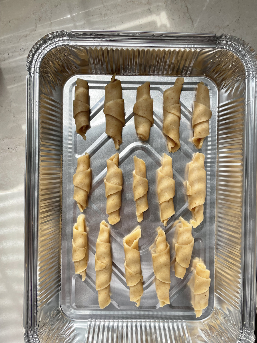 Духовку разогреть до 185 градусов. В чаше комбайна смешать муку, соду, соль и корицу, перемешать. Добавить нарезанное кубиками масло, перемешивать все до состояния мокрой крошки. Добавить сметану и растительное масло, снова перемешать. Готовое тесто разделить на 6 частей и скатать шарики. Каждый шарик тонко раскатать в круг (толщиной 1-2 мм), разрезать ножом на 6 сегментов. На широкий край положить немного начинки и скатать рогалик, выложить в форму для запекания.