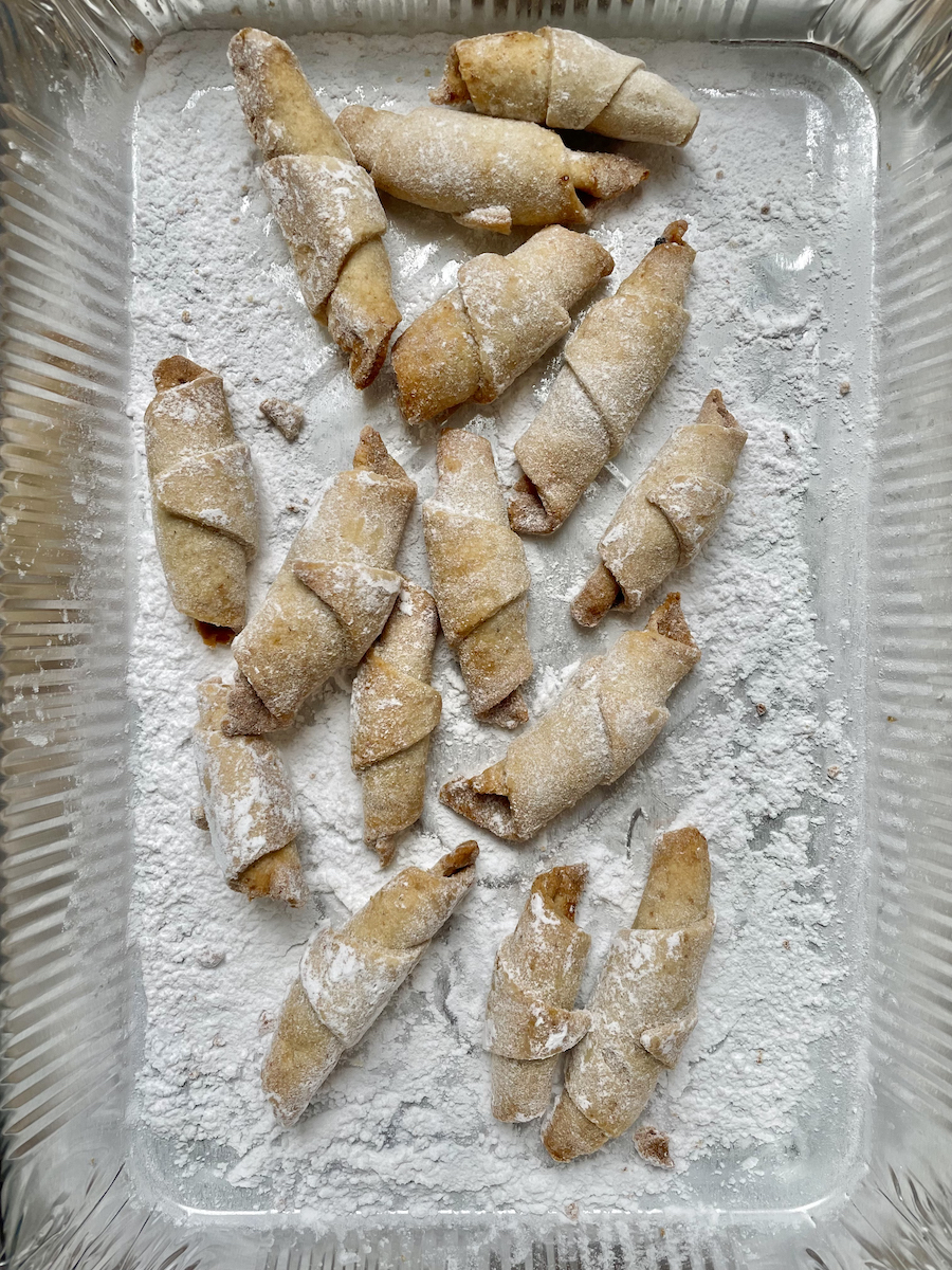 По мере приготовления рекомендую остальные шарики держать в холодильнике. Заполненную форму отправить в духовку на 15 минут. Дать рогаликами немного остыть, присыпать их сахарной пудрой и встряхнуть, чтобы они равномерно ею покрылись. Немедленно подать.