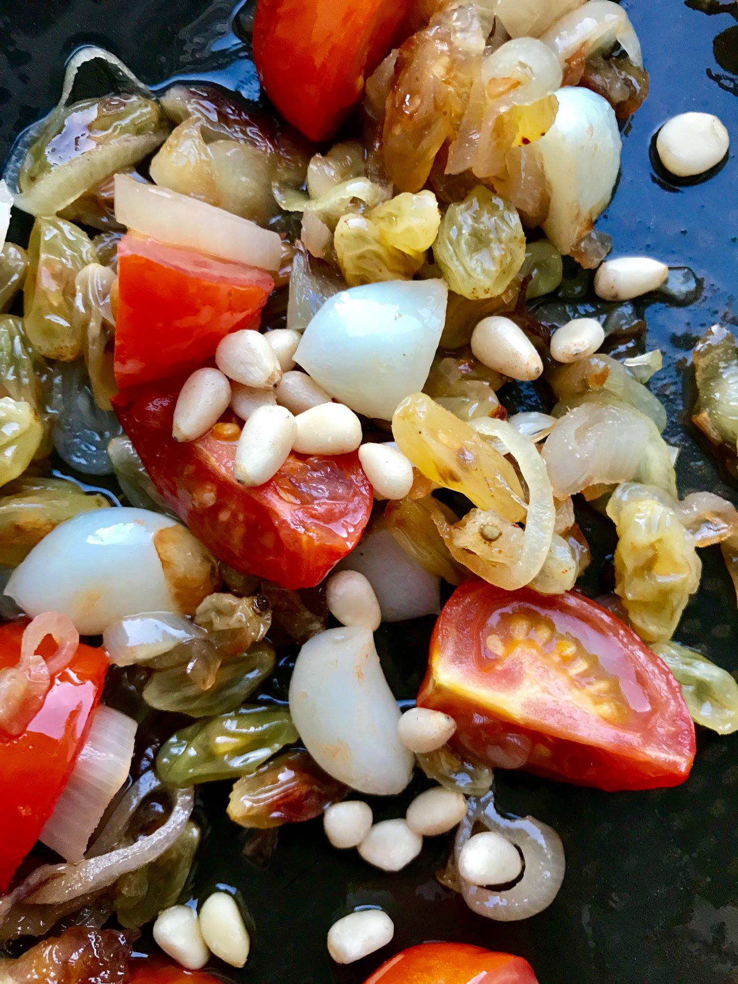 Лук порезать кольцами, обжаривать на оливковом масле 5 минут, далее добавить целые зубки чеснока, обжаривать еще минуту, затем добавить разрезанные на 4 части помидоры, маслины, изюм, орешки и листики мяты. Перемешивать все в течение 3 минут.
