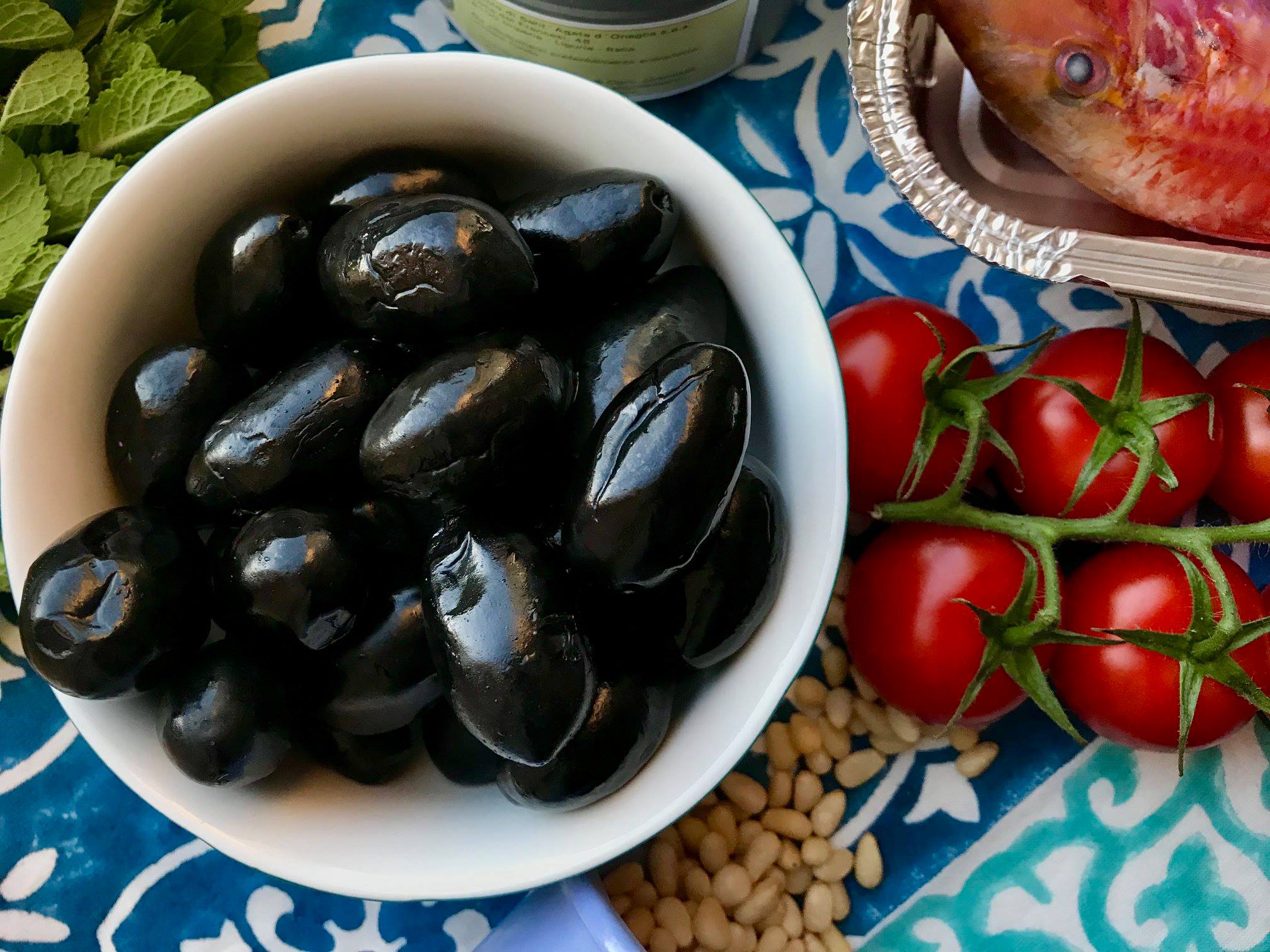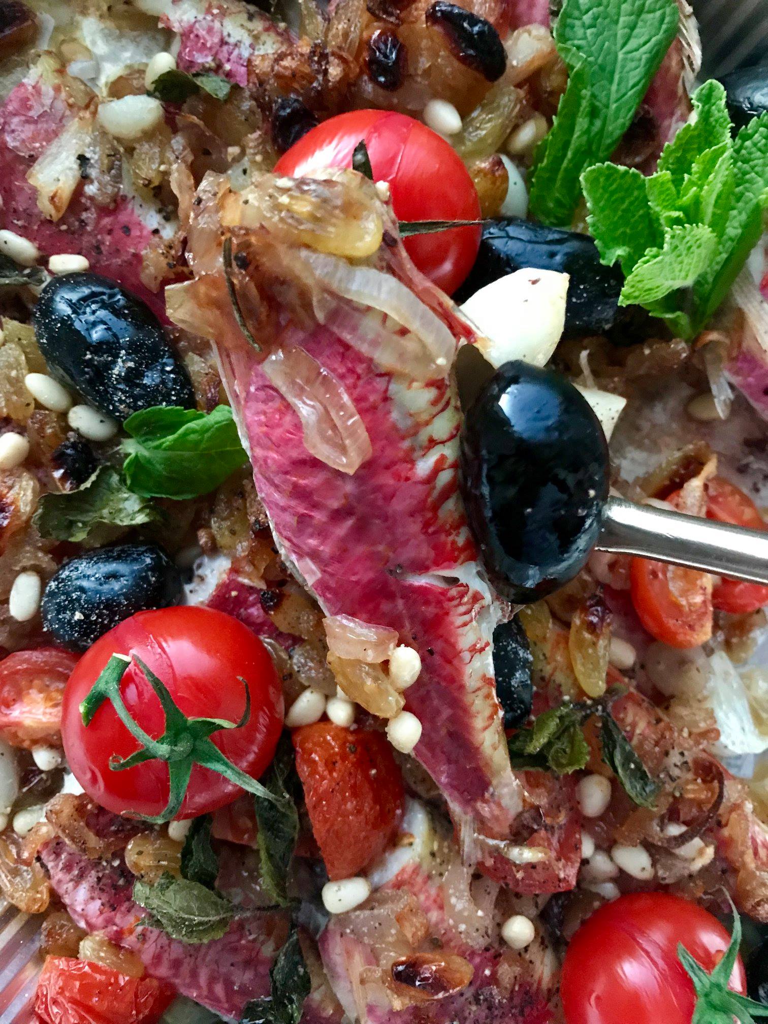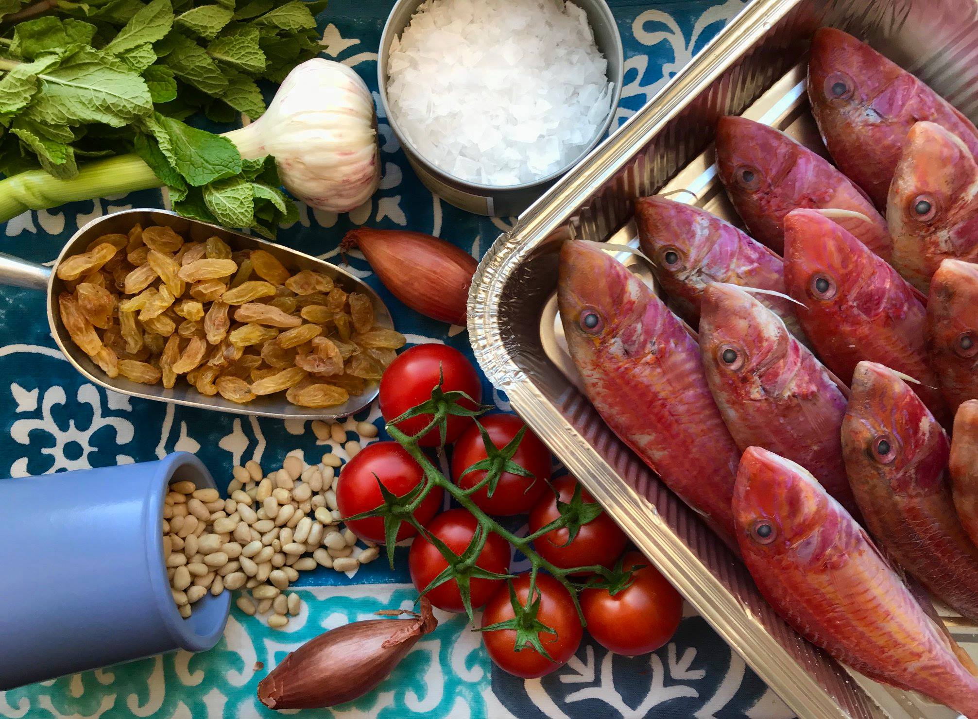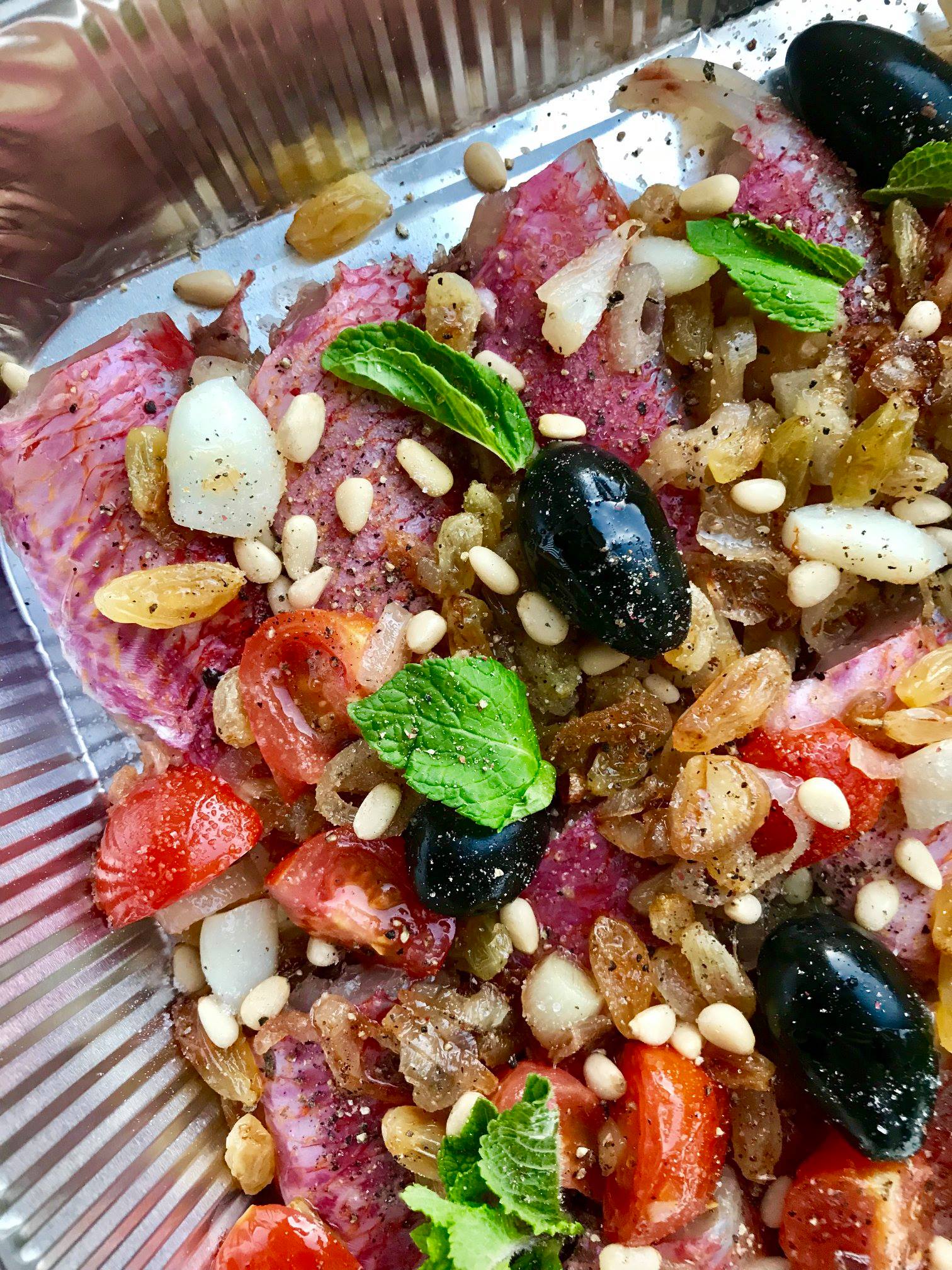 Итак, берем килограмм барабульки, потрошим и убираем чешую. Для соуса: 5 луковиц-шалот, головка чеснока, оливковое масло, 10 помидоров черри, горсть изюма (предварительно залить кипятком), горсть кедровых орешков, горсть крупных маслин, крупная соль, свежемолотый перец и пучок мяты.